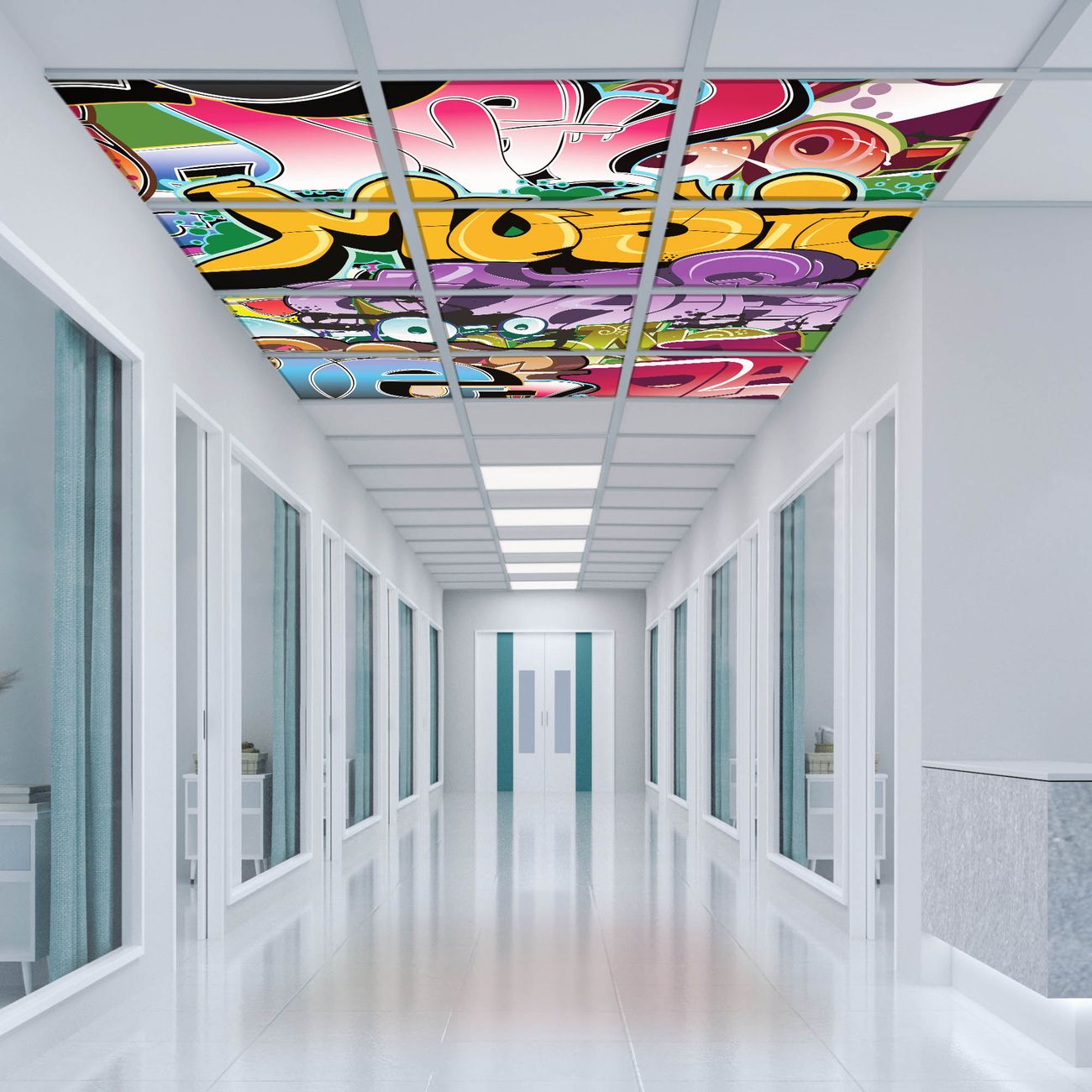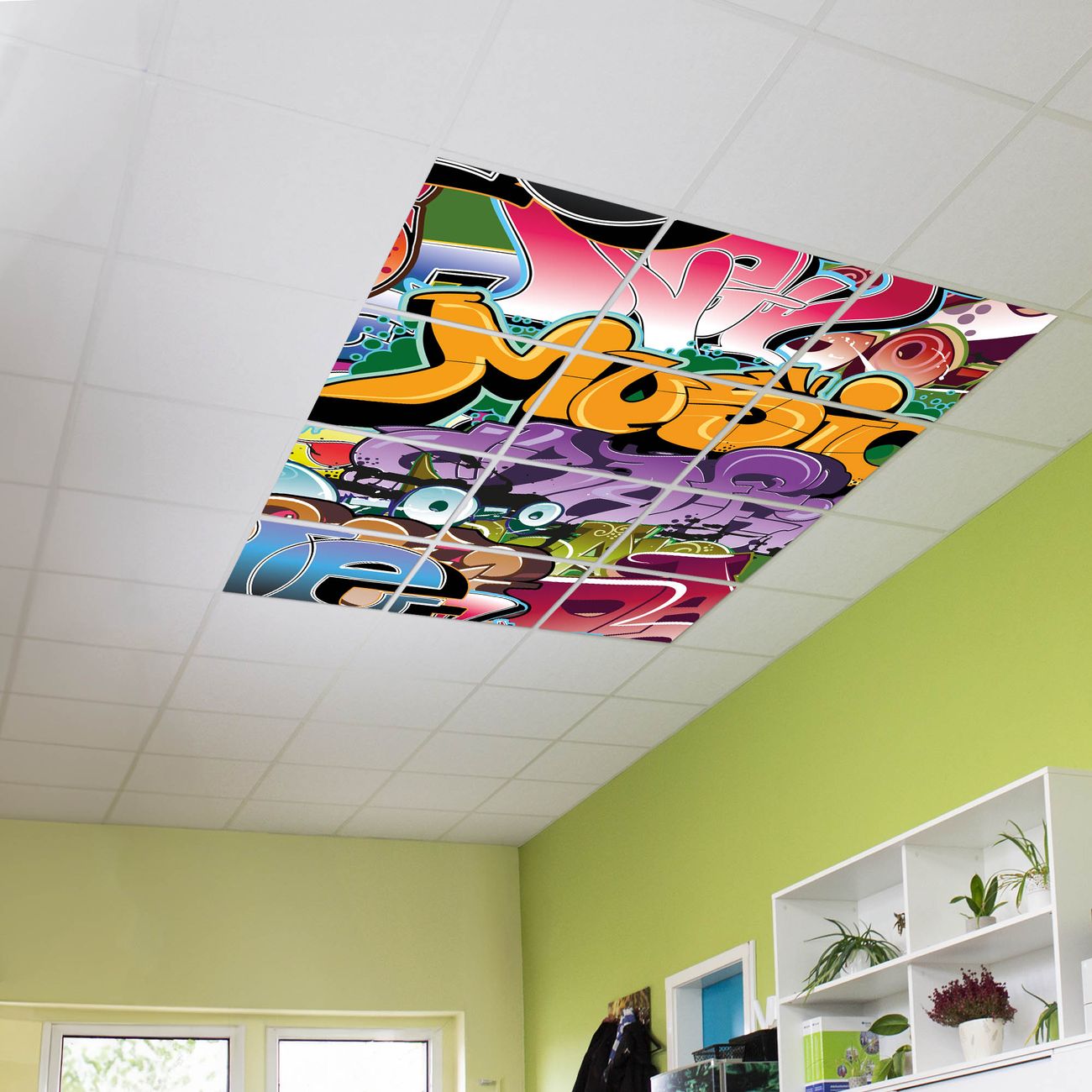 Entdecken Sie unsere vielseitigen Lichtdecken, hier in der Größe 186 x 248cm mit dem Motiv Motiv Graffiti - Ihre Beleuchtungslösung für jede Umgebung Beleuchten Sie Ihren Raum nicht nur, sondern schaffen Sie Atmosphäre! Die banjado Lichtdecke verwandelt jeden Ort, ob zu Hause, in Praxen, Büros oder Studios in eine Wohlfühloase. Unsere einzelnen Elemente haben eine genormte Einheitsgröße von 62 x 62cm und können somit in jede gängige Rasterdecken verbaut werden. So finden Sie Ihre passende Ausführung: Gern helfen wir Ihnen, die passende Ausführung zu wählen. Hierfür muss die aktuelle Gegebenheit Ihrer Decke oder Wand beachtet werden. Haben Sie bereits eine Rasterdecke (auch Odenwalddecke genannt)? Hier bestellen Sie lediglich das Motiv + Beleuchtungspanel, denn beides wird in die bereits vorhandene Decke eingelegt. Haben Sie eine glatte Decke mit Lichtauslass oder möchten die Lichtdecke an der Wand befestigen? Hier bestellen Sie bitte Motiv + Beleuchtungspanel + Deckenbefestigung, eine Aufbauanleitung liegt immer bei. Die Lichtdecke kann sowohl an der Decke als auch an der Wand montiert werden, perfekt für kreative Lichtakzente oder alternative Beleuchtungslösungen. Haben Sie bereits eine Lichtdecke und möchten nur das Motiv wechseln? Hier bestellen Sie bitte nur Motiv, der Wechsel ist denkbar einfach. Der Aufbau Ihrer banjado Lichtdecke gestaltet sich unkompliziert, dank einer verständlichen Anleitung, die Ihnen Schritt für Schritt durch den Montageprozess hilft. Für die endgültige Installation und den sicheren Anschluss empfehlen wir die Hinzuziehung eines Fachmanns, um die optimale Funktion und Sicherheit Ihrer Beleuchtung zu gewährleisten. Falls Sie einen Fachmann für die Installation benötigen, geben Sie uns gern Bescheid, wir vermitteln Ihnen gern einen geeigneten Ansprechpartner aus Ihrer Nähe. Steuerung: Steigern Sie Ihr Beleuchtungserlebnis mit der nahtlosen Integration in Ihr Smart Home. Durch die Kompatibilität mit der SmartLife App, Alexa und Google Assistant wird Ihr Smartphone zur zentralen Steuerungseinheit. Ihr Handy fungiert hierbei sozusagen als Fernbedienung. Legen Sie individuelle Lichtszenen in der App fest, die bei Aktivierung über den Wand-Ein-/Ausschalter immer wieder abgerufen werden können ohne Handy. Mit der Szenenfunktion in der Smart App können Sie die Beleuchtung personalisieren und steuern, sodass sie auf Ihre individuellen Bedürfnisse, Tagesrhythmus und Stimmung zugeschnitten ist. Beispielsweise können Sie sich in der Morgendämmerung durch ein sanftes Licht wecken lassen oder das Licht der Praxis werktags um 7 Uhr automatisch einschalten lassen. Dieses kann dann natürlich auch zu einer bestimmten Zeit automatisch ausgeschaltet werden. Motivwahl: Diese einzigartige Lichtdecke zeichnet sich durch ihre Fähigkeit aus, die Lichtfarbe je nach gewähltem Motiv anzupassen - ein Baum wirft ein sanftes grünes Licht, während eine Wolkendecke Ihren Raum in ein beruhigendes blaues Leuchten hüllt. Berücksichtigen Sie dies bitte bei Ihrer Motivauswahl. Sie können das Motiv jederzeit ohne großen Aufwand austauschen, ob nach Jahreszeit oder anderem Anlass, unsere Auswahl lässt kaum Wünsche offen. Wir fertigen Ihnen gern eine personalisierte Lichtdecke mit einem eigenen Motiv oder Logo oder Foto, schreiben Sie uns jederzeit an. Technische Daten: Das Motiv ist auf einer 4mm starken Acrylglas Scheibe aufgebracht, das Gesamtgewicht Ihrer Ausführung beträgt 27,1kg. Die Farbtemperatur lässt sich frei einstellen von 3000 bis 6000 Kelvin, damit können Sie stufenlos zwischen warmweiß, neutralweiß und kaltweiß wählen. Die Gesamtleistung bei Ihrer gewählten Ausführung beträgt 480W. Der Lichtstrom beträgt 3600 Lumen, die Nennspannung 230 V. Die Lichtdecke ist mit Schutzart IP20 für den Innenbereich konzipiert und sollte nicht im Nassbereich verwendet werden.