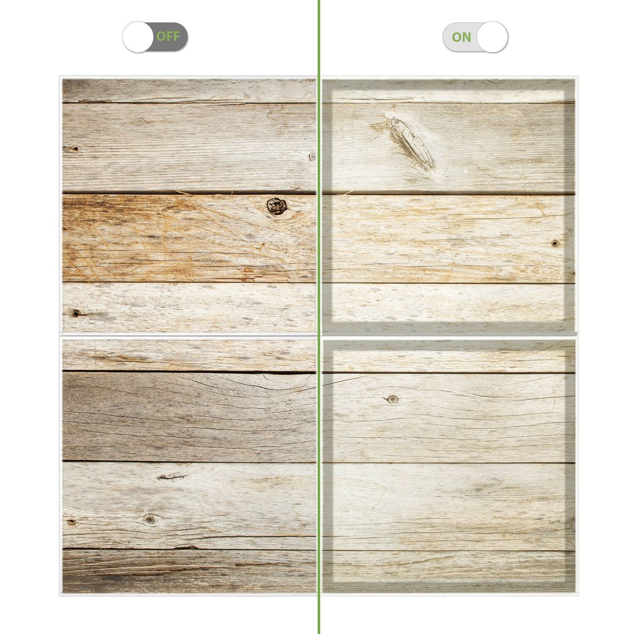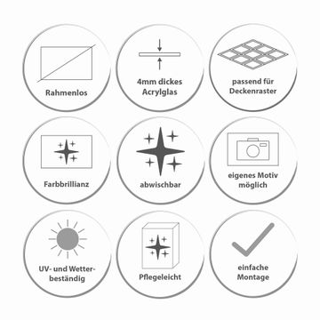 Entdecken Sie unsere vielseitigen Lichtdecken, hier in der Größe 124 x 124cm mit dem Motiv Motiv Graues Holz - Ihre Beleuchtungslösung für jede Umgebung Beleuchten Sie Ihren Raum nicht nur, sondern schaffen Sie Atmosphäre! Die banjado Lichtdecke verwandelt jeden Ort, ob zu Hause, in Praxen, Büros oder Studios in eine Wohlfühloase. Unsere einzelnen Elemente haben eine genormte Einheitsgröße von 62 x 62cm und können somit in jede gängige Rasterdecken verbaut werden. So finden Sie Ihre passende Ausführung: Gern helfen wir Ihnen, die passende Ausführung zu wählen. Hierfür muss die aktuelle Gegebenheit Ihrer Decke oder Wand beachtet werden. Haben Sie bereits eine Rasterdecke (auch Odenwalddecke genannt)? Hier bestellen Sie lediglich das Motiv + Beleuchtungspanel, denn beides wird in die bereits vorhandene Decke eingelegt. Haben Sie eine glatte Decke mit Lichtauslass oder möchten die Lichtdecke an der Wand befestigen? Hier bestellen Sie bitte Motiv + Beleuchtungspanel + Deckenbefestigung, eine Aufbauanleitung liegt immer bei. Die Lichtdecke kann sowohl an der Decke als auch an der Wand montiert werden, perfekt für kreative Lichtakzente oder alternative Beleuchtungslösungen. Haben Sie bereits eine Lichtdecke und möchten nur das Motiv wechseln? Hier bestellen Sie bitte nur Motiv, der Wechsel ist denkbar einfach. Der Aufbau Ihrer banjado Lichtdecke gestaltet sich unkompliziert, dank einer verständlichen Anleitung, die Ihnen Schritt für Schritt durch den Montageprozess hilft. Für die endgültige Installation und den sicheren Anschluss empfehlen wir die Hinzuziehung eines Fachmanns, um die optimale Funktion und Sicherheit Ihrer Beleuchtung zu gewährleisten. Falls Sie einen Fachmann für die Installation benötigen, geben Sie uns gern Bescheid, wir vermitteln Ihnen gern einen geeigneten Ansprechpartner aus Ihrer Nähe. Steuerung: Steigern Sie Ihr Beleuchtungserlebnis mit der nahtlosen Integration in Ihr Smart Home. Durch die Kompatibilität mit der SmartLife App, Alexa und Google Assistant wird Ihr Smartphone zur zentralen Steuerungseinheit. Ihr Handy fungiert hierbei sozusagen als Fernbedienung. Legen Sie individuelle Lichtszenen in der App fest, die bei Aktivierung über den Wand-Ein-/Ausschalter immer wieder abgerufen werden können ohne Handy. Mit der Szenenfunktion in der Smart App können Sie die Beleuchtung personalisieren und steuern, sodass sie auf Ihre individuellen Bedürfnisse, Tagesrhythmus und Stimmung zugeschnitten ist. Beispielsweise können Sie sich in der Morgendämmerung durch ein sanftes Licht wecken lassen oder das Licht der Praxis werktags um 7 Uhr automatisch einschalten lassen. Dieses kann dann natürlich auch zu einer bestimmten Zeit automatisch ausgeschaltet werden. Motivwahl: Diese einzigartige Lichtdecke zeichnet sich durch ihre Fähigkeit aus, die Lichtfarbe je nach gewähltem Motiv anzupassen - ein Baum wirft ein sanftes grünes Licht, während eine Wolkendecke Ihren Raum in ein beruhigendes blaues Leuchten hüllt. Berücksichtigen Sie dies bitte bei Ihrer Motivauswahl. Sie können das Motiv jederzeit ohne großen Aufwand austauschen, ob nach Jahreszeit oder anderem Anlass, unsere Auswahl lässt kaum Wünsche offen. Wir fertigen Ihnen gern eine personalisierte Lichtdecke mit einem eigenen Motiv oder Logo oder Foto, schreiben Sie uns jederzeit an. Technische Daten: Das Motiv ist auf einer 4mm starken Acrylglas Scheibe aufgebracht, das Gesamtgewicht Ihrer Ausführung beträgt 9,0kg. Die Farbtemperatur lässt sich frei einstellen von 3000 bis 6000 Kelvin, damit können Sie stufenlos zwischen warmweiß, neutralweiß und kaltweiß wählen. Die Gesamtleistung bei Ihrer gewählten Ausführung beträgt 160W. Der Lichtstrom beträgt 3600 Lumen, die Nennspannung 230 V. Die Lichtdecke ist mit Schutzart IP20 für den Innenbereich konzipiert und sollte nicht im Nassbereich verwendet werden.
