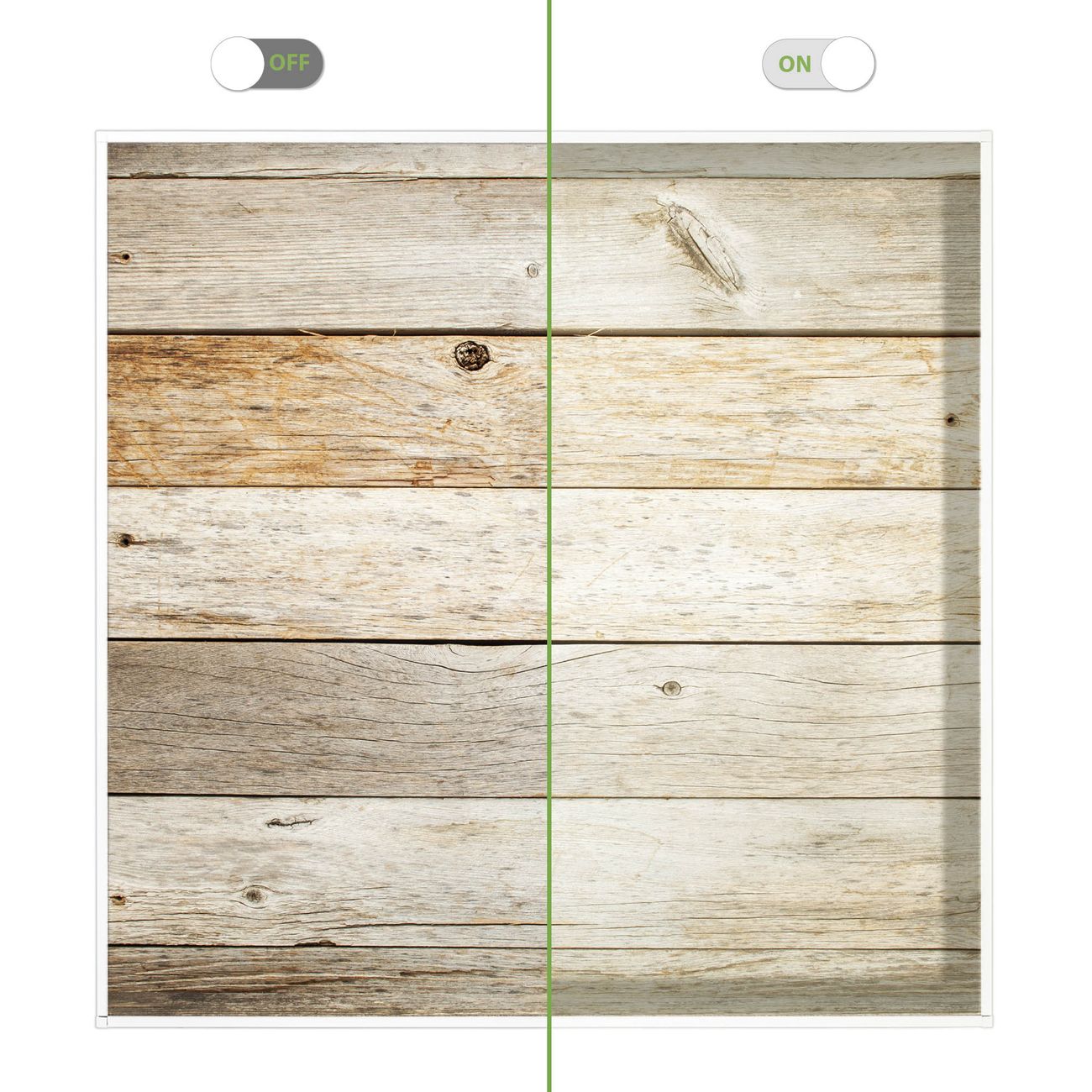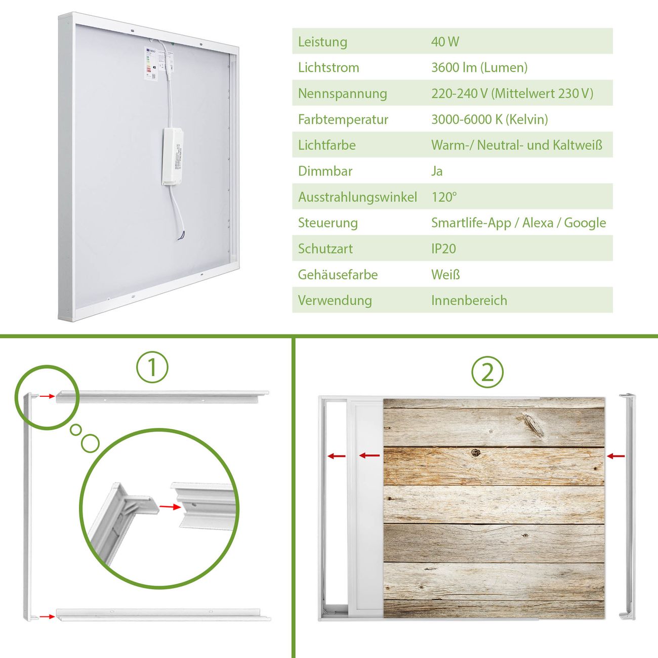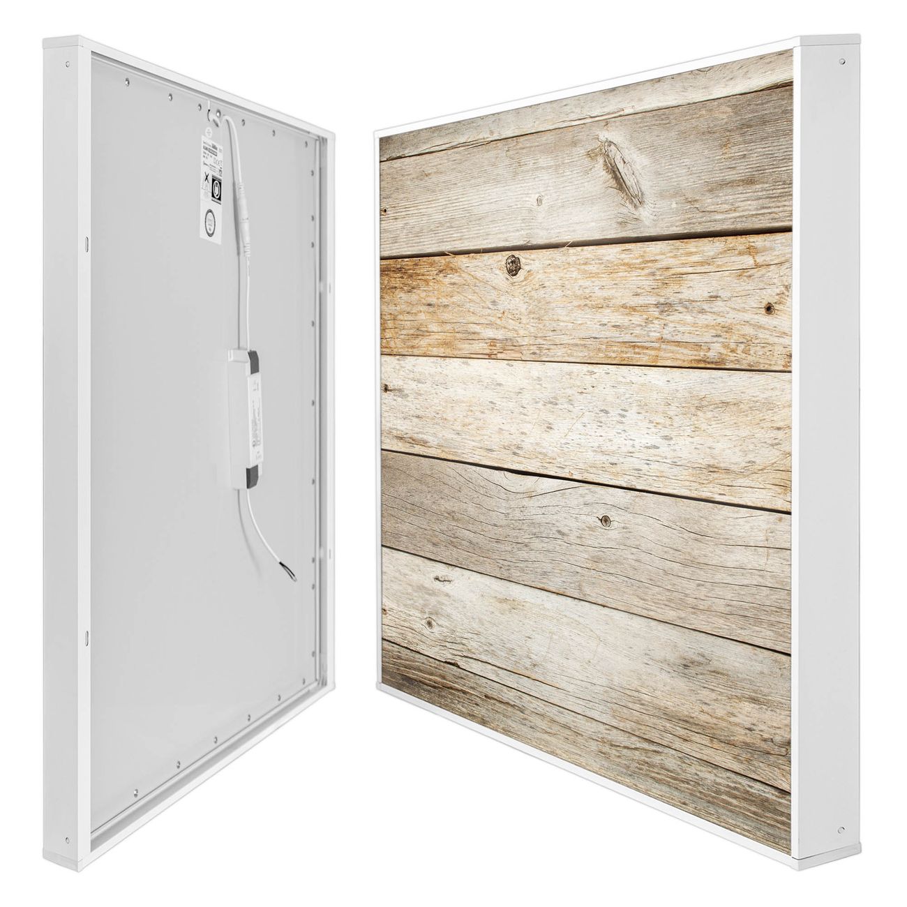 Entdecken Sie unsere vielseitigen Lichtdecken, hier in der Größe 62 x 62cm mit dem Motiv Motiv Graues Holz - Ihre Beleuchtungslösung für jede Umgebung Beleuchten Sie Ihren Raum nicht nur, sondern schaffen Sie Atmosphäre! Die banjado Lichtdecke verwandelt jeden Ort, ob zu Hause, in Praxen, Büros oder Studios in eine Wohlfühloase. Unsere einzelnen Elemente haben eine genormte Einheitsgröße von 62 x 62cm und können somit in jede gängige Rasterdecken verbaut werden. So finden Sie Ihre passende Ausführung: Gern helfen wir Ihnen, die passende Ausführung zu wählen. Hierfür muss die aktuelle Gegebenheit Ihrer Decke oder Wand beachtet werden. Haben Sie bereits eine Rasterdecke (auch Odenwalddecke genannt)? Hier bestellen Sie lediglich das Motiv + Beleuchtungspanel, denn beides wird in die bereits vorhandene Decke eingelegt. Haben Sie eine glatte Decke mit Lichtauslass oder möchten die Lichtdecke an der Wand befestigen? Hier bestellen Sie bitte Motiv + Beleuchtungspanel + Deckenbefestigung, eine Aufbauanleitung liegt immer bei. Die Lichtdecke kann sowohl an der Decke als auch an der Wand montiert werden, perfekt für kreative Lichtakzente oder alternative Beleuchtungslösungen. Haben Sie bereits eine Lichtdecke und möchten nur das Motiv wechseln? Hier bestellen Sie bitte nur Motiv, der Wechsel ist denkbar einfach. Der Aufbau Ihrer banjado Lichtdecke gestaltet sich unkompliziert, dank einer verständlichen Anleitung, die Ihnen Schritt für Schritt durch den Montageprozess hilft. Für die endgültige Installation und den sicheren Anschluss empfehlen wir die Hinzuziehung eines Fachmanns, um die optimale Funktion und Sicherheit Ihrer Beleuchtung zu gewährleisten. Falls Sie einen Fachmann für die Installation benötigen, geben Sie uns gern Bescheid, wir vermitteln Ihnen gern einen geeigneten Ansprechpartner aus Ihrer Nähe. Steuerung: Steigern Sie Ihr Beleuchtungserlebnis mit der nahtlosen Integration in Ihr Smart Home. Durch die Kompatibilität mit der SmartLife App, Alexa und Google Assistant wird Ihr Smartphone zur zentralen Steuerungseinheit. Ihr Handy fungiert hierbei sozusagen als Fernbedienung. Legen Sie individuelle Lichtszenen in der App fest, die bei Aktivierung über den Wand-Ein-/Ausschalter immer wieder abgerufen werden können ohne Handy. Mit der Szenenfunktion in der Smart App können Sie die Beleuchtung personalisieren und steuern, sodass sie auf Ihre individuellen Bedürfnisse, Tagesrhythmus und Stimmung zugeschnitten ist. Beispielsweise können Sie sich in der Morgendämmerung durch ein sanftes Licht wecken lassen oder das Licht der Praxis werktags um 7 Uhr automatisch einschalten lassen. Dieses kann dann natürlich auch zu einer bestimmten Zeit automatisch ausgeschaltet werden. Motivwahl: Diese einzigartige Lichtdecke zeichnet sich durch ihre Fähigkeit aus, die Lichtfarbe je nach gewähltem Motiv anzupassen - ein Baum wirft ein sanftes grünes Licht, während eine Wolkendecke Ihren Raum in ein beruhigendes blaues Leuchten hüllt. Berücksichtigen Sie dies bitte bei Ihrer Motivauswahl. Sie können das Motiv jederzeit ohne großen Aufwand austauschen, ob nach Jahreszeit oder anderem Anlass, unsere Auswahl lässt kaum Wünsche offen. Wir fertigen Ihnen gern eine personalisierte Lichtdecke mit einem eigenen Motiv oder Logo oder Foto, schreiben Sie uns jederzeit an. Technische Daten: Das Motiv ist auf einer 4mm starken Acrylglas Scheibe aufgebracht, das Gesamtgewicht Ihrer Ausführung beträgt 4,4kg. Die Farbtemperatur lässt sich frei einstellen von 3000 bis 6000 Kelvin, damit können Sie stufenlos zwischen warmweiß, neutralweiß und kaltweiß wählen. Die Gesamtleistung bei Ihrer gewählten Ausführung beträgt 40W. Der Lichtstrom beträgt 3600 Lumen, die Nennspannung 230 V. Die Lichtdecke ist mit Schutzart IP20 für den Innenbereich konzipiert und sollte nicht im Nassbereich verwendet werden.
