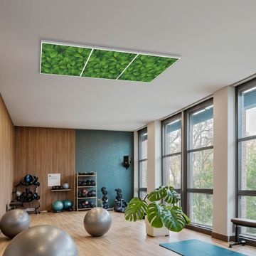 Entdecken Sie unsere vielseitigen Lichtdecken, hier in der Größe 186 x 62cm mit dem Motiv Motiv Grüne Blätter - Ihre Beleuchtungslösung für jede Umgebung Beleuchten Sie Ihren Raum nicht nur, sondern schaffen Sie Atmosphäre! Die banjado Lichtdecke verwandelt jeden Ort, ob zu Hause, in Praxen, Büros oder Studios in eine Wohlfühloase. Unsere einzelnen Elemente haben eine genormte Einheitsgröße von 62 x 62cm und können somit in jede gängige Rasterdecken verbaut werden. So finden Sie Ihre passende Ausführung: Gern helfen wir Ihnen, die passende Ausführung zu wählen. Hierfür muss die aktuelle Gegebenheit Ihrer Decke oder Wand beachtet werden. Haben Sie bereits eine Rasterdecke (auch Odenwalddecke genannt)? Hier bestellen Sie lediglich das Motiv + Beleuchtungspanel, denn beides wird in die bereits vorhandene Decke eingelegt. Haben Sie eine glatte Decke mit Lichtauslass oder möchten die Lichtdecke an der Wand befestigen? Hier bestellen Sie bitte Motiv + Beleuchtungspanel + Deckenbefestigung, eine Aufbauanleitung liegt immer bei. Die Lichtdecke kann sowohl an der Decke als auch an der Wand montiert werden, perfekt für kreative Lichtakzente oder alternative Beleuchtungslösungen. Haben Sie bereits eine Lichtdecke und möchten nur das Motiv wechseln? Hier bestellen Sie bitte nur Motiv, der Wechsel ist denkbar einfach. Der Aufbau Ihrer banjado Lichtdecke gestaltet sich unkompliziert, dank einer verständlichen Anleitung, die Ihnen Schritt für Schritt durch den Montageprozess hilft. Für die endgültige Installation und den sicheren Anschluss empfehlen wir die Hinzuziehung eines Fachmanns, um die optimale Funktion und Sicherheit Ihrer Beleuchtung zu gewährleisten. Falls Sie einen Fachmann für die Installation benötigen, geben Sie uns gern Bescheid, wir vermitteln Ihnen gern einen geeigneten Ansprechpartner aus Ihrer Nähe. Steuerung: Steigern Sie Ihr Beleuchtungserlebnis mit der nahtlosen Integration in Ihr Smart Home. Durch die Kompatibilität mit der SmartLife App, Alexa und Google Assistant wird Ihr Smartphone zur zentralen Steuerungseinheit. Ihr Handy fungiert hierbei sozusagen als Fernbedienung. Legen Sie individuelle Lichtszenen in der App fest, die bei Aktivierung über den Wand-Ein-/Ausschalter immer wieder abgerufen werden können ohne Handy. Mit der Szenenfunktion in der Smart App können Sie die Beleuchtung personalisieren und steuern, sodass sie auf Ihre individuellen Bedürfnisse, Tagesrhythmus und Stimmung zugeschnitten ist. Beispielsweise können Sie sich in der Morgendämmerung durch ein sanftes Licht wecken lassen oder das Licht der Praxis werktags um 7 Uhr automatisch einschalten lassen. Dieses kann dann natürlich auch zu einer bestimmten Zeit automatisch ausgeschaltet werden. Motivwahl: Diese einzigartige Lichtdecke zeichnet sich durch ihre Fähigkeit aus, die Lichtfarbe je nach gewähltem Motiv anzupassen - ein Baum wirft ein sanftes grünes Licht, während eine Wolkendecke Ihren Raum in ein beruhigendes blaues Leuchten hüllt. Berücksichtigen Sie dies bitte bei Ihrer Motivauswahl. Sie können das Motiv jederzeit ohne großen Aufwand austauschen, ob nach Jahreszeit oder anderem Anlass, unsere Auswahl lässt kaum Wünsche offen. Wir fertigen Ihnen gern eine personalisierte Lichtdecke mit einem eigenen Motiv oder Logo oder Foto, schreiben Sie uns jederzeit an. Technische Daten: Das Motiv ist auf einer 4mm starken Acrylglas Scheibe aufgebracht, das Gesamtgewicht Ihrer Ausführung beträgt 14,8kg. Die Farbtemperatur lässt sich frei einstellen von 3000 bis 6000 Kelvin, damit können Sie stufenlos zwischen warmweiß, neutralweiß und kaltweiß wählen. Die Gesamtleistung bei Ihrer gewählten Ausführung beträgt 120W. Der Lichtstrom beträgt 3600 Lumen, die Nennspannung 230 V. Die Lichtdecke ist mit Schutzart IP20 für den Innenbereich konzipiert und sollte nicht im Nassbereich verwendet werden.