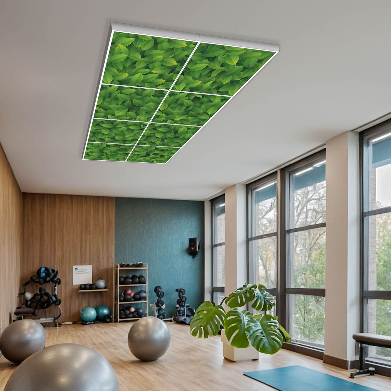 Entdecken Sie unsere vielseitigen Lichtdecken, hier in der Größe 124 x 248cm mit dem Motiv Motiv Grüne Blätter - Ihre Beleuchtungslösung für jede Umgebung Beleuchten Sie Ihren Raum nicht nur, sondern schaffen Sie Atmosphäre! Die banjado Lichtdecke verwandelt jeden Ort, ob zu Hause, in Praxen, Büros oder Studios in eine Wohlfühloase. Unsere einzelnen Elemente haben eine genormte Einheitsgröße von 62 x 62cm und können somit in jede gängige Rasterdecken verbaut werden. So finden Sie Ihre passende Ausführung: Gern helfen wir Ihnen, die passende Ausführung zu wählen. Hierfür muss die aktuelle Gegebenheit Ihrer Decke oder Wand beachtet werden. Haben Sie bereits eine Rasterdecke (auch Odenwalddecke genannt)? Hier bestellen Sie lediglich das Motiv + Beleuchtungspanel, denn beides wird in die bereits vorhandene Decke eingelegt. Haben Sie eine glatte Decke mit Lichtauslass oder möchten die Lichtdecke an der Wand befestigen? Hier bestellen Sie bitte Motiv + Beleuchtungspanel + Deckenbefestigung, eine Aufbauanleitung liegt immer bei. Die Lichtdecke kann sowohl an der Decke als auch an der Wand montiert werden, perfekt für kreative Lichtakzente oder alternative Beleuchtungslösungen. Haben Sie bereits eine Lichtdecke und möchten nur das Motiv wechseln? Hier bestellen Sie bitte nur Motiv, der Wechsel ist denkbar einfach. Der Aufbau Ihrer banjado Lichtdecke gestaltet sich unkompliziert, dank einer verständlichen Anleitung, die Ihnen Schritt für Schritt durch den Montageprozess hilft. Für die endgültige Installation und den sicheren Anschluss empfehlen wir die Hinzuziehung eines Fachmanns, um die optimale Funktion und Sicherheit Ihrer Beleuchtung zu gewährleisten. Falls Sie einen Fachmann für die Installation benötigen, geben Sie uns gern Bescheid, wir vermitteln Ihnen gern einen geeigneten Ansprechpartner aus Ihrer Nähe. Steuerung: Steigern Sie Ihr Beleuchtungserlebnis mit der nahtlosen Integration in Ihr Smart Home. Durch die Kompatibilität mit der SmartLife App, Alexa und Google Assistant wird Ihr Smartphone zur zentralen Steuerungseinheit. Ihr Handy fungiert hierbei sozusagen als Fernbedienung. Legen Sie individuelle Lichtszenen in der App fest, die bei Aktivierung über den Wand-Ein-/Ausschalter immer wieder abgerufen werden können ohne Handy. Mit der Szenenfunktion in der Smart App können Sie die Beleuchtung personalisieren und steuern, sodass sie auf Ihre individuellen Bedürfnisse, Tagesrhythmus und Stimmung zugeschnitten ist. Beispielsweise können Sie sich in der Morgendämmerung durch ein sanftes Licht wecken lassen oder das Licht der Praxis werktags um 7 Uhr automatisch einschalten lassen. Dieses kann dann natürlich auch zu einer bestimmten Zeit automatisch ausgeschaltet werden. Motivwahl: Diese einzigartige Lichtdecke zeichnet sich durch ihre Fähigkeit aus, die Lichtfarbe je nach gewähltem Motiv anzupassen - ein Baum wirft ein sanftes grünes Licht, während eine Wolkendecke Ihren Raum in ein beruhigendes blaues Leuchten hüllt. Berücksichtigen Sie dies bitte bei Ihrer Motivauswahl. Sie können das Motiv jederzeit ohne großen Aufwand austauschen, ob nach Jahreszeit oder anderem Anlass, unsere Auswahl lässt kaum Wünsche offen. Wir fertigen Ihnen gern eine personalisierte Lichtdecke mit einem eigenen Motiv oder Logo oder Foto, schreiben Sie uns jederzeit an. Technische Daten: Das Motiv ist auf einer 4mm starken Acrylglas Scheibe aufgebracht, das Gesamtgewicht Ihrer Ausführung beträgt 39,4kg. Die Farbtemperatur lässt sich frei einstellen von 3000 bis 6000 Kelvin, damit können Sie stufenlos zwischen warmweiß, neutralweiß und kaltweiß wählen. Die Gesamtleistung bei Ihrer gewählten Ausführung beträgt 320W. Der Lichtstrom beträgt 3600 Lumen, die Nennspannung 230 V. Die Lichtdecke ist mit Schutzart IP20 für den Innenbereich konzipiert und sollte nicht im Nassbereich verwendet werden.