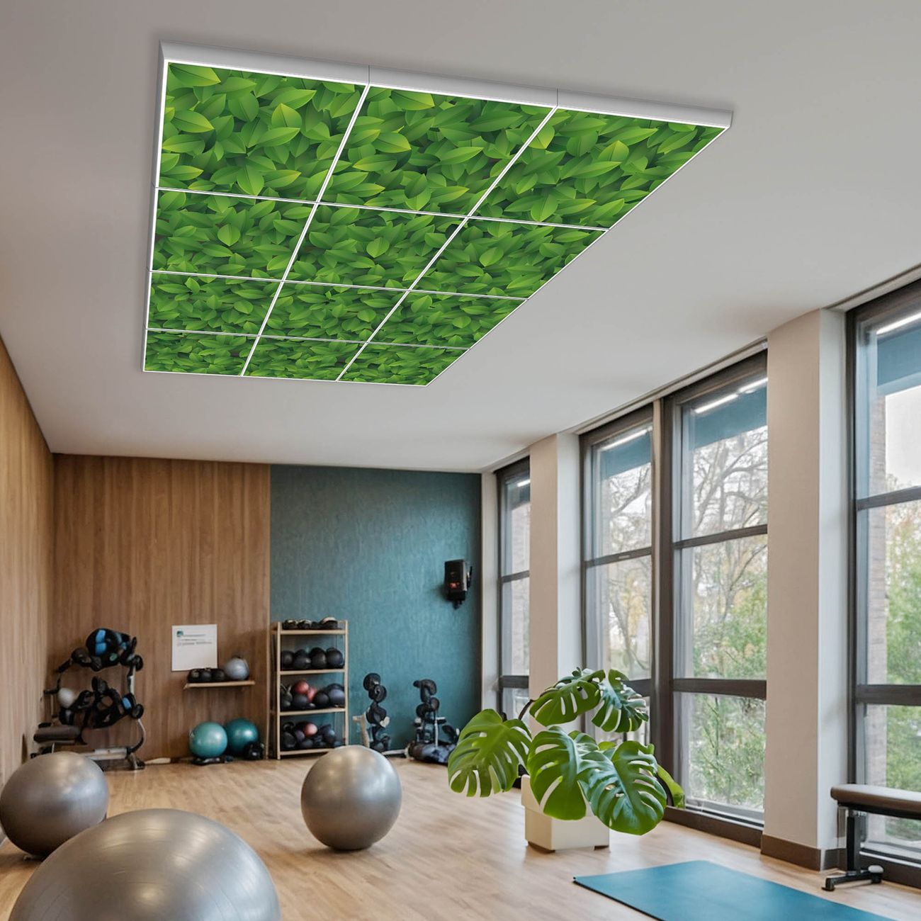 Entdecken Sie unsere vielseitigen Lichtdecken, hier in der Größe 186 x 248cm mit dem Motiv Motiv Grüne Blätter - Ihre Beleuchtungslösung für jede Umgebung Beleuchten Sie Ihren Raum nicht nur, sondern schaffen Sie Atmosphäre! Die banjado Lichtdecke verwandelt jeden Ort, ob zu Hause, in Praxen, Büros oder Studios in eine Wohlfühloase. Unsere einzelnen Elemente haben eine genormte Einheitsgröße von 62 x 62cm und können somit in jede gängige Rasterdecken verbaut werden. So finden Sie Ihre passende Ausführung: Gern helfen wir Ihnen, die passende Ausführung zu wählen. Hierfür muss die aktuelle Gegebenheit Ihrer Decke oder Wand beachtet werden. Haben Sie bereits eine Rasterdecke (auch Odenwalddecke genannt)? Hier bestellen Sie lediglich das Motiv + Beleuchtungspanel, denn beides wird in die bereits vorhandene Decke eingelegt. Haben Sie eine glatte Decke mit Lichtauslass oder möchten die Lichtdecke an der Wand befestigen? Hier bestellen Sie bitte Motiv + Beleuchtungspanel + Deckenbefestigung, eine Aufbauanleitung liegt immer bei. Die Lichtdecke kann sowohl an der Decke als auch an der Wand montiert werden, perfekt für kreative Lichtakzente oder alternative Beleuchtungslösungen. Haben Sie bereits eine Lichtdecke und möchten nur das Motiv wechseln? Hier bestellen Sie bitte nur Motiv, der Wechsel ist denkbar einfach. Der Aufbau Ihrer banjado Lichtdecke gestaltet sich unkompliziert, dank einer verständlichen Anleitung, die Ihnen Schritt für Schritt durch den Montageprozess hilft. Für die endgültige Installation und den sicheren Anschluss empfehlen wir die Hinzuziehung eines Fachmanns, um die optimale Funktion und Sicherheit Ihrer Beleuchtung zu gewährleisten. Falls Sie einen Fachmann für die Installation benötigen, geben Sie uns gern Bescheid, wir vermitteln Ihnen gern einen geeigneten Ansprechpartner aus Ihrer Nähe. Steuerung: Steigern Sie Ihr Beleuchtungserlebnis mit der nahtlosen Integration in Ihr Smart Home. Durch die Kompatibilität mit der SmartLife App, Alexa und Google Assistant wird Ihr Smartphone zur zentralen Steuerungseinheit. Ihr Handy fungiert hierbei sozusagen als Fernbedienung. Legen Sie individuelle Lichtszenen in der App fest, die bei Aktivierung über den Wand-Ein-/Ausschalter immer wieder abgerufen werden können ohne Handy. Mit der Szenenfunktion in der Smart App können Sie die Beleuchtung personalisieren und steuern, sodass sie auf Ihre individuellen Bedürfnisse, Tagesrhythmus und Stimmung zugeschnitten ist. Beispielsweise können Sie sich in der Morgendämmerung durch ein sanftes Licht wecken lassen oder das Licht der Praxis werktags um 7 Uhr automatisch einschalten lassen. Dieses kann dann natürlich auch zu einer bestimmten Zeit automatisch ausgeschaltet werden. Motivwahl: Diese einzigartige Lichtdecke zeichnet sich durch ihre Fähigkeit aus, die Lichtfarbe je nach gewähltem Motiv anzupassen - ein Baum wirft ein sanftes grünes Licht, während eine Wolkendecke Ihren Raum in ein beruhigendes blaues Leuchten hüllt. Berücksichtigen Sie dies bitte bei Ihrer Motivauswahl. Sie können das Motiv jederzeit ohne großen Aufwand austauschen, ob nach Jahreszeit oder anderem Anlass, unsere Auswahl lässt kaum Wünsche offen. Wir fertigen Ihnen gern eine personalisierte Lichtdecke mit einem eigenen Motiv oder Logo oder Foto, schreiben Sie uns jederzeit an. Technische Daten: Das Motiv ist auf einer 4mm starken Acrylglas Scheibe aufgebracht, das Gesamtgewicht Ihrer Ausführung beträgt 59,1kg. Die Farbtemperatur lässt sich frei einstellen von 3000 bis 6000 Kelvin, damit können Sie stufenlos zwischen warmweiß, neutralweiß und kaltweiß wählen. Die Gesamtleistung bei Ihrer gewählten Ausführung beträgt 480W. Der Lichtstrom beträgt 3600 Lumen, die Nennspannung 230 V. Die Lichtdecke ist mit Schutzart IP20 für den Innenbereich konzipiert und sollte nicht im Nassbereich verwendet werden.