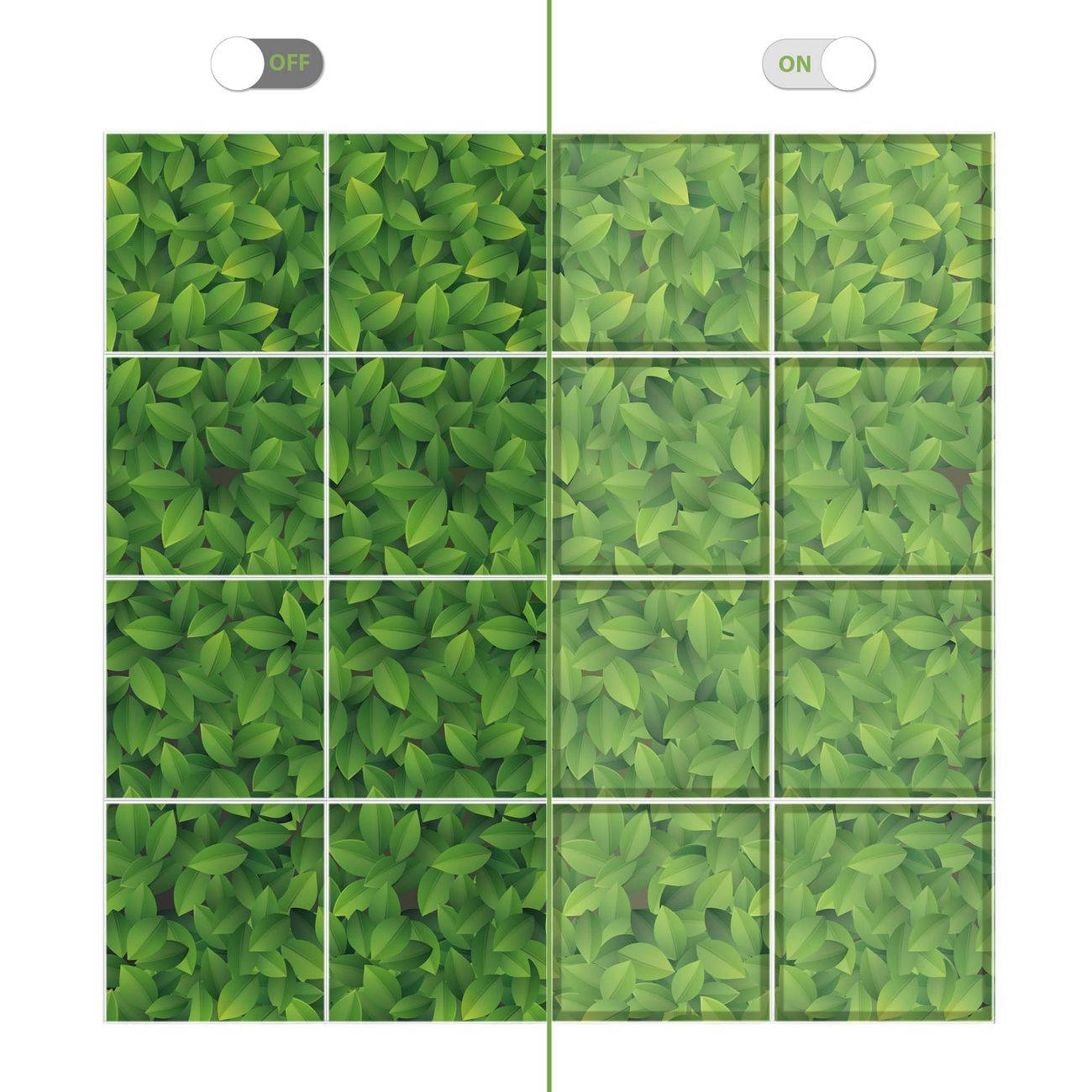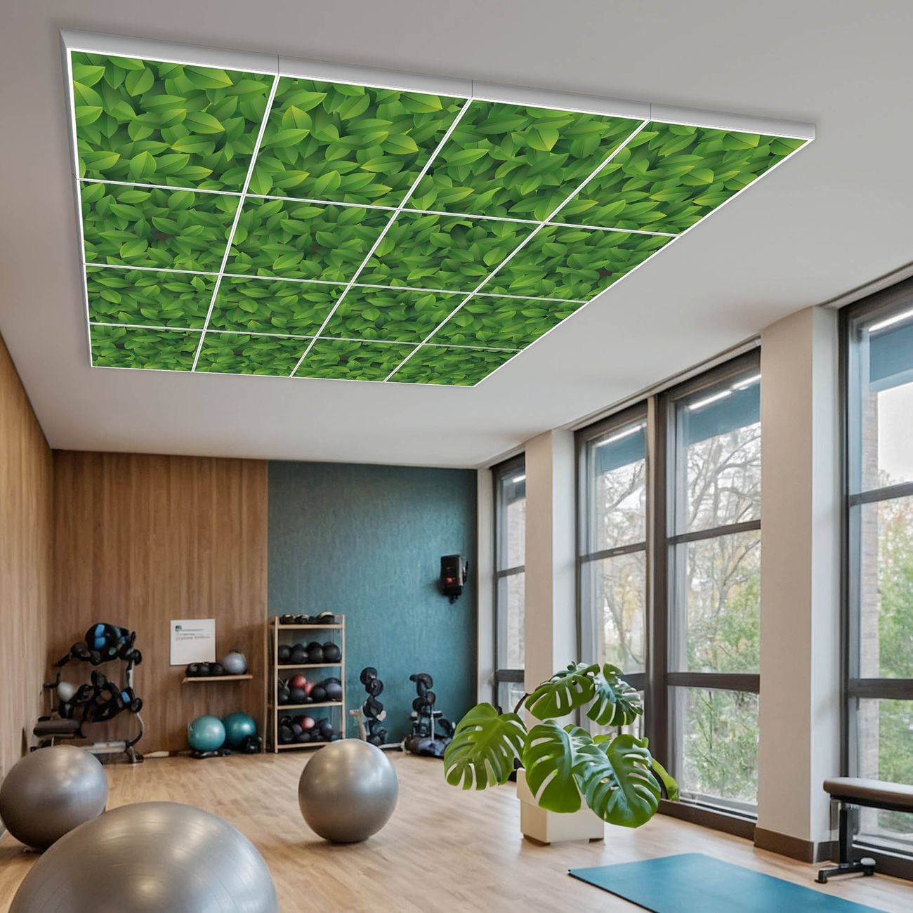 Entdecken Sie unsere vielseitigen Lichtdecken, hier in der Größe 248 x 248cm mit dem Motiv Motiv Grüne Blätter - Ihre Beleuchtungslösung für jede Umgebung Beleuchten Sie Ihren Raum nicht nur, sondern schaffen Sie Atmosphäre! Die banjado Lichtdecke verwandelt jeden Ort, ob zu Hause, in Praxen, Büros oder Studios in eine Wohlfühloase. Unsere einzelnen Elemente haben eine genormte Einheitsgröße von 62 x 62cm und können somit in jede gängige Rasterdecken verbaut werden. So finden Sie Ihre passende Ausführung: Gern helfen wir Ihnen, die passende Ausführung zu wählen. Hierfür muss die aktuelle Gegebenheit Ihrer Decke oder Wand beachtet werden. Haben Sie bereits eine Rasterdecke (auch Odenwalddecke genannt)? Hier bestellen Sie lediglich das Motiv + Beleuchtungspanel, denn beides wird in die bereits vorhandene Decke eingelegt. Haben Sie eine glatte Decke mit Lichtauslass oder möchten die Lichtdecke an der Wand befestigen? Hier bestellen Sie bitte Motiv + Beleuchtungspanel + Deckenbefestigung, eine Aufbauanleitung liegt immer bei. Die Lichtdecke kann sowohl an der Decke als auch an der Wand montiert werden, perfekt für kreative Lichtakzente oder alternative Beleuchtungslösungen. Haben Sie bereits eine Lichtdecke und möchten nur das Motiv wechseln? Hier bestellen Sie bitte nur Motiv, der Wechsel ist denkbar einfach. Der Aufbau Ihrer banjado Lichtdecke gestaltet sich unkompliziert, dank einer verständlichen Anleitung, die Ihnen Schritt für Schritt durch den Montageprozess hilft. Für die endgültige Installation und den sicheren Anschluss empfehlen wir die Hinzuziehung eines Fachmanns, um die optimale Funktion und Sicherheit Ihrer Beleuchtung zu gewährleisten. Falls Sie einen Fachmann für die Installation benötigen, geben Sie uns gern Bescheid, wir vermitteln Ihnen gern einen geeigneten Ansprechpartner aus Ihrer Nähe. Steuerung: Steigern Sie Ihr Beleuchtungserlebnis mit der nahtlosen Integration in Ihr Smart Home. Durch die Kompatibilität mit der SmartLife App, Alexa und Google Assistant wird Ihr Smartphone zur zentralen Steuerungseinheit. Ihr Handy fungiert hierbei sozusagen als Fernbedienung. Legen Sie individuelle Lichtszenen in der App fest, die bei Aktivierung über den Wand-Ein-/Ausschalter immer wieder abgerufen werden können ohne Handy. Mit der Szenenfunktion in der Smart App können Sie die Beleuchtung personalisieren und steuern, sodass sie auf Ihre individuellen Bedürfnisse, Tagesrhythmus und Stimmung zugeschnitten ist. Beispielsweise können Sie sich in der Morgendämmerung durch ein sanftes Licht wecken lassen oder das Licht der Praxis werktags um 7 Uhr automatisch einschalten lassen. Dieses kann dann natürlich auch zu einer bestimmten Zeit automatisch ausgeschaltet werden. Motivwahl: Diese einzigartige Lichtdecke zeichnet sich durch ihre Fähigkeit aus, die Lichtfarbe je nach gewähltem Motiv anzupassen - ein Baum wirft ein sanftes grünes Licht, während eine Wolkendecke Ihren Raum in ein beruhigendes blaues Leuchten hüllt. Berücksichtigen Sie dies bitte bei Ihrer Motivauswahl. Sie können das Motiv jederzeit ohne großen Aufwand austauschen, ob nach Jahreszeit oder anderem Anlass, unsere Auswahl lässt kaum Wünsche offen. Wir fertigen Ihnen gern eine personalisierte Lichtdecke mit einem eigenen Motiv oder Logo oder Foto, schreiben Sie uns jederzeit an. Technische Daten: Das Motiv ist auf einer 4mm starken Acrylglas Scheibe aufgebracht, das Gesamtgewicht Ihrer Ausführung beträgt 78,9kg. Die Farbtemperatur lässt sich frei einstellen von 3000 bis 6000 Kelvin, damit können Sie stufenlos zwischen warmweiß, neutralweiß und kaltweiß wählen. Die Gesamtleistung bei Ihrer gewählten Ausführung beträgt 640W. Der Lichtstrom beträgt 3600 Lumen, die Nennspannung 230 V. Die Lichtdecke ist mit Schutzart IP20 für den Innenbereich konzipiert und sollte nicht im Nassbereich verwendet werden.