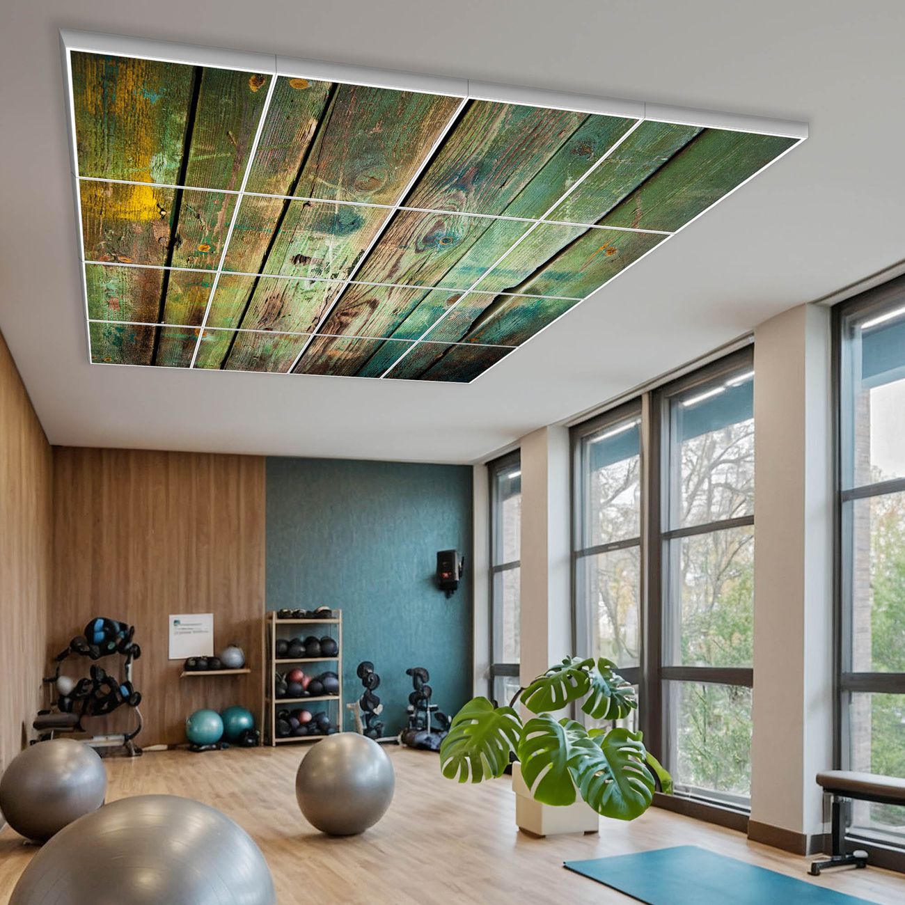 Entdecken Sie unsere vielseitigen Lichtdecken, hier in der Größe 248 x 248cm mit dem Motiv Motiv Grünes Holz - Ihre Beleuchtungslösung für jede Umgebung Beleuchten Sie Ihren Raum nicht nur, sondern schaffen Sie Atmosphäre! Die banjado Lichtdecke verwandelt jeden Ort, ob zu Hause, in Praxen, Büros oder Studios in eine Wohlfühloase. Unsere einzelnen Elemente haben eine genormte Einheitsgröße von 62 x 62cm und können somit in jede gängige Rasterdecken verbaut werden. So finden Sie Ihre passende Ausführung: Gern helfen wir Ihnen, die passende Ausführung zu wählen. Hierfür muss die aktuelle Gegebenheit Ihrer Decke oder Wand beachtet werden. Haben Sie bereits eine Rasterdecke (auch Odenwalddecke genannt)? Hier bestellen Sie lediglich das Motiv + Beleuchtungspanel, denn beides wird in die bereits vorhandene Decke eingelegt. Haben Sie eine glatte Decke mit Lichtauslass oder möchten die Lichtdecke an der Wand befestigen? Hier bestellen Sie bitte Motiv + Beleuchtungspanel + Deckenbefestigung, eine Aufbauanleitung liegt immer bei. Die Lichtdecke kann sowohl an der Decke als auch an der Wand montiert werden, perfekt für kreative Lichtakzente oder alternative Beleuchtungslösungen. Haben Sie bereits eine Lichtdecke und möchten nur das Motiv wechseln? Hier bestellen Sie bitte nur Motiv, der Wechsel ist denkbar einfach. Der Aufbau Ihrer banjado Lichtdecke gestaltet sich unkompliziert, dank einer verständlichen Anleitung, die Ihnen Schritt für Schritt durch den Montageprozess hilft. Für die endgültige Installation und den sicheren Anschluss empfehlen wir die Hinzuziehung eines Fachmanns, um die optimale Funktion und Sicherheit Ihrer Beleuchtung zu gewährleisten. Falls Sie einen Fachmann für die Installation benötigen, geben Sie uns gern Bescheid, wir vermitteln Ihnen gern einen geeigneten Ansprechpartner aus Ihrer Nähe. Steuerung: Steigern Sie Ihr Beleuchtungserlebnis mit der nahtlosen Integration in Ihr Smart Home. Durch die Kompatibilität mit der SmartLife App, Alexa und Google Assistant wird Ihr Smartphone zur zentralen Steuerungseinheit. Ihr Handy fungiert hierbei sozusagen als Fernbedienung. Legen Sie individuelle Lichtszenen in der App fest, die bei Aktivierung über den Wand-Ein-/Ausschalter immer wieder abgerufen werden können ohne Handy. Mit der Szenenfunktion in der Smart App können Sie die Beleuchtung personalisieren und steuern, sodass sie auf Ihre individuellen Bedürfnisse, Tagesrhythmus und Stimmung zugeschnitten ist. Beispielsweise können Sie sich in der Morgendämmerung durch ein sanftes Licht wecken lassen oder das Licht der Praxis werktags um 7 Uhr automatisch einschalten lassen. Dieses kann dann natürlich auch zu einer bestimmten Zeit automatisch ausgeschaltet werden. Motivwahl: Diese einzigartige Lichtdecke zeichnet sich durch ihre Fähigkeit aus, die Lichtfarbe je nach gewähltem Motiv anzupassen - ein Baum wirft ein sanftes grünes Licht, während eine Wolkendecke Ihren Raum in ein beruhigendes blaues Leuchten hüllt. Berücksichtigen Sie dies bitte bei Ihrer Motivauswahl. Sie können das Motiv jederzeit ohne großen Aufwand austauschen, ob nach Jahreszeit oder anderem Anlass, unsere Auswahl lässt kaum Wünsche offen. Wir fertigen Ihnen gern eine personalisierte Lichtdecke mit einem eigenen Motiv oder Logo oder Foto, schreiben Sie uns jederzeit an. Technische Daten: Das Motiv ist auf einer 4mm starken Acrylglas Scheibe aufgebracht, das Gesamtgewicht Ihrer Ausführung beträgt 78,9kg. Die Farbtemperatur lässt sich frei einstellen von 3000 bis 6000 Kelvin, damit können Sie stufenlos zwischen warmweiß, neutralweiß und kaltweiß wählen. Die Gesamtleistung bei Ihrer gewählten Ausführung beträgt 640W. Der Lichtstrom beträgt 3600 Lumen, die Nennspannung 230 V. Die Lichtdecke ist mit Schutzart IP20 für den Innenbereich konzipiert und sollte nicht im Nassbereich verwendet werden.
