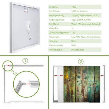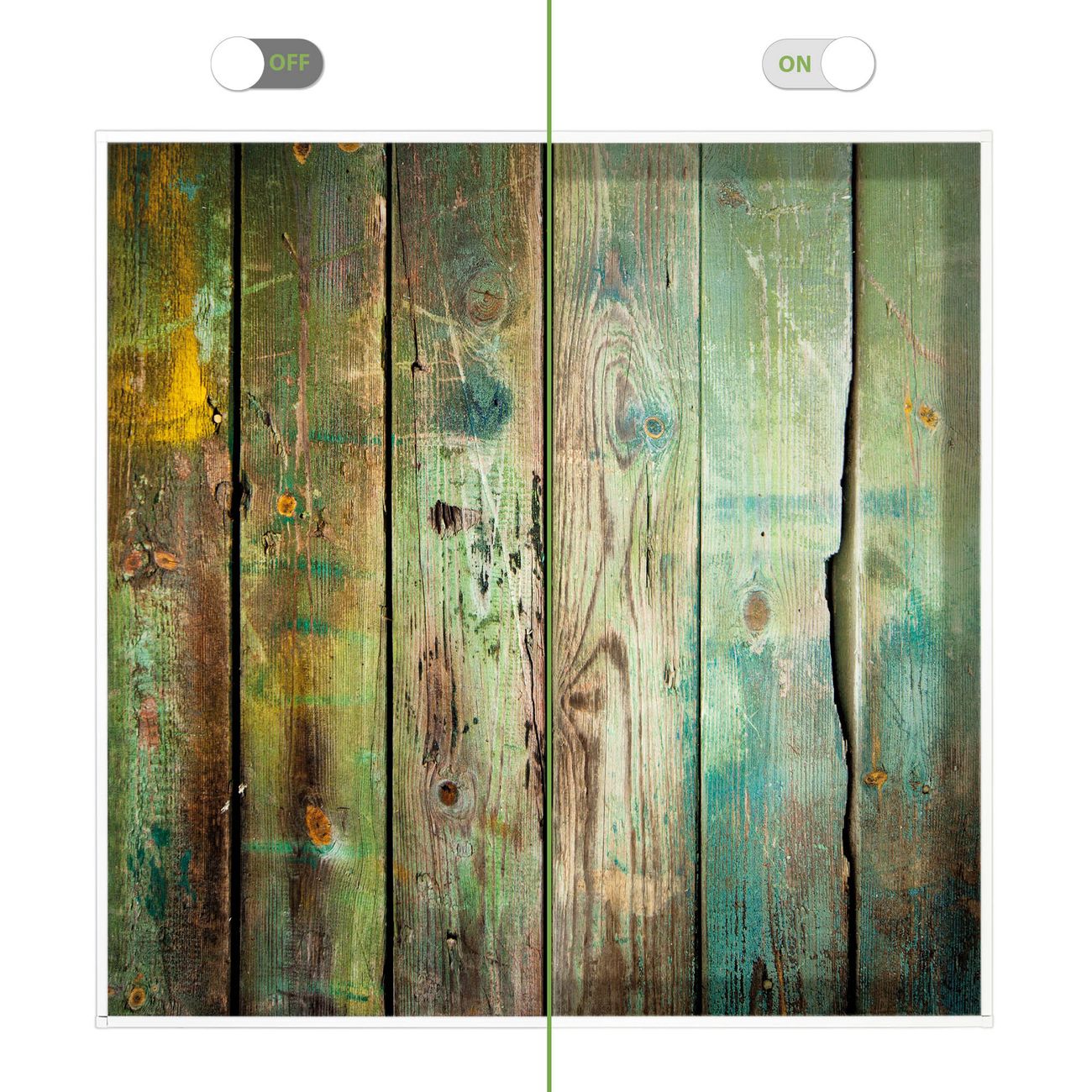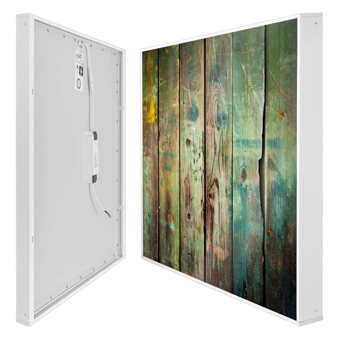 Entdecken Sie unsere vielseitigen Lichtdecken, hier in der Größe 62 x 62cm mit dem Motiv Motiv Grünes Holz - Ihre Beleuchtungslösung für jede Umgebung Beleuchten Sie Ihren Raum nicht nur, sondern schaffen Sie Atmosphäre! Die banjado Lichtdecke verwandelt jeden Ort, ob zu Hause, in Praxen, Büros oder Studios in eine Wohlfühloase. Unsere einzelnen Elemente haben eine genormte Einheitsgröße von 62 x 62cm und können somit in jede gängige Rasterdecken verbaut werden. So finden Sie Ihre passende Ausführung: Gern helfen wir Ihnen, die passende Ausführung zu wählen. Hierfür muss die aktuelle Gegebenheit Ihrer Decke oder Wand beachtet werden. Haben Sie bereits eine Rasterdecke (auch Odenwalddecke genannt)? Hier bestellen Sie lediglich das Motiv + Beleuchtungspanel, denn beides wird in die bereits vorhandene Decke eingelegt. Haben Sie eine glatte Decke mit Lichtauslass oder möchten die Lichtdecke an der Wand befestigen? Hier bestellen Sie bitte Motiv + Beleuchtungspanel + Deckenbefestigung, eine Aufbauanleitung liegt immer bei. Die Lichtdecke kann sowohl an der Decke als auch an der Wand montiert werden, perfekt für kreative Lichtakzente oder alternative Beleuchtungslösungen. Haben Sie bereits eine Lichtdecke und möchten nur das Motiv wechseln? Hier bestellen Sie bitte nur Motiv, der Wechsel ist denkbar einfach. Der Aufbau Ihrer banjado Lichtdecke gestaltet sich unkompliziert, dank einer verständlichen Anleitung, die Ihnen Schritt für Schritt durch den Montageprozess hilft. Für die endgültige Installation und den sicheren Anschluss empfehlen wir die Hinzuziehung eines Fachmanns, um die optimale Funktion und Sicherheit Ihrer Beleuchtung zu gewährleisten. Falls Sie einen Fachmann für die Installation benötigen, geben Sie uns gern Bescheid, wir vermitteln Ihnen gern einen geeigneten Ansprechpartner aus Ihrer Nähe. Steuerung: Steigern Sie Ihr Beleuchtungserlebnis mit der nahtlosen Integration in Ihr Smart Home. Durch die Kompatibilität mit der SmartLife App, Alexa und Google Assistant wird Ihr Smartphone zur zentralen Steuerungseinheit. Ihr Handy fungiert hierbei sozusagen als Fernbedienung. Legen Sie individuelle Lichtszenen in der App fest, die bei Aktivierung über den Wand-Ein-/Ausschalter immer wieder abgerufen werden können ohne Handy. Mit der Szenenfunktion in der Smart App können Sie die Beleuchtung personalisieren und steuern, sodass sie auf Ihre individuellen Bedürfnisse, Tagesrhythmus und Stimmung zugeschnitten ist. Beispielsweise können Sie sich in der Morgendämmerung durch ein sanftes Licht wecken lassen oder das Licht der Praxis werktags um 7 Uhr automatisch einschalten lassen. Dieses kann dann natürlich auch zu einer bestimmten Zeit automatisch ausgeschaltet werden. Motivwahl: Diese einzigartige Lichtdecke zeichnet sich durch ihre Fähigkeit aus, die Lichtfarbe je nach gewähltem Motiv anzupassen - ein Baum wirft ein sanftes grünes Licht, während eine Wolkendecke Ihren Raum in ein beruhigendes blaues Leuchten hüllt. Berücksichtigen Sie dies bitte bei Ihrer Motivauswahl. Sie können das Motiv jederzeit ohne großen Aufwand austauschen, ob nach Jahreszeit oder anderem Anlass, unsere Auswahl lässt kaum Wünsche offen. Wir fertigen Ihnen gern eine personalisierte Lichtdecke mit einem eigenen Motiv oder Logo oder Foto, schreiben Sie uns jederzeit an. Technische Daten: Das Motiv ist auf einer 4mm starken Acrylglas Scheibe aufgebracht, das Gesamtgewicht Ihrer Ausführung beträgt 4,9kg. Die Farbtemperatur lässt sich frei einstellen von 3000 bis 6000 Kelvin, damit können Sie stufenlos zwischen warmweiß, neutralweiß und kaltweiß wählen. Die Gesamtleistung bei Ihrer gewählten Ausführung beträgt 40W. Der Lichtstrom beträgt 3600 Lumen, die Nennspannung 230 V. Die Lichtdecke ist mit Schutzart IP20 für den Innenbereich konzipiert und sollte nicht im Nassbereich verwendet werden.