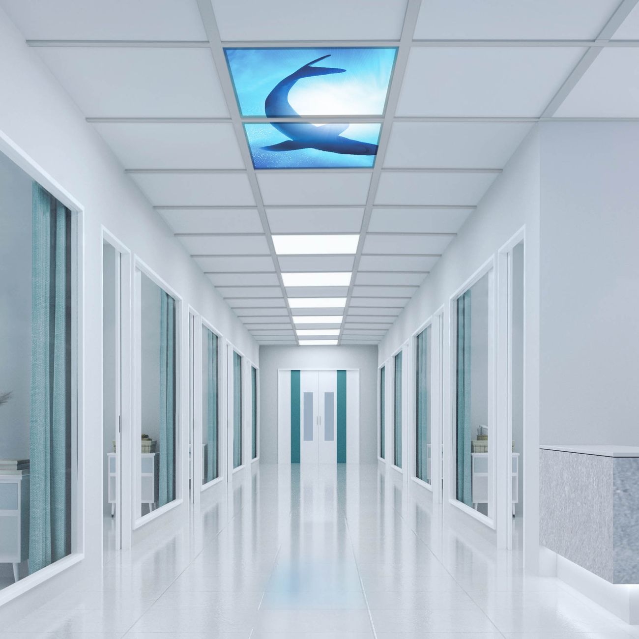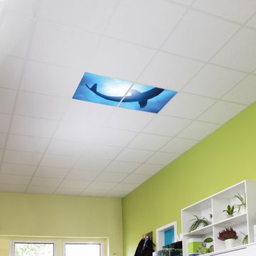 Entdecken Sie unsere vielseitigen Lichtdecken, hier in der Größe 124 x 62cm mit dem Motiv Motiv Hai - Ihre Beleuchtungslösung für jede Umgebung Beleuchten Sie Ihren Raum nicht nur, sondern schaffen Sie Atmosphäre! Die banjado Lichtdecke verwandelt jeden Ort, ob zu Hause, in Praxen, Büros oder Studios in eine Wohlfühloase. Unsere einzelnen Elemente haben eine genormte Einheitsgröße von 62 x 62cm und können somit in jede gängige Rasterdecken verbaut werden. So finden Sie Ihre passende Ausführung: Gern helfen wir Ihnen, die passende Ausführung zu wählen. Hierfür muss die aktuelle Gegebenheit Ihrer Decke oder Wand beachtet werden. Haben Sie bereits eine Rasterdecke (auch Odenwalddecke genannt)? Hier bestellen Sie lediglich das Motiv + Beleuchtungspanel, denn beides wird in die bereits vorhandene Decke eingelegt. Haben Sie eine glatte Decke mit Lichtauslass oder möchten die Lichtdecke an der Wand befestigen? Hier bestellen Sie bitte Motiv + Beleuchtungspanel + Deckenbefestigung, eine Aufbauanleitung liegt immer bei. Die Lichtdecke kann sowohl an der Decke als auch an der Wand montiert werden, perfekt für kreative Lichtakzente oder alternative Beleuchtungslösungen. Haben Sie bereits eine Lichtdecke und möchten nur das Motiv wechseln? Hier bestellen Sie bitte nur Motiv, der Wechsel ist denkbar einfach. Der Aufbau Ihrer banjado Lichtdecke gestaltet sich unkompliziert, dank einer verständlichen Anleitung, die Ihnen Schritt für Schritt durch den Montageprozess hilft. Für die endgültige Installation und den sicheren Anschluss empfehlen wir die Hinzuziehung eines Fachmanns, um die optimale Funktion und Sicherheit Ihrer Beleuchtung zu gewährleisten. Falls Sie einen Fachmann für die Installation benötigen, geben Sie uns gern Bescheid, wir vermitteln Ihnen gern einen geeigneten Ansprechpartner aus Ihrer Nähe. Steuerung: Steigern Sie Ihr Beleuchtungserlebnis mit der nahtlosen Integration in Ihr Smart Home. Durch die Kompatibilität mit der SmartLife App, Alexa und Google Assistant wird Ihr Smartphone zur zentralen Steuerungseinheit. Ihr Handy fungiert hierbei sozusagen als Fernbedienung. Legen Sie individuelle Lichtszenen in der App fest, die bei Aktivierung über den Wand-Ein-/Ausschalter immer wieder abgerufen werden können ohne Handy. Mit der Szenenfunktion in der Smart App können Sie die Beleuchtung personalisieren und steuern, sodass sie auf Ihre individuellen Bedürfnisse, Tagesrhythmus und Stimmung zugeschnitten ist. Beispielsweise können Sie sich in der Morgendämmerung durch ein sanftes Licht wecken lassen oder das Licht der Praxis werktags um 7 Uhr automatisch einschalten lassen. Dieses kann dann natürlich auch zu einer bestimmten Zeit automatisch ausgeschaltet werden. Motivwahl: Diese einzigartige Lichtdecke zeichnet sich durch ihre Fähigkeit aus, die Lichtfarbe je nach gewähltem Motiv anzupassen - ein Baum wirft ein sanftes grünes Licht, während eine Wolkendecke Ihren Raum in ein beruhigendes blaues Leuchten hüllt. Berücksichtigen Sie dies bitte bei Ihrer Motivauswahl. Sie können das Motiv jederzeit ohne großen Aufwand austauschen, ob nach Jahreszeit oder anderem Anlass, unsere Auswahl lässt kaum Wünsche offen. Wir fertigen Ihnen gern eine personalisierte Lichtdecke mit einem eigenen Motiv oder Logo oder Foto, schreiben Sie uns jederzeit an. Technische Daten: Das Motiv ist auf einer 4mm starken Acrylglas Scheibe aufgebracht, das Gesamtgewicht Ihrer Ausführung beträgt 4,5kg. Die Farbtemperatur lässt sich frei einstellen von 3000 bis 6000 Kelvin, damit können Sie stufenlos zwischen warmweiß, neutralweiß und kaltweiß wählen. Die Gesamtleistung bei Ihrer gewählten Ausführung beträgt 80W. Der Lichtstrom beträgt 3600 Lumen, die Nennspannung 230 V. Die Lichtdecke ist mit Schutzart IP20 für den Innenbereich konzipiert und sollte nicht im Nassbereich verwendet werden.