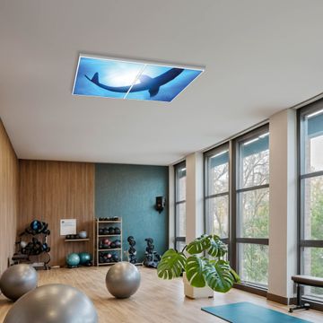 Entdecken Sie unsere vielseitigen Lichtdecken, hier in der Größe 124 x 62cm mit dem Motiv Motiv Hai - Ihre Beleuchtungslösung für jede Umgebung Beleuchten Sie Ihren Raum nicht nur, sondern schaffen Sie Atmosphäre! Die banjado Lichtdecke verwandelt jeden Ort, ob zu Hause, in Praxen, Büros oder Studios in eine Wohlfühloase. Unsere einzelnen Elemente haben eine genormte Einheitsgröße von 62 x 62cm und können somit in jede gängige Rasterdecken verbaut werden. So finden Sie Ihre passende Ausführung: Gern helfen wir Ihnen, die passende Ausführung zu wählen. Hierfür muss die aktuelle Gegebenheit Ihrer Decke oder Wand beachtet werden. Haben Sie bereits eine Rasterdecke (auch Odenwalddecke genannt)? Hier bestellen Sie lediglich das Motiv + Beleuchtungspanel, denn beides wird in die bereits vorhandene Decke eingelegt. Haben Sie eine glatte Decke mit Lichtauslass oder möchten die Lichtdecke an der Wand befestigen? Hier bestellen Sie bitte Motiv + Beleuchtungspanel + Deckenbefestigung, eine Aufbauanleitung liegt immer bei. Die Lichtdecke kann sowohl an der Decke als auch an der Wand montiert werden, perfekt für kreative Lichtakzente oder alternative Beleuchtungslösungen. Haben Sie bereits eine Lichtdecke und möchten nur das Motiv wechseln? Hier bestellen Sie bitte nur Motiv, der Wechsel ist denkbar einfach. Der Aufbau Ihrer banjado Lichtdecke gestaltet sich unkompliziert, dank einer verständlichen Anleitung, die Ihnen Schritt für Schritt durch den Montageprozess hilft. Für die endgültige Installation und den sicheren Anschluss empfehlen wir die Hinzuziehung eines Fachmanns, um die optimale Funktion und Sicherheit Ihrer Beleuchtung zu gewährleisten. Falls Sie einen Fachmann für die Installation benötigen, geben Sie uns gern Bescheid, wir vermitteln Ihnen gern einen geeigneten Ansprechpartner aus Ihrer Nähe. Steuerung: Steigern Sie Ihr Beleuchtungserlebnis mit der nahtlosen Integration in Ihr Smart Home. Durch die Kompatibilität mit der SmartLife App, Alexa und Google Assistant wird Ihr Smartphone zur zentralen Steuerungseinheit. Ihr Handy fungiert hierbei sozusagen als Fernbedienung. Legen Sie individuelle Lichtszenen in der App fest, die bei Aktivierung über den Wand-Ein-/Ausschalter immer wieder abgerufen werden können ohne Handy. Mit der Szenenfunktion in der Smart App können Sie die Beleuchtung personalisieren und steuern, sodass sie auf Ihre individuellen Bedürfnisse, Tagesrhythmus und Stimmung zugeschnitten ist. Beispielsweise können Sie sich in der Morgendämmerung durch ein sanftes Licht wecken lassen oder das Licht der Praxis werktags um 7 Uhr automatisch einschalten lassen. Dieses kann dann natürlich auch zu einer bestimmten Zeit automatisch ausgeschaltet werden. Motivwahl: Diese einzigartige Lichtdecke zeichnet sich durch ihre Fähigkeit aus, die Lichtfarbe je nach gewähltem Motiv anzupassen - ein Baum wirft ein sanftes grünes Licht, während eine Wolkendecke Ihren Raum in ein beruhigendes blaues Leuchten hüllt. Berücksichtigen Sie dies bitte bei Ihrer Motivauswahl. Sie können das Motiv jederzeit ohne großen Aufwand austauschen, ob nach Jahreszeit oder anderem Anlass, unsere Auswahl lässt kaum Wünsche offen. Wir fertigen Ihnen gern eine personalisierte Lichtdecke mit einem eigenen Motiv oder Logo oder Foto, schreiben Sie uns jederzeit an. Technische Daten: Das Motiv ist auf einer 4mm starken Acrylglas Scheibe aufgebracht, das Gesamtgewicht Ihrer Ausführung beträgt 9,9kg. Die Farbtemperatur lässt sich frei einstellen von 3000 bis 6000 Kelvin, damit können Sie stufenlos zwischen warmweiß, neutralweiß und kaltweiß wählen. Die Gesamtleistung bei Ihrer gewählten Ausführung beträgt 80W. Der Lichtstrom beträgt 3600 Lumen, die Nennspannung 230 V. Die Lichtdecke ist mit Schutzart IP20 für den Innenbereich konzipiert und sollte nicht im Nassbereich verwendet werden.