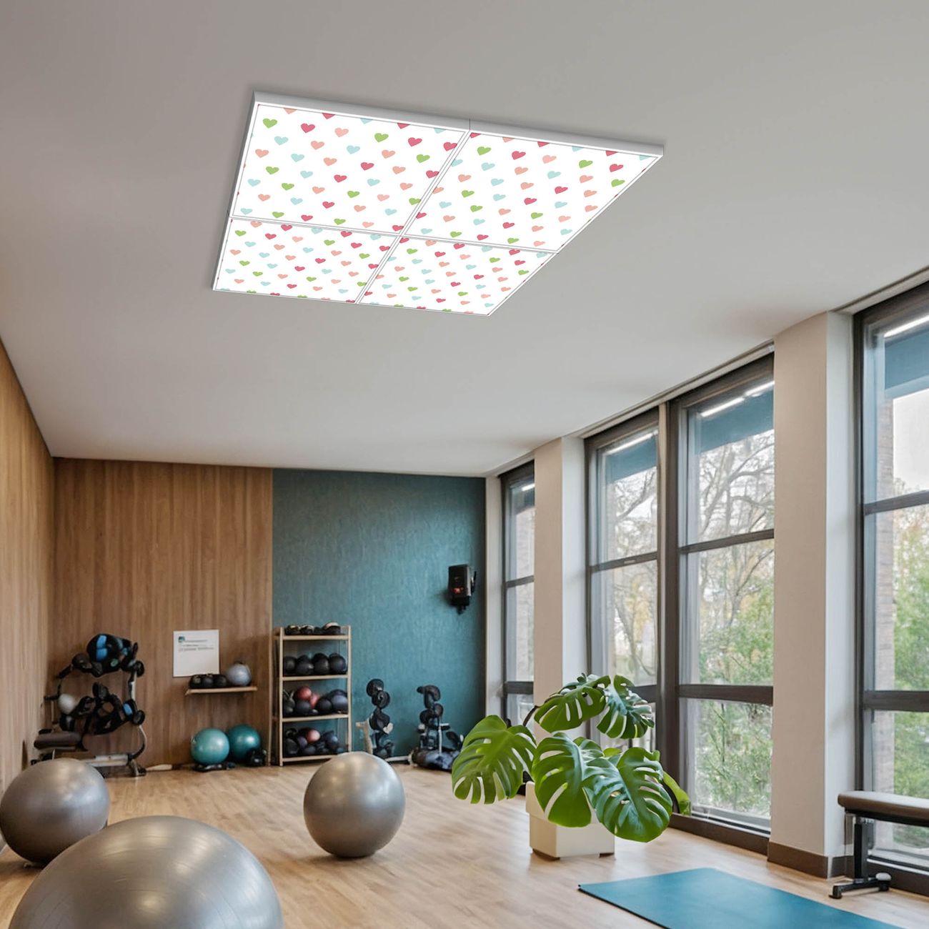 Entdecken Sie unsere vielseitigen Lichtdecken, hier in der Größe 124 x 124cm mit dem Motiv Motiv Herzen Auf Weiß - Ihre Beleuchtungslösung für jede Umgebung Beleuchten Sie Ihren Raum nicht nur, sondern schaffen Sie Atmosphäre! Die banjado Lichtdecke verwandelt jeden Ort, ob zu Hause, in Praxen, Büros oder Studios in eine Wohlfühloase. Unsere einzelnen Elemente haben eine genormte Einheitsgröße von 62 x 62cm und können somit in jede gängige Rasterdecken verbaut werden. So finden Sie Ihre passende Ausführung: Gern helfen wir Ihnen, die passende Ausführung zu wählen. Hierfür muss die aktuelle Gegebenheit Ihrer Decke oder Wand beachtet werden. Haben Sie bereits eine Rasterdecke (auch Odenwalddecke genannt)? Hier bestellen Sie lediglich das Motiv + Beleuchtungspanel, denn beides wird in die bereits vorhandene Decke eingelegt. Haben Sie eine glatte Decke mit Lichtauslass oder möchten die Lichtdecke an der Wand befestigen? Hier bestellen Sie bitte Motiv + Beleuchtungspanel + Deckenbefestigung, eine Aufbauanleitung liegt immer bei. Die Lichtdecke kann sowohl an der Decke als auch an der Wand montiert werden, perfekt für kreative Lichtakzente oder alternative Beleuchtungslösungen. Haben Sie bereits eine Lichtdecke und möchten nur das Motiv wechseln? Hier bestellen Sie bitte nur Motiv, der Wechsel ist denkbar einfach. Der Aufbau Ihrer banjado Lichtdecke gestaltet sich unkompliziert, dank einer verständlichen Anleitung, die Ihnen Schritt für Schritt durch den Montageprozess hilft. Für die endgültige Installation und den sicheren Anschluss empfehlen wir die Hinzuziehung eines Fachmanns, um die optimale Funktion und Sicherheit Ihrer Beleuchtung zu gewährleisten. Falls Sie einen Fachmann für die Installation benötigen, geben Sie uns gern Bescheid, wir vermitteln Ihnen gern einen geeigneten Ansprechpartner aus Ihrer Nähe. Steuerung: Steigern Sie Ihr Beleuchtungserlebnis mit der nahtlosen Integration in Ihr Smart Home. Durch die Kompatibilität mit der SmartLife App, Alexa und Google Assistant wird Ihr Smartphone zur zentralen Steuerungseinheit. Ihr Handy fungiert hierbei sozusagen als Fernbedienung. Legen Sie individuelle Lichtszenen in der App fest, die bei Aktivierung über den Wand-Ein-/Ausschalter immer wieder abgerufen werden können ohne Handy. Mit der Szenenfunktion in der Smart App können Sie die Beleuchtung personalisieren und steuern, sodass sie auf Ihre individuellen Bedürfnisse, Tagesrhythmus und Stimmung zugeschnitten ist. Beispielsweise können Sie sich in der Morgendämmerung durch ein sanftes Licht wecken lassen oder das Licht der Praxis werktags um 7 Uhr automatisch einschalten lassen. Dieses kann dann natürlich auch zu einer bestimmten Zeit automatisch ausgeschaltet werden. Motivwahl: Diese einzigartige Lichtdecke zeichnet sich durch ihre Fähigkeit aus, die Lichtfarbe je nach gewähltem Motiv anzupassen - ein Baum wirft ein sanftes grünes Licht, während eine Wolkendecke Ihren Raum in ein beruhigendes blaues Leuchten hüllt. Berücksichtigen Sie dies bitte bei Ihrer Motivauswahl. Sie können das Motiv jederzeit ohne großen Aufwand austauschen, ob nach Jahreszeit oder anderem Anlass, unsere Auswahl lässt kaum Wünsche offen. Wir fertigen Ihnen gern eine personalisierte Lichtdecke mit einem eigenen Motiv oder Logo oder Foto, schreiben Sie uns jederzeit an. Technische Daten: Das Motiv ist auf einer 4mm starken Acrylglas Scheibe aufgebracht, das Gesamtgewicht Ihrer Ausführung beträgt 19,7kg. Die Farbtemperatur lässt sich frei einstellen von 3000 bis 6000 Kelvin, damit können Sie stufenlos zwischen warmweiß, neutralweiß und kaltweiß wählen. Die Gesamtleistung bei Ihrer gewählten Ausführung beträgt 160W. Der Lichtstrom beträgt 3600 Lumen, die Nennspannung 230 V. Die Lichtdecke ist mit Schutzart IP20 für den Innenbereich konzipiert und sollte nicht im Nassbereich verwendet werden.