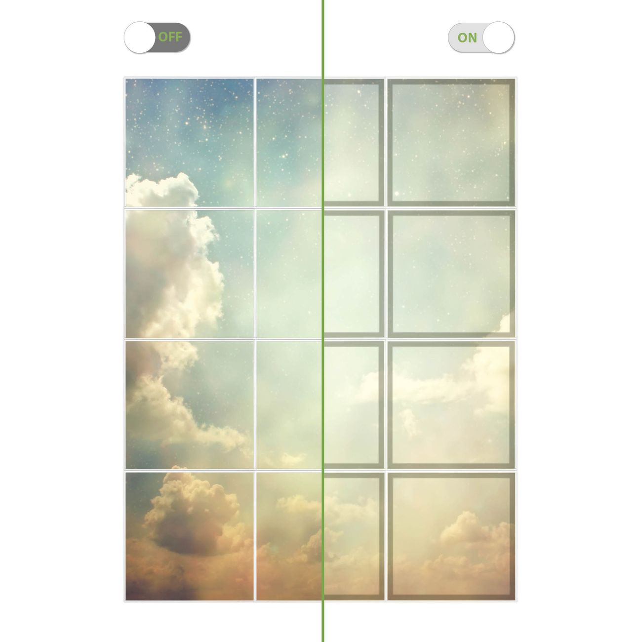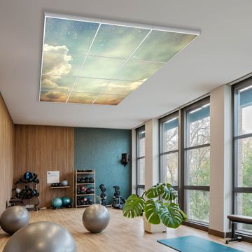 Entdecken Sie unsere vielseitigen Lichtdecken, hier in der Größe 186 x 248cm mit dem Motiv Motiv Himmel Vintage - Ihre Beleuchtungslösung für jede Umgebung Beleuchten Sie Ihren Raum nicht nur, sondern schaffen Sie Atmosphäre! Die banjado Lichtdecke verwandelt jeden Ort, ob zu Hause, in Praxen, Büros oder Studios in eine Wohlfühloase. Unsere einzelnen Elemente haben eine genormte Einheitsgröße von 62 x 62cm und können somit in jede gängige Rasterdecken verbaut werden. So finden Sie Ihre passende Ausführung: Gern helfen wir Ihnen, die passende Ausführung zu wählen. Hierfür muss die aktuelle Gegebenheit Ihrer Decke oder Wand beachtet werden. Haben Sie bereits eine Rasterdecke (auch Odenwalddecke genannt)? Hier bestellen Sie lediglich das Motiv + Beleuchtungspanel, denn beides wird in die bereits vorhandene Decke eingelegt. Haben Sie eine glatte Decke mit Lichtauslass oder möchten die Lichtdecke an der Wand befestigen? Hier bestellen Sie bitte Motiv + Beleuchtungspanel + Deckenbefestigung, eine Aufbauanleitung liegt immer bei. Die Lichtdecke kann sowohl an der Decke als auch an der Wand montiert werden, perfekt für kreative Lichtakzente oder alternative Beleuchtungslösungen. Haben Sie bereits eine Lichtdecke und möchten nur das Motiv wechseln? Hier bestellen Sie bitte nur Motiv, der Wechsel ist denkbar einfach. Der Aufbau Ihrer banjado Lichtdecke gestaltet sich unkompliziert, dank einer verständlichen Anleitung, die Ihnen Schritt für Schritt durch den Montageprozess hilft. Für die endgültige Installation und den sicheren Anschluss empfehlen wir die Hinzuziehung eines Fachmanns, um die optimale Funktion und Sicherheit Ihrer Beleuchtung zu gewährleisten. Falls Sie einen Fachmann für die Installation benötigen, geben Sie uns gern Bescheid, wir vermitteln Ihnen gern einen geeigneten Ansprechpartner aus Ihrer Nähe. Steuerung: Steigern Sie Ihr Beleuchtungserlebnis mit der nahtlosen Integration in Ihr Smart Home. Durch die Kompatibilität mit der SmartLife App, Alexa und Google Assistant wird Ihr Smartphone zur zentralen Steuerungseinheit. Ihr Handy fungiert hierbei sozusagen als Fernbedienung. Legen Sie individuelle Lichtszenen in der App fest, die bei Aktivierung über den Wand-Ein-/Ausschalter immer wieder abgerufen werden können ohne Handy. Mit der Szenenfunktion in der Smart App können Sie die Beleuchtung personalisieren und steuern, sodass sie auf Ihre individuellen Bedürfnisse, Tagesrhythmus und Stimmung zugeschnitten ist. Beispielsweise können Sie sich in der Morgendämmerung durch ein sanftes Licht wecken lassen oder das Licht der Praxis werktags um 7 Uhr automatisch einschalten lassen. Dieses kann dann natürlich auch zu einer bestimmten Zeit automatisch ausgeschaltet werden. Motivwahl: Diese einzigartige Lichtdecke zeichnet sich durch ihre Fähigkeit aus, die Lichtfarbe je nach gewähltem Motiv anzupassen - ein Baum wirft ein sanftes grünes Licht, während eine Wolkendecke Ihren Raum in ein beruhigendes blaues Leuchten hüllt. Berücksichtigen Sie dies bitte bei Ihrer Motivauswahl. Sie können das Motiv jederzeit ohne großen Aufwand austauschen, ob nach Jahreszeit oder anderem Anlass, unsere Auswahl lässt kaum Wünsche offen. Wir fertigen Ihnen gern eine personalisierte Lichtdecke mit einem eigenen Motiv oder Logo oder Foto, schreiben Sie uns jederzeit an. Technische Daten: Das Motiv ist auf einer 4mm starken Acrylglas Scheibe aufgebracht, das Gesamtgewicht Ihrer Ausführung beträgt 59,1kg. Die Farbtemperatur lässt sich frei einstellen von 3000 bis 6000 Kelvin, damit können Sie stufenlos zwischen warmweiß, neutralweiß und kaltweiß wählen. Die Gesamtleistung bei Ihrer gewählten Ausführung beträgt 480W. Der Lichtstrom beträgt 3600 Lumen, die Nennspannung 230 V. Die Lichtdecke ist mit Schutzart IP20 für den Innenbereich konzipiert und sollte nicht im Nassbereich verwendet werden.