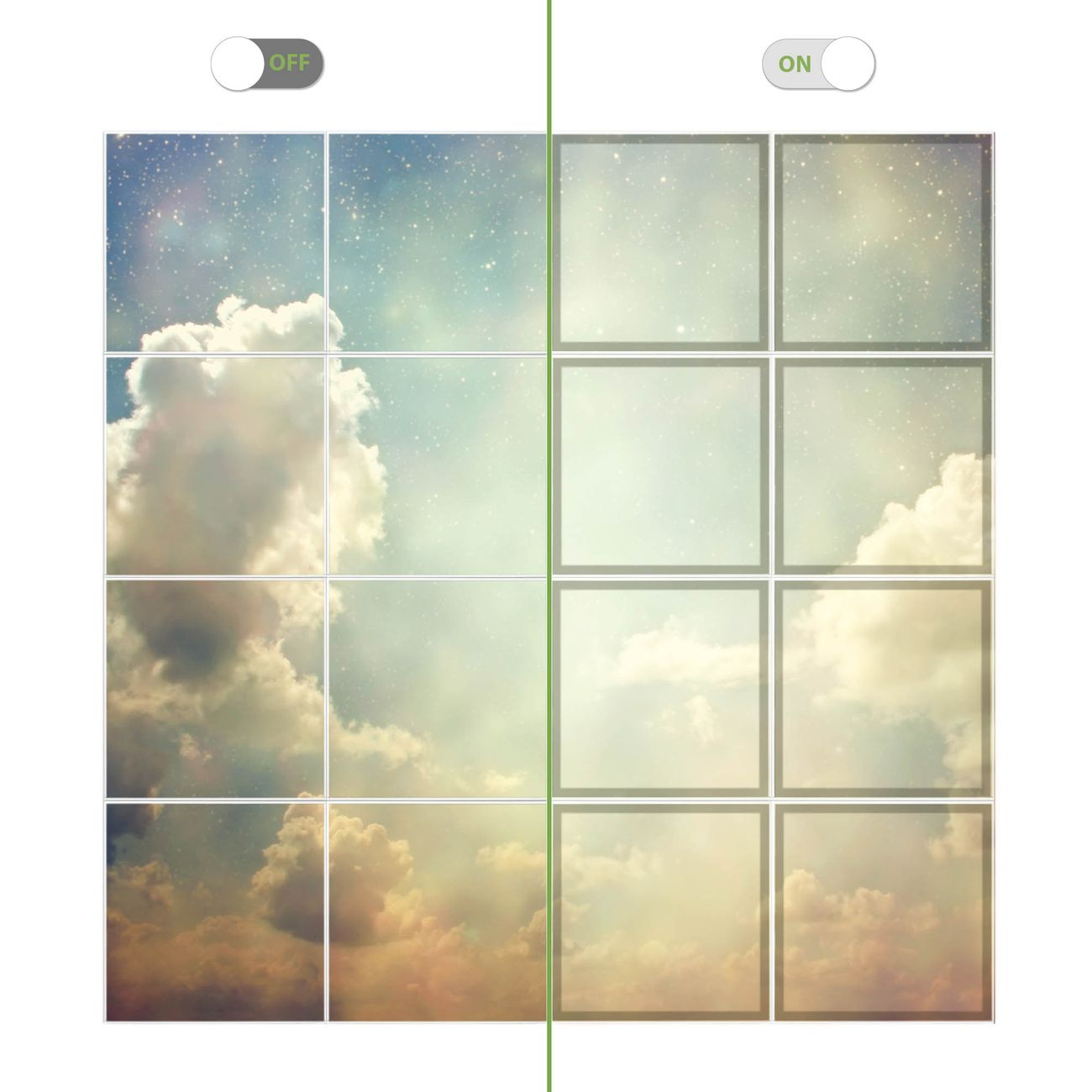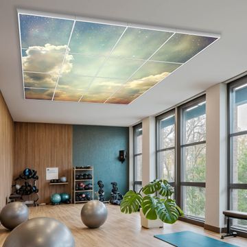 Entdecken Sie unsere vielseitigen Lichtdecken, hier in der Größe 248 x 248cm mit dem Motiv Motiv Himmel Vintage - Ihre Beleuchtungslösung für jede Umgebung Beleuchten Sie Ihren Raum nicht nur, sondern schaffen Sie Atmosphäre! Die banjado Lichtdecke verwandelt jeden Ort, ob zu Hause, in Praxen, Büros oder Studios in eine Wohlfühloase. Unsere einzelnen Elemente haben eine genormte Einheitsgröße von 62 x 62cm und können somit in jede gängige Rasterdecken verbaut werden. So finden Sie Ihre passende Ausführung: Gern helfen wir Ihnen, die passende Ausführung zu wählen. Hierfür muss die aktuelle Gegebenheit Ihrer Decke oder Wand beachtet werden. Haben Sie bereits eine Rasterdecke (auch Odenwalddecke genannt)? Hier bestellen Sie lediglich das Motiv + Beleuchtungspanel, denn beides wird in die bereits vorhandene Decke eingelegt. Haben Sie eine glatte Decke mit Lichtauslass oder möchten die Lichtdecke an der Wand befestigen? Hier bestellen Sie bitte Motiv + Beleuchtungspanel + Deckenbefestigung, eine Aufbauanleitung liegt immer bei. Die Lichtdecke kann sowohl an der Decke als auch an der Wand montiert werden, perfekt für kreative Lichtakzente oder alternative Beleuchtungslösungen. Haben Sie bereits eine Lichtdecke und möchten nur das Motiv wechseln? Hier bestellen Sie bitte nur Motiv, der Wechsel ist denkbar einfach. Der Aufbau Ihrer banjado Lichtdecke gestaltet sich unkompliziert, dank einer verständlichen Anleitung, die Ihnen Schritt für Schritt durch den Montageprozess hilft. Für die endgültige Installation und den sicheren Anschluss empfehlen wir die Hinzuziehung eines Fachmanns, um die optimale Funktion und Sicherheit Ihrer Beleuchtung zu gewährleisten. Falls Sie einen Fachmann für die Installation benötigen, geben Sie uns gern Bescheid, wir vermitteln Ihnen gern einen geeigneten Ansprechpartner aus Ihrer Nähe. Steuerung: Steigern Sie Ihr Beleuchtungserlebnis mit der nahtlosen Integration in Ihr Smart Home. Durch die Kompatibilität mit der SmartLife App, Alexa und Google Assistant wird Ihr Smartphone zur zentralen Steuerungseinheit. Ihr Handy fungiert hierbei sozusagen als Fernbedienung. Legen Sie individuelle Lichtszenen in der App fest, die bei Aktivierung über den Wand-Ein-/Ausschalter immer wieder abgerufen werden können ohne Handy. Mit der Szenenfunktion in der Smart App können Sie die Beleuchtung personalisieren und steuern, sodass sie auf Ihre individuellen Bedürfnisse, Tagesrhythmus und Stimmung zugeschnitten ist. Beispielsweise können Sie sich in der Morgendämmerung durch ein sanftes Licht wecken lassen oder das Licht der Praxis werktags um 7 Uhr automatisch einschalten lassen. Dieses kann dann natürlich auch zu einer bestimmten Zeit automatisch ausgeschaltet werden. Motivwahl: Diese einzigartige Lichtdecke zeichnet sich durch ihre Fähigkeit aus, die Lichtfarbe je nach gewähltem Motiv anzupassen - ein Baum wirft ein sanftes grünes Licht, während eine Wolkendecke Ihren Raum in ein beruhigendes blaues Leuchten hüllt. Berücksichtigen Sie dies bitte bei Ihrer Motivauswahl. Sie können das Motiv jederzeit ohne großen Aufwand austauschen, ob nach Jahreszeit oder anderem Anlass, unsere Auswahl lässt kaum Wünsche offen. Wir fertigen Ihnen gern eine personalisierte Lichtdecke mit einem eigenen Motiv oder Logo oder Foto, schreiben Sie uns jederzeit an. Technische Daten: Das Motiv ist auf einer 4mm starken Acrylglas Scheibe aufgebracht, das Gesamtgewicht Ihrer Ausführung beträgt 78,9kg. Die Farbtemperatur lässt sich frei einstellen von 3000 bis 6000 Kelvin, damit können Sie stufenlos zwischen warmweiß, neutralweiß und kaltweiß wählen. Die Gesamtleistung bei Ihrer gewählten Ausführung beträgt 640W. Der Lichtstrom beträgt 3600 Lumen, die Nennspannung 230 V. Die Lichtdecke ist mit Schutzart IP20 für den Innenbereich konzipiert und sollte nicht im Nassbereich verwendet werden.