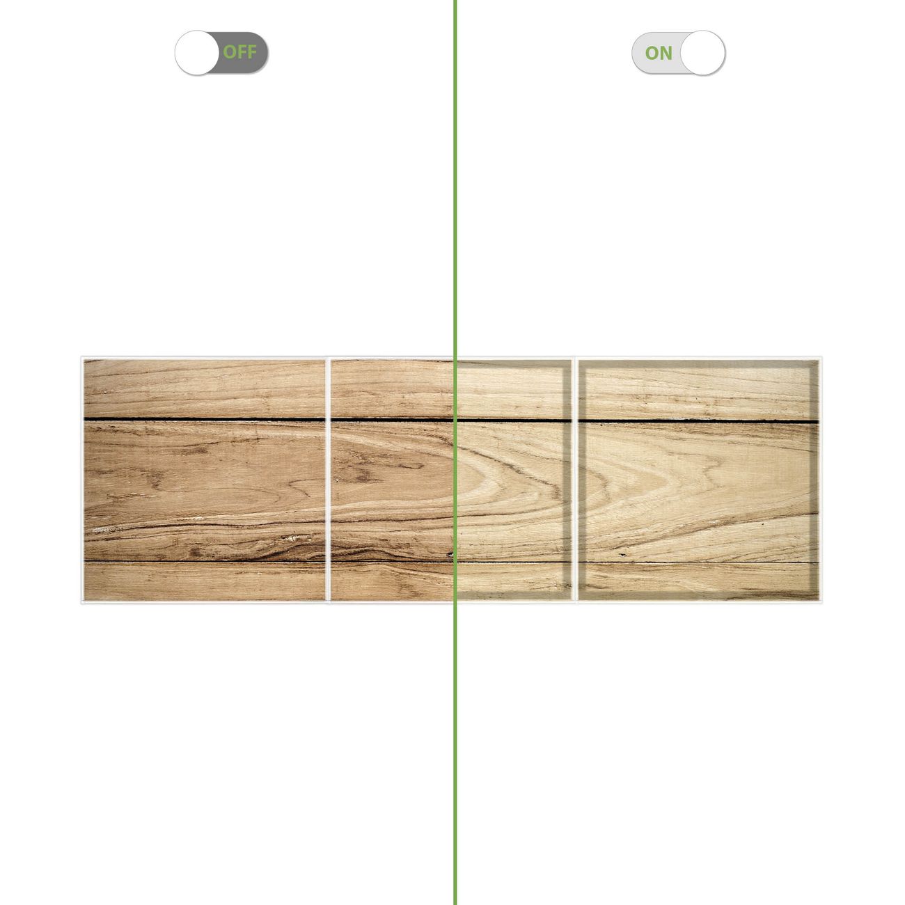 Entdecken Sie unsere vielseitigen Lichtdecken, hier in der Größe 186 x 62cm mit dem Motiv Motiv Holzplanken - Ihre Beleuchtungslösung für jede Umgebung Beleuchten Sie Ihren Raum nicht nur, sondern schaffen Sie Atmosphäre! Die banjado Lichtdecke verwandelt jeden Ort, ob zu Hause, in Praxen, Büros oder Studios in eine Wohlfühloase. Unsere einzelnen Elemente haben eine genormte Einheitsgröße von 62 x 62cm und können somit in jede gängige Rasterdecken verbaut werden. So finden Sie Ihre passende Ausführung: Gern helfen wir Ihnen, die passende Ausführung zu wählen. Hierfür muss die aktuelle Gegebenheit Ihrer Decke oder Wand beachtet werden. Haben Sie bereits eine Rasterdecke (auch Odenwalddecke genannt)? Hier bestellen Sie lediglich das Motiv + Beleuchtungspanel, denn beides wird in die bereits vorhandene Decke eingelegt. Haben Sie eine glatte Decke mit Lichtauslass oder möchten die Lichtdecke an der Wand befestigen? Hier bestellen Sie bitte Motiv + Beleuchtungspanel + Deckenbefestigung, eine Aufbauanleitung liegt immer bei. Die Lichtdecke kann sowohl an der Decke als auch an der Wand montiert werden, perfekt für kreative Lichtakzente oder alternative Beleuchtungslösungen. Haben Sie bereits eine Lichtdecke und möchten nur das Motiv wechseln? Hier bestellen Sie bitte nur Motiv, der Wechsel ist denkbar einfach. Der Aufbau Ihrer banjado Lichtdecke gestaltet sich unkompliziert, dank einer verständlichen Anleitung, die Ihnen Schritt für Schritt durch den Montageprozess hilft. Für die endgültige Installation und den sicheren Anschluss empfehlen wir die Hinzuziehung eines Fachmanns, um die optimale Funktion und Sicherheit Ihrer Beleuchtung zu gewährleisten. Falls Sie einen Fachmann für die Installation benötigen, geben Sie uns gern Bescheid, wir vermitteln Ihnen gern einen geeigneten Ansprechpartner aus Ihrer Nähe. Steuerung: Steigern Sie Ihr Beleuchtungserlebnis mit der nahtlosen Integration in Ihr Smart Home. Durch die Kompatibilität mit der SmartLife App, Alexa und Google Assistant wird Ihr Smartphone zur zentralen Steuerungseinheit. Ihr Handy fungiert hierbei sozusagen als Fernbedienung. Legen Sie individuelle Lichtszenen in der App fest, die bei Aktivierung über den Wand-Ein-/Ausschalter immer wieder abgerufen werden können ohne Handy. Mit der Szenenfunktion in der Smart App können Sie die Beleuchtung personalisieren und steuern, sodass sie auf Ihre individuellen Bedürfnisse, Tagesrhythmus und Stimmung zugeschnitten ist. Beispielsweise können Sie sich in der Morgendämmerung durch ein sanftes Licht wecken lassen oder das Licht der Praxis werktags um 7 Uhr automatisch einschalten lassen. Dieses kann dann natürlich auch zu einer bestimmten Zeit automatisch ausgeschaltet werden. Motivwahl: Diese einzigartige Lichtdecke zeichnet sich durch ihre Fähigkeit aus, die Lichtfarbe je nach gewähltem Motiv anzupassen - ein Baum wirft ein sanftes grünes Licht, während eine Wolkendecke Ihren Raum in ein beruhigendes blaues Leuchten hüllt. Berücksichtigen Sie dies bitte bei Ihrer Motivauswahl. Sie können das Motiv jederzeit ohne großen Aufwand austauschen, ob nach Jahreszeit oder anderem Anlass, unsere Auswahl lässt kaum Wünsche offen. Wir fertigen Ihnen gern eine personalisierte Lichtdecke mit einem eigenen Motiv oder Logo oder Foto, schreiben Sie uns jederzeit an. Technische Daten: Das Motiv ist auf einer 4mm starken Acrylglas Scheibe aufgebracht, das Gesamtgewicht Ihrer Ausführung beträgt 14,8kg. Die Farbtemperatur lässt sich frei einstellen von 3000 bis 6000 Kelvin, damit können Sie stufenlos zwischen warmweiß, neutralweiß und kaltweiß wählen. Die Gesamtleistung bei Ihrer gewählten Ausführung beträgt 120W. Der Lichtstrom beträgt 3600 Lumen, die Nennspannung 230 V. Die Lichtdecke ist mit Schutzart IP20 für den Innenbereich konzipiert und sollte nicht im Nassbereich verwendet werden.