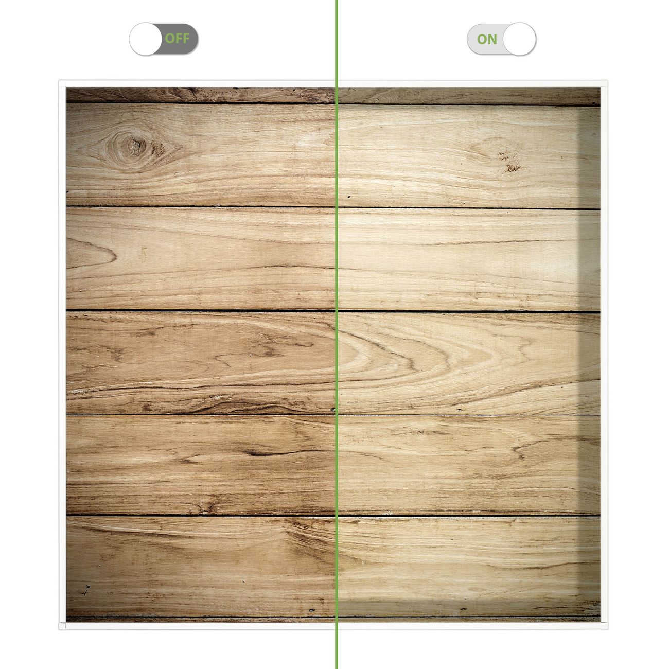 Entdecken Sie unsere vielseitigen Lichtdecken, hier in der Größe 62 x 62cm mit dem Motiv Motiv Holzplanken - Ihre Beleuchtungslösung für jede Umgebung Beleuchten Sie Ihren Raum nicht nur, sondern schaffen Sie Atmosphäre! Die banjado Lichtdecke verwandelt jeden Ort, ob zu Hause, in Praxen, Büros oder Studios in eine Wohlfühloase. Unsere einzelnen Elemente haben eine genormte Einheitsgröße von 62 x 62cm und können somit in jede gängige Rasterdecken verbaut werden. So finden Sie Ihre passende Ausführung: Gern helfen wir Ihnen, die passende Ausführung zu wählen. Hierfür muss die aktuelle Gegebenheit Ihrer Decke oder Wand beachtet werden. Haben Sie bereits eine Rasterdecke (auch Odenwalddecke genannt)? Hier bestellen Sie lediglich das Motiv + Beleuchtungspanel, denn beides wird in die bereits vorhandene Decke eingelegt. Haben Sie eine glatte Decke mit Lichtauslass oder möchten die Lichtdecke an der Wand befestigen? Hier bestellen Sie bitte Motiv + Beleuchtungspanel + Deckenbefestigung, eine Aufbauanleitung liegt immer bei. Die Lichtdecke kann sowohl an der Decke als auch an der Wand montiert werden, perfekt für kreative Lichtakzente oder alternative Beleuchtungslösungen. Haben Sie bereits eine Lichtdecke und möchten nur das Motiv wechseln? Hier bestellen Sie bitte nur Motiv, der Wechsel ist denkbar einfach. Der Aufbau Ihrer banjado Lichtdecke gestaltet sich unkompliziert, dank einer verständlichen Anleitung, die Ihnen Schritt für Schritt durch den Montageprozess hilft. Für die endgültige Installation und den sicheren Anschluss empfehlen wir die Hinzuziehung eines Fachmanns, um die optimale Funktion und Sicherheit Ihrer Beleuchtung zu gewährleisten. Falls Sie einen Fachmann für die Installation benötigen, geben Sie uns gern Bescheid, wir vermitteln Ihnen gern einen geeigneten Ansprechpartner aus Ihrer Nähe. Steuerung: Steigern Sie Ihr Beleuchtungserlebnis mit der nahtlosen Integration in Ihr Smart Home. Durch die Kompatibilität mit der SmartLife App, Alexa und Google Assistant wird Ihr Smartphone zur zentralen Steuerungseinheit. Ihr Handy fungiert hierbei sozusagen als Fernbedienung. Legen Sie individuelle Lichtszenen in der App fest, die bei Aktivierung über den Wand-Ein-/Ausschalter immer wieder abgerufen werden können ohne Handy. Mit der Szenenfunktion in der Smart App können Sie die Beleuchtung personalisieren und steuern, sodass sie auf Ihre individuellen Bedürfnisse, Tagesrhythmus und Stimmung zugeschnitten ist. Beispielsweise können Sie sich in der Morgendämmerung durch ein sanftes Licht wecken lassen oder das Licht der Praxis werktags um 7 Uhr automatisch einschalten lassen. Dieses kann dann natürlich auch zu einer bestimmten Zeit automatisch ausgeschaltet werden. Motivwahl: Diese einzigartige Lichtdecke zeichnet sich durch ihre Fähigkeit aus, die Lichtfarbe je nach gewähltem Motiv anzupassen - ein Baum wirft ein sanftes grünes Licht, während eine Wolkendecke Ihren Raum in ein beruhigendes blaues Leuchten hüllt. Berücksichtigen Sie dies bitte bei Ihrer Motivauswahl. Sie können das Motiv jederzeit ohne großen Aufwand austauschen, ob nach Jahreszeit oder anderem Anlass, unsere Auswahl lässt kaum Wünsche offen. Wir fertigen Ihnen gern eine personalisierte Lichtdecke mit einem eigenen Motiv oder Logo oder Foto, schreiben Sie uns jederzeit an. Technische Daten: Das Motiv ist auf einer 4mm starken Acrylglas Scheibe aufgebracht, das Gesamtgewicht Ihrer Ausführung beträgt 2,3kg. Die Farbtemperatur lässt sich frei einstellen von 3000 bis 6000 Kelvin, damit können Sie stufenlos zwischen warmweiß, neutralweiß und kaltweiß wählen. Die Gesamtleistung bei Ihrer gewählten Ausführung beträgt 40W. Der Lichtstrom beträgt 3600 Lumen, die Nennspannung 230 V. Die Lichtdecke ist mit Schutzart IP20 für den Innenbereich konzipiert und sollte nicht im Nassbereich verwendet werden.