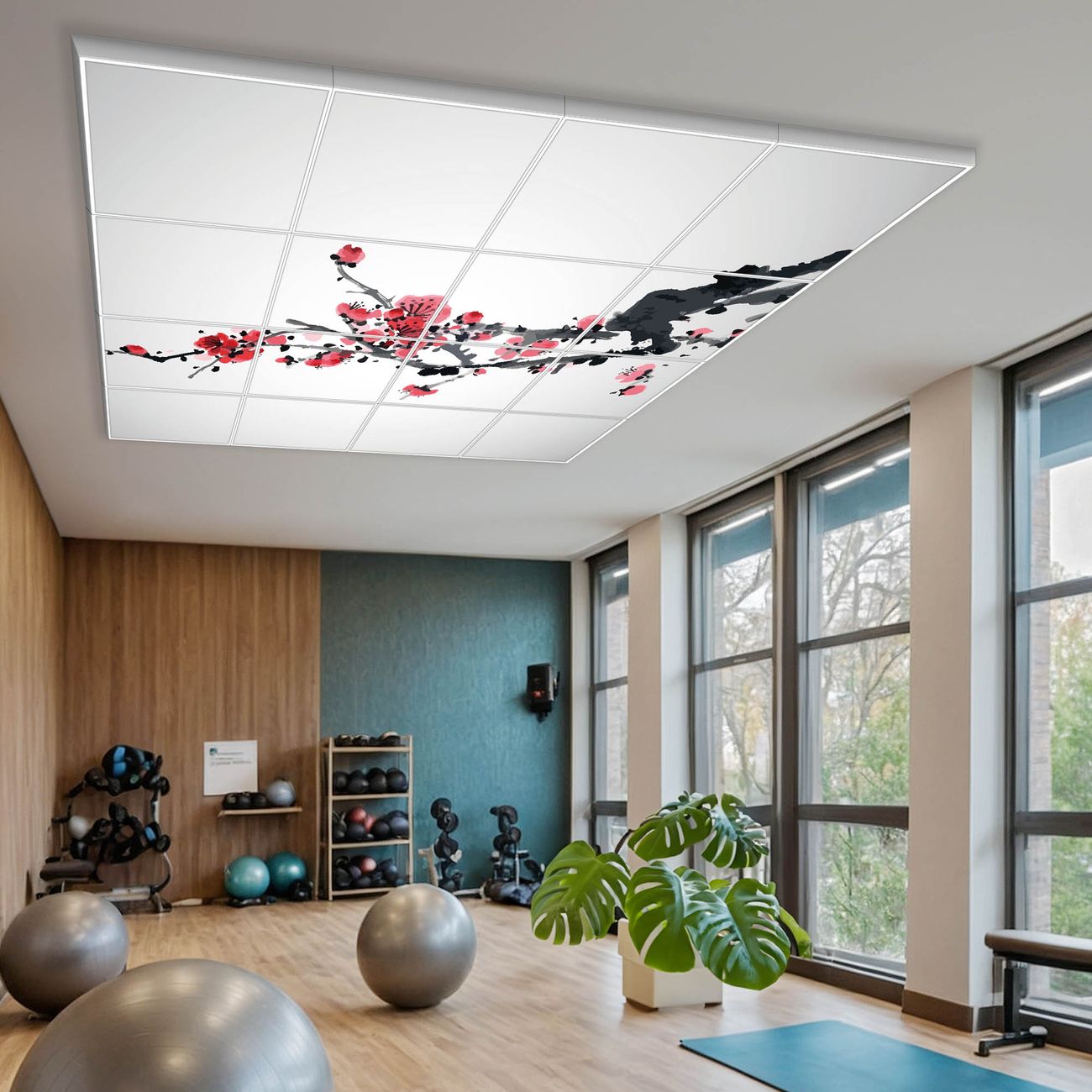 Entdecken Sie unsere vielseitigen Lichtdecken, hier in der Größe 248 x 248cm mit dem Motiv Motiv Japanische Blüten 2 - Ihre Beleuchtungslösung für jede Umgebung Beleuchten Sie Ihren Raum nicht nur, sondern schaffen Sie Atmosphäre! Die banjado Lichtdecke verwandelt jeden Ort, ob zu Hause, in Praxen, Büros oder Studios in eine Wohlfühloase. Unsere einzelnen Elemente haben eine genormte Einheitsgröße von 62 x 62cm und können somit in jede gängige Rasterdecken verbaut werden. So finden Sie Ihre passende Ausführung: Gern helfen wir Ihnen, die passende Ausführung zu wählen. Hierfür muss die aktuelle Gegebenheit Ihrer Decke oder Wand beachtet werden. Haben Sie bereits eine Rasterdecke (auch Odenwalddecke genannt)? Hier bestellen Sie lediglich das Motiv + Beleuchtungspanel, denn beides wird in die bereits vorhandene Decke eingelegt. Haben Sie eine glatte Decke mit Lichtauslass oder möchten die Lichtdecke an der Wand befestigen? Hier bestellen Sie bitte Motiv + Beleuchtungspanel + Deckenbefestigung, eine Aufbauanleitung liegt immer bei. Die Lichtdecke kann sowohl an der Decke als auch an der Wand montiert werden, perfekt für kreative Lichtakzente oder alternative Beleuchtungslösungen. Haben Sie bereits eine Lichtdecke und möchten nur das Motiv wechseln? Hier bestellen Sie bitte nur Motiv, der Wechsel ist denkbar einfach. Der Aufbau Ihrer banjado Lichtdecke gestaltet sich unkompliziert, dank einer verständlichen Anleitung, die Ihnen Schritt für Schritt durch den Montageprozess hilft. Für die endgültige Installation und den sicheren Anschluss empfehlen wir die Hinzuziehung eines Fachmanns, um die optimale Funktion und Sicherheit Ihrer Beleuchtung zu gewährleisten. Falls Sie einen Fachmann für die Installation benötigen, geben Sie uns gern Bescheid, wir vermitteln Ihnen gern einen geeigneten Ansprechpartner aus Ihrer Nähe. Steuerung: Steigern Sie Ihr Beleuchtungserlebnis mit der nahtlosen Integration in Ihr Smart Home. Durch die Kompatibilität mit der SmartLife App, Alexa und Google Assistant wird Ihr Smartphone zur zentralen Steuerungseinheit. Ihr Handy fungiert hierbei sozusagen als Fernbedienung. Legen Sie individuelle Lichtszenen in der App fest, die bei Aktivierung über den Wand-Ein-/Ausschalter immer wieder abgerufen werden können ohne Handy. Mit der Szenenfunktion in der Smart App können Sie die Beleuchtung personalisieren und steuern, sodass sie auf Ihre individuellen Bedürfnisse, Tagesrhythmus und Stimmung zugeschnitten ist. Beispielsweise können Sie sich in der Morgendämmerung durch ein sanftes Licht wecken lassen oder das Licht der Praxis werktags um 7 Uhr automatisch einschalten lassen. Dieses kann dann natürlich auch zu einer bestimmten Zeit automatisch ausgeschaltet werden. Motivwahl: Diese einzigartige Lichtdecke zeichnet sich durch ihre Fähigkeit aus, die Lichtfarbe je nach gewähltem Motiv anzupassen - ein Baum wirft ein sanftes grünes Licht, während eine Wolkendecke Ihren Raum in ein beruhigendes blaues Leuchten hüllt. Berücksichtigen Sie dies bitte bei Ihrer Motivauswahl. Sie können das Motiv jederzeit ohne großen Aufwand austauschen, ob nach Jahreszeit oder anderem Anlass, unsere Auswahl lässt kaum Wünsche offen. Wir fertigen Ihnen gern eine personalisierte Lichtdecke mit einem eigenen Motiv oder Logo oder Foto, schreiben Sie uns jederzeit an. Technische Daten: Das Motiv ist auf einer 4mm starken Acrylglas Scheibe aufgebracht, das Gesamtgewicht Ihrer Ausführung beträgt 78,9kg. Die Farbtemperatur lässt sich frei einstellen von 3000 bis 6000 Kelvin, damit können Sie stufenlos zwischen warmweiß, neutralweiß und kaltweiß wählen. Die Gesamtleistung bei Ihrer gewählten Ausführung beträgt 640W. Der Lichtstrom beträgt 3600 Lumen, die Nennspannung 230 V. Die Lichtdecke ist mit Schutzart IP20 für den Innenbereich konzipiert und sollte nicht im Nassbereich verwendet werden.