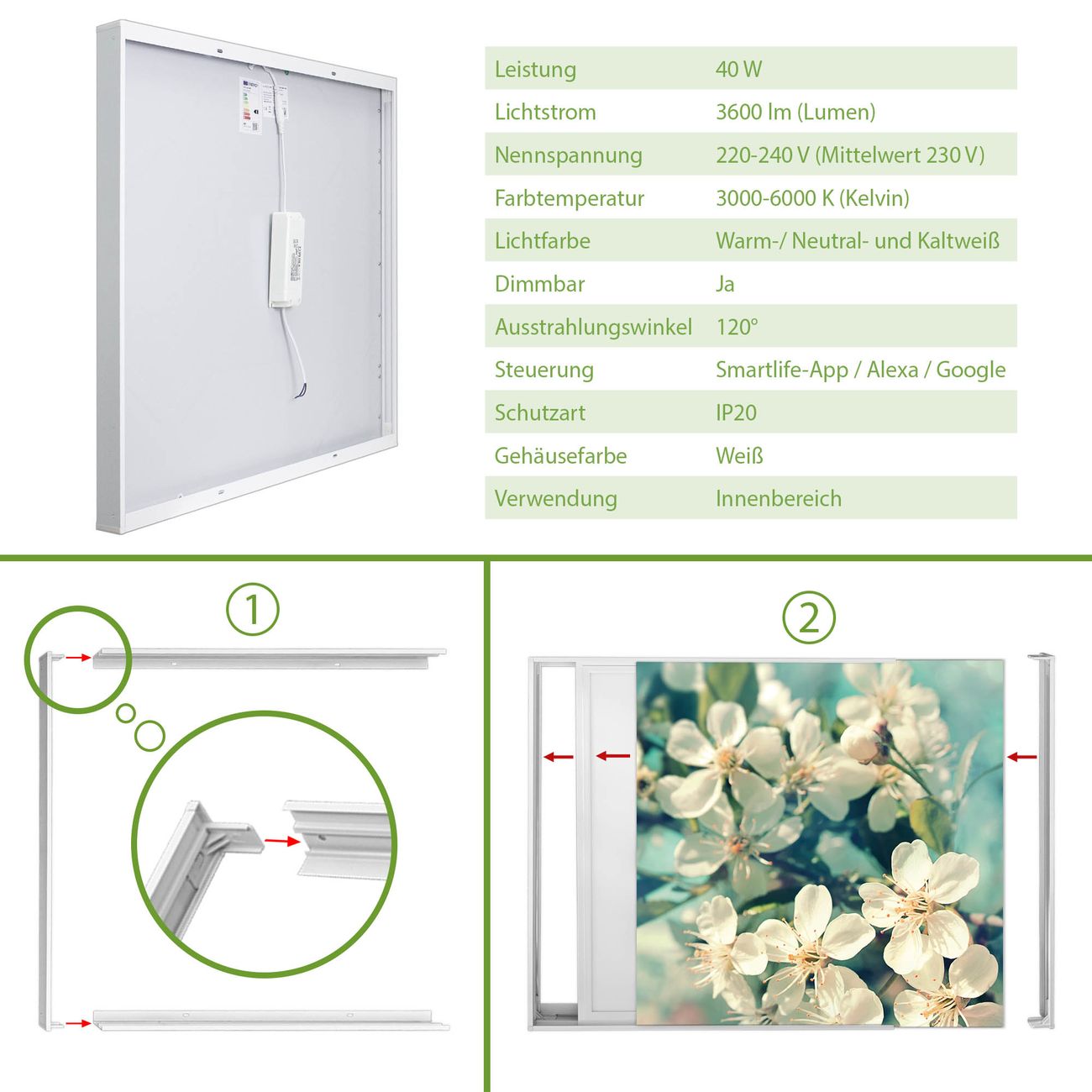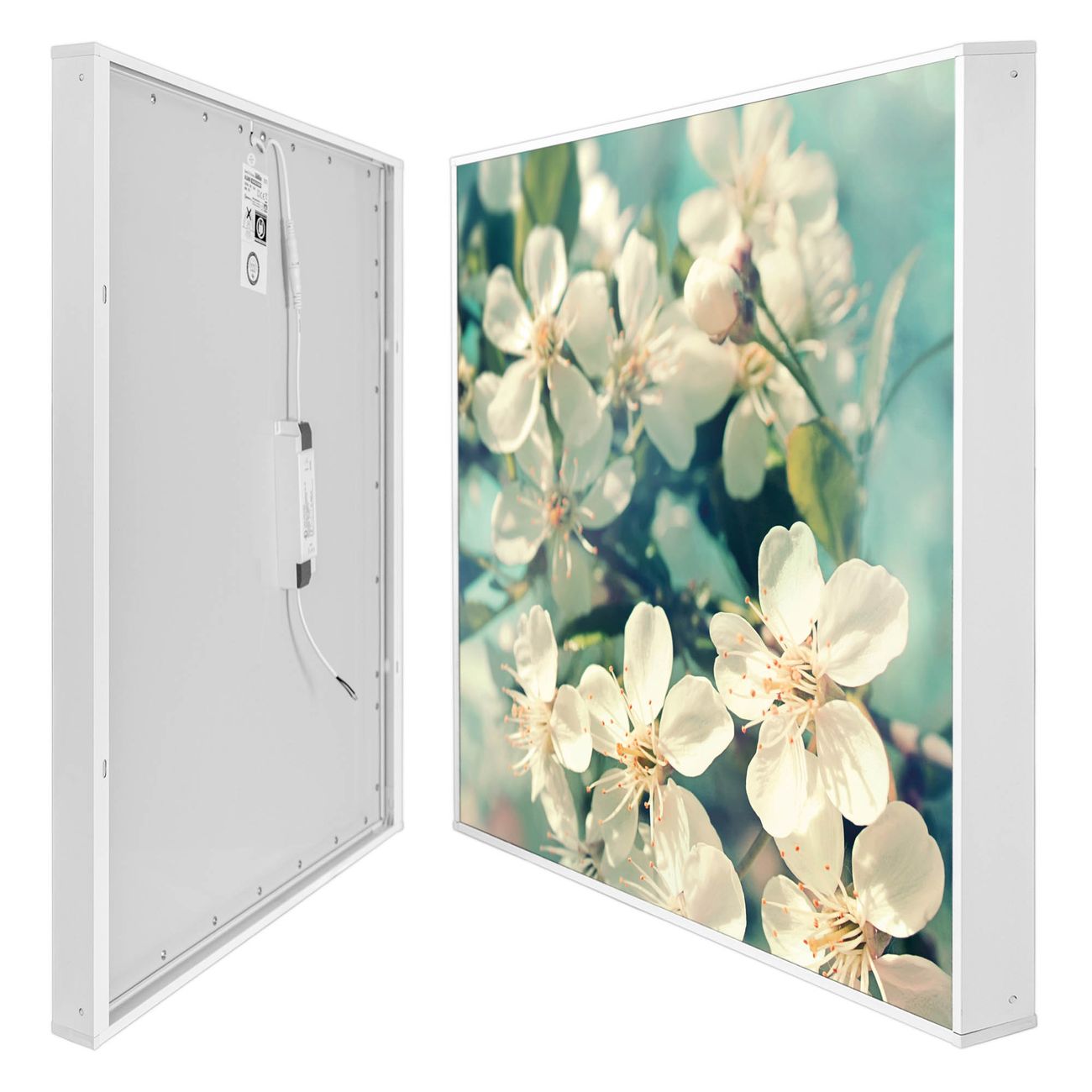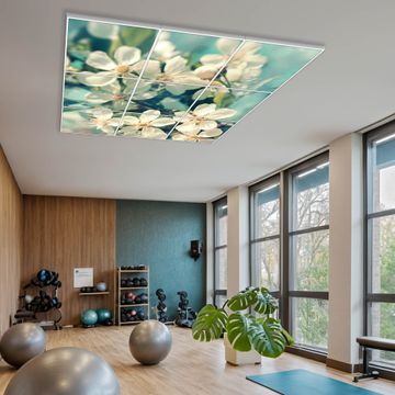 Entdecken Sie unsere vielseitigen Lichtdecken, hier in der Größe 186 x 186cm mit dem Motiv Motiv Kirschblüten 2 - Ihre Beleuchtungslösung für jede Umgebung Beleuchten Sie Ihren Raum nicht nur, sondern schaffen Sie Atmosphäre! Die banjado Lichtdecke verwandelt jeden Ort, ob zu Hause, in Praxen, Büros oder Studios in eine Wohlfühloase. Unsere einzelnen Elemente haben eine genormte Einheitsgröße von 62 x 62cm und können somit in jede gängige Rasterdecken verbaut werden. So finden Sie Ihre passende Ausführung: Gern helfen wir Ihnen, die passende Ausführung zu wählen. Hierfür muss die aktuelle Gegebenheit Ihrer Decke oder Wand beachtet werden. Haben Sie bereits eine Rasterdecke (auch Odenwalddecke genannt)? Hier bestellen Sie lediglich das Motiv + Beleuchtungspanel, denn beides wird in die bereits vorhandene Decke eingelegt. Haben Sie eine glatte Decke mit Lichtauslass oder möchten die Lichtdecke an der Wand befestigen? Hier bestellen Sie bitte Motiv + Beleuchtungspanel + Deckenbefestigung, eine Aufbauanleitung liegt immer bei. Die Lichtdecke kann sowohl an der Decke als auch an der Wand montiert werden, perfekt für kreative Lichtakzente oder alternative Beleuchtungslösungen. Haben Sie bereits eine Lichtdecke und möchten nur das Motiv wechseln? Hier bestellen Sie bitte nur Motiv, der Wechsel ist denkbar einfach. Der Aufbau Ihrer banjado Lichtdecke gestaltet sich unkompliziert, dank einer verständlichen Anleitung, die Ihnen Schritt für Schritt durch den Montageprozess hilft. Für die endgültige Installation und den sicheren Anschluss empfehlen wir die Hinzuziehung eines Fachmanns, um die optimale Funktion und Sicherheit Ihrer Beleuchtung zu gewährleisten. Falls Sie einen Fachmann für die Installation benötigen, geben Sie uns gern Bescheid, wir vermitteln Ihnen gern einen geeigneten Ansprechpartner aus Ihrer Nähe. Steuerung: Steigern Sie Ihr Beleuchtungserlebnis mit der nahtlosen Integration in Ihr Smart Home. Durch die Kompatibilität mit der SmartLife App, Alexa und Google Assistant wird Ihr Smartphone zur zentralen Steuerungseinheit. Ihr Handy fungiert hierbei sozusagen als Fernbedienung. Legen Sie individuelle Lichtszenen in der App fest, die bei Aktivierung über den Wand-Ein-/Ausschalter immer wieder abgerufen werden können ohne Handy. Mit der Szenenfunktion in der Smart App können Sie die Beleuchtung personalisieren und steuern, sodass sie auf Ihre individuellen Bedürfnisse, Tagesrhythmus und Stimmung zugeschnitten ist. Beispielsweise können Sie sich in der Morgendämmerung durch ein sanftes Licht wecken lassen oder das Licht der Praxis werktags um 7 Uhr automatisch einschalten lassen. Dieses kann dann natürlich auch zu einer bestimmten Zeit automatisch ausgeschaltet werden. Motivwahl: Diese einzigartige Lichtdecke zeichnet sich durch ihre Fähigkeit aus, die Lichtfarbe je nach gewähltem Motiv anzupassen - ein Baum wirft ein sanftes grünes Licht, während eine Wolkendecke Ihren Raum in ein beruhigendes blaues Leuchten hüllt. Berücksichtigen Sie dies bitte bei Ihrer Motivauswahl. Sie können das Motiv jederzeit ohne großen Aufwand austauschen, ob nach Jahreszeit oder anderem Anlass, unsere Auswahl lässt kaum Wünsche offen. Wir fertigen Ihnen gern eine personalisierte Lichtdecke mit einem eigenen Motiv oder Logo oder Foto, schreiben Sie uns jederzeit an. Technische Daten: Das Motiv ist auf einer 4mm starken Acrylglas Scheibe aufgebracht, das Gesamtgewicht Ihrer Ausführung beträgt 44,4kg. Die Farbtemperatur lässt sich frei einstellen von 3000 bis 6000 Kelvin, damit können Sie stufenlos zwischen warmweiß, neutralweiß und kaltweiß wählen. Die Gesamtleistung bei Ihrer gewählten Ausführung beträgt 360W. Der Lichtstrom beträgt 3600 Lumen, die Nennspannung 230 V. Die Lichtdecke ist mit Schutzart IP20 für den Innenbereich konzipiert und sollte nicht im Nassbereich verwendet werden.