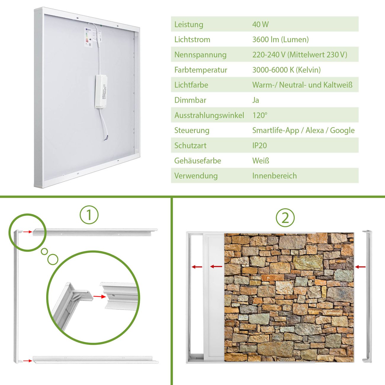Entdecken Sie unsere vielseitigen Lichtdecken, hier in der Größe 248 x 248cm mit dem Motiv Motiv Kleine Herzen - Ihre Beleuchtungslösung für jede Umgebung Beleuchten Sie Ihren Raum nicht nur, sondern schaffen Sie Atmosphäre! Die banjado Lichtdecke verwandelt jeden Ort, ob zu Hause, in Praxen, Büros oder Studios in eine Wohlfühloase. Unsere einzelnen Elemente haben eine genormte Einheitsgröße von 62 x 62cm und können somit in jede gängige Rasterdecken verbaut werden. So finden Sie Ihre passende Ausführung: Gern helfen wir Ihnen, die passende Ausführung zu wählen. Hierfür muss die aktuelle Gegebenheit Ihrer Decke oder Wand beachtet werden. Haben Sie bereits eine Rasterdecke (auch Odenwalddecke genannt)? Hier bestellen Sie lediglich das Motiv + Beleuchtungspanel, denn beides wird in die bereits vorhandene Decke eingelegt. Haben Sie eine glatte Decke mit Lichtauslass oder möchten die Lichtdecke an der Wand befestigen? Hier bestellen Sie bitte Motiv + Beleuchtungspanel + Deckenbefestigung, eine Aufbauanleitung liegt immer bei. Die Lichtdecke kann sowohl an der Decke als auch an der Wand montiert werden, perfekt für kreative Lichtakzente oder alternative Beleuchtungslösungen. Haben Sie bereits eine Lichtdecke und möchten nur das Motiv wechseln? Hier bestellen Sie bitte nur Motiv, der Wechsel ist denkbar einfach. Der Aufbau Ihrer banjado Lichtdecke gestaltet sich unkompliziert, dank einer verständlichen Anleitung, die Ihnen Schritt für Schritt durch den Montageprozess hilft. Für die endgültige Installation und den sicheren Anschluss empfehlen wir die Hinzuziehung eines Fachmanns, um die optimale Funktion und Sicherheit Ihrer Beleuchtung zu gewährleisten. Falls Sie einen Fachmann für die Installation benötigen, geben Sie uns gern Bescheid, wir vermitteln Ihnen gern einen geeigneten Ansprechpartner aus Ihrer Nähe. Steuerung: Steigern Sie Ihr Beleuchtungserlebnis mit der nahtlosen Integration in Ihr Smart Home. Durch die Kompatibilität mit der SmartLife App, Alexa und Google Assistant wird Ihr Smartphone zur zentralen Steuerungseinheit. Ihr Handy fungiert hierbei sozusagen als Fernbedienung. Legen Sie individuelle Lichtszenen in der App fest, die bei Aktivierung über den Wand-Ein-/Ausschalter immer wieder abgerufen werden können ohne Handy. Mit der Szenenfunktion in der Smart App können Sie die Beleuchtung personalisieren und steuern, sodass sie auf Ihre individuellen Bedürfnisse, Tagesrhythmus und Stimmung zugeschnitten ist. Beispielsweise können Sie sich in der Morgendämmerung durch ein sanftes Licht wecken lassen oder das Licht der Praxis werktags um 7 Uhr automatisch einschalten lassen. Dieses kann dann natürlich auch zu einer bestimmten Zeit automatisch ausgeschaltet werden. Motivwahl: Diese einzigartige Lichtdecke zeichnet sich durch ihre Fähigkeit aus, die Lichtfarbe je nach gewähltem Motiv anzupassen - ein Baum wirft ein sanftes grünes Licht, während eine Wolkendecke Ihren Raum in ein beruhigendes blaues Leuchten hüllt. Berücksichtigen Sie dies bitte bei Ihrer Motivauswahl. Sie können das Motiv jederzeit ohne großen Aufwand austauschen, ob nach Jahreszeit oder anderem Anlass, unsere Auswahl lässt kaum Wünsche offen. Wir fertigen Ihnen gern eine personalisierte Lichtdecke mit einem eigenen Motiv oder Logo oder Foto, schreiben Sie uns jederzeit an. Technische Daten: Das Motiv ist auf einer 4mm starken Acrylglas Scheibe aufgebracht, das Gesamtgewicht Ihrer Ausführung beträgt 36,2kg. Die Farbtemperatur lässt sich frei einstellen von 3000 bis 6000 Kelvin, damit können Sie stufenlos zwischen warmweiß, neutralweiß und kaltweiß wählen. Die Gesamtleistung bei Ihrer gewählten Ausführung beträgt 640W. Der Lichtstrom beträgt 3600 Lumen, die Nennspannung 230 V. Die Lichtdecke ist mit Schutzart IP20 für den Innenbereich konzipiert und sollte nicht im Nassbereich verwendet werden.