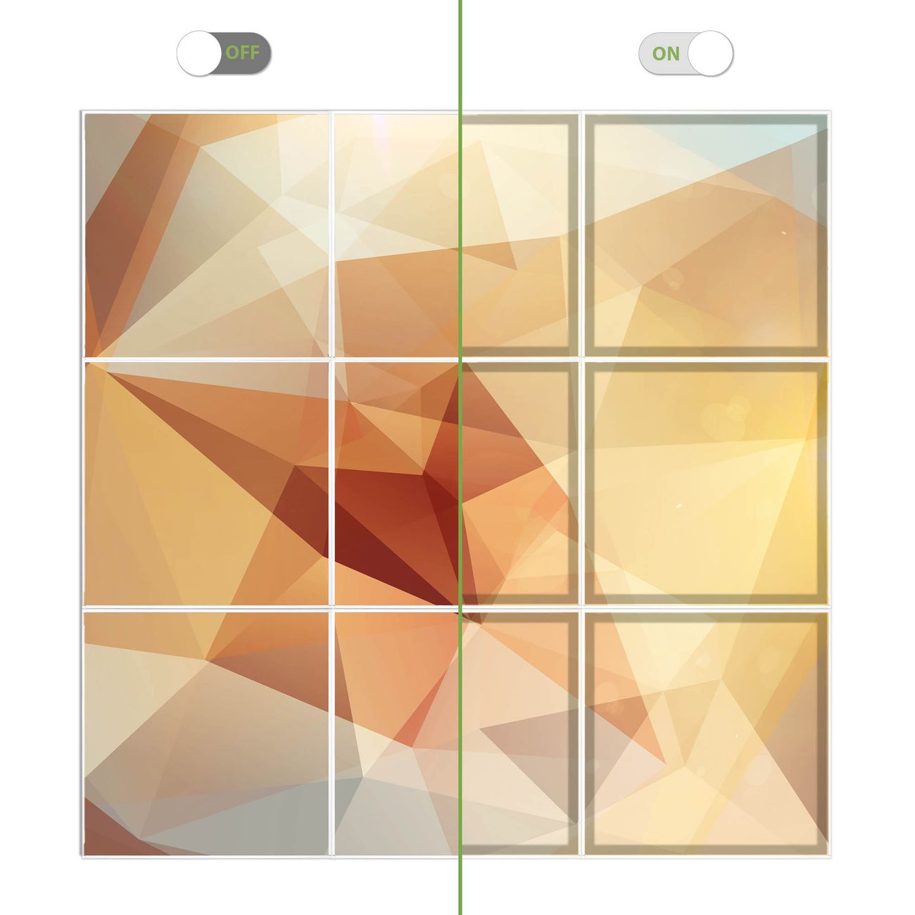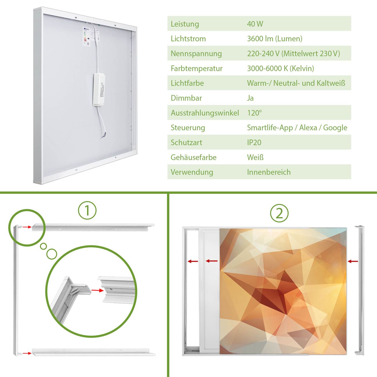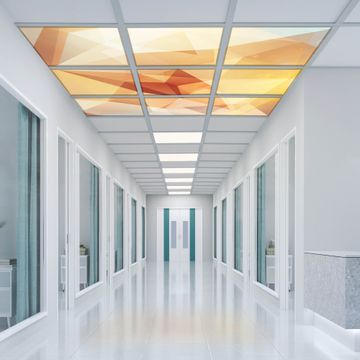 Entdecken Sie unsere vielseitigen Lichtdecken, hier in der Größe 186 x 186cm mit dem Motiv Motiv Kristall - Ihre Beleuchtungslösung für jede Umgebung Beleuchten Sie Ihren Raum nicht nur, sondern schaffen Sie Atmosphäre! Die banjado Lichtdecke verwandelt jeden Ort, ob zu Hause, in Praxen, Büros oder Studios in eine Wohlfühloase. Unsere einzelnen Elemente haben eine genormte Einheitsgröße von 62 x 62cm und können somit in jede gängige Rasterdecken verbaut werden. So finden Sie Ihre passende Ausführung: Gern helfen wir Ihnen, die passende Ausführung zu wählen. Hierfür muss die aktuelle Gegebenheit Ihrer Decke oder Wand beachtet werden. Haben Sie bereits eine Rasterdecke (auch Odenwalddecke genannt)? Hier bestellen Sie lediglich das Motiv + Beleuchtungspanel, denn beides wird in die bereits vorhandene Decke eingelegt. Haben Sie eine glatte Decke mit Lichtauslass oder möchten die Lichtdecke an der Wand befestigen? Hier bestellen Sie bitte Motiv + Beleuchtungspanel + Deckenbefestigung, eine Aufbauanleitung liegt immer bei. Die Lichtdecke kann sowohl an der Decke als auch an der Wand montiert werden, perfekt für kreative Lichtakzente oder alternative Beleuchtungslösungen. Haben Sie bereits eine Lichtdecke und möchten nur das Motiv wechseln? Hier bestellen Sie bitte nur Motiv, der Wechsel ist denkbar einfach. Der Aufbau Ihrer banjado Lichtdecke gestaltet sich unkompliziert, dank einer verständlichen Anleitung, die Ihnen Schritt für Schritt durch den Montageprozess hilft. Für die endgültige Installation und den sicheren Anschluss empfehlen wir die Hinzuziehung eines Fachmanns, um die optimale Funktion und Sicherheit Ihrer Beleuchtung zu gewährleisten. Falls Sie einen Fachmann für die Installation benötigen, geben Sie uns gern Bescheid, wir vermitteln Ihnen gern einen geeigneten Ansprechpartner aus Ihrer Nähe. Steuerung: Steigern Sie Ihr Beleuchtungserlebnis mit der nahtlosen Integration in Ihr Smart Home. Durch die Kompatibilität mit der SmartLife App, Alexa und Google Assistant wird Ihr Smartphone zur zentralen Steuerungseinheit. Ihr Handy fungiert hierbei sozusagen als Fernbedienung. Legen Sie individuelle Lichtszenen in der App fest, die bei Aktivierung über den Wand-Ein-/Ausschalter immer wieder abgerufen werden können ohne Handy. Mit der Szenenfunktion in der Smart App können Sie die Beleuchtung personalisieren und steuern, sodass sie auf Ihre individuellen Bedürfnisse, Tagesrhythmus und Stimmung zugeschnitten ist. Beispielsweise können Sie sich in der Morgendämmerung durch ein sanftes Licht wecken lassen oder das Licht der Praxis werktags um 7 Uhr automatisch einschalten lassen. Dieses kann dann natürlich auch zu einer bestimmten Zeit automatisch ausgeschaltet werden. Motivwahl: Diese einzigartige Lichtdecke zeichnet sich durch ihre Fähigkeit aus, die Lichtfarbe je nach gewähltem Motiv anzupassen - ein Baum wirft ein sanftes grünes Licht, während eine Wolkendecke Ihren Raum in ein beruhigendes blaues Leuchten hüllt. Berücksichtigen Sie dies bitte bei Ihrer Motivauswahl. Sie können das Motiv jederzeit ohne großen Aufwand austauschen, ob nach Jahreszeit oder anderem Anlass, unsere Auswahl lässt kaum Wünsche offen. Wir fertigen Ihnen gern eine personalisierte Lichtdecke mit einem eigenen Motiv oder Logo oder Foto, schreiben Sie uns jederzeit an. Technische Daten: Das Motiv ist auf einer 4mm starken Acrylglas Scheibe aufgebracht, das Gesamtgewicht Ihrer Ausführung beträgt 20,4kg. Die Farbtemperatur lässt sich frei einstellen von 3000 bis 6000 Kelvin, damit können Sie stufenlos zwischen warmweiß, neutralweiß und kaltweiß wählen. Die Gesamtleistung bei Ihrer gewählten Ausführung beträgt 360W. Der Lichtstrom beträgt 3600 Lumen, die Nennspannung 230 V. Die Lichtdecke ist mit Schutzart IP20 für den Innenbereich konzipiert und sollte nicht im Nassbereich verwendet werden.