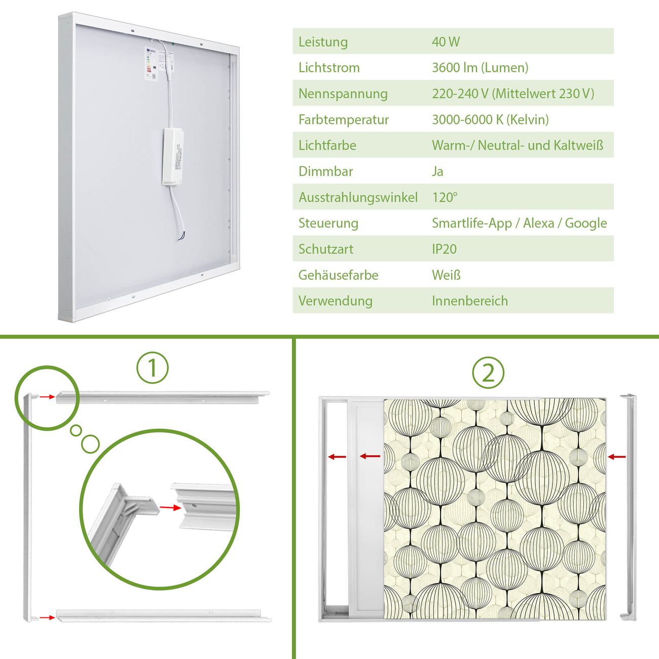 Entdecken Sie unsere vielseitigen Lichtdecken, hier in der Größe 186 x 62cm mit dem Motiv Motiv Lampions - Ihre Beleuchtungslösung für jede Umgebung Beleuchten Sie Ihren Raum nicht nur, sondern schaffen Sie Atmosphäre! Die banjado Lichtdecke verwandelt jeden Ort, ob zu Hause, in Praxen, Büros oder Studios in eine Wohlfühloase. Unsere einzelnen Elemente haben eine genormte Einheitsgröße von 62 x 62cm und können somit in jede gängige Rasterdecken verbaut werden. So finden Sie Ihre passende Ausführung: Gern helfen wir Ihnen, die passende Ausführung zu wählen. Hierfür muss die aktuelle Gegebenheit Ihrer Decke oder Wand beachtet werden. Haben Sie bereits eine Rasterdecke (auch Odenwalddecke genannt)? Hier bestellen Sie lediglich das Motiv + Beleuchtungspanel, denn beides wird in die bereits vorhandene Decke eingelegt. Haben Sie eine glatte Decke mit Lichtauslass oder möchten die Lichtdecke an der Wand befestigen? Hier bestellen Sie bitte Motiv + Beleuchtungspanel + Deckenbefestigung, eine Aufbauanleitung liegt immer bei. Die Lichtdecke kann sowohl an der Decke als auch an der Wand montiert werden, perfekt für kreative Lichtakzente oder alternative Beleuchtungslösungen. Haben Sie bereits eine Lichtdecke und möchten nur das Motiv wechseln? Hier bestellen Sie bitte nur Motiv, der Wechsel ist denkbar einfach. Der Aufbau Ihrer banjado Lichtdecke gestaltet sich unkompliziert, dank einer verständlichen Anleitung, die Ihnen Schritt für Schritt durch den Montageprozess hilft. Für die endgültige Installation und den sicheren Anschluss empfehlen wir die Hinzuziehung eines Fachmanns, um die optimale Funktion und Sicherheit Ihrer Beleuchtung zu gewährleisten. Falls Sie einen Fachmann für die Installation benötigen, geben Sie uns gern Bescheid, wir vermitteln Ihnen gern einen geeigneten Ansprechpartner aus Ihrer Nähe. Steuerung: Steigern Sie Ihr Beleuchtungserlebnis mit der nahtlosen Integration in Ihr Smart Home. Durch die Kompatibilität mit der SmartLife App, Alexa und Google Assistant wird Ihr Smartphone zur zentralen Steuerungseinheit. Ihr Handy fungiert hierbei sozusagen als Fernbedienung. Legen Sie individuelle Lichtszenen in der App fest, die bei Aktivierung über den Wand-Ein-/Ausschalter immer wieder abgerufen werden können ohne Handy. Mit der Szenenfunktion in der Smart App können Sie die Beleuchtung personalisieren und steuern, sodass sie auf Ihre individuellen Bedürfnisse, Tagesrhythmus und Stimmung zugeschnitten ist. Beispielsweise können Sie sich in der Morgendämmerung durch ein sanftes Licht wecken lassen oder das Licht der Praxis werktags um 7 Uhr automatisch einschalten lassen. Dieses kann dann natürlich auch zu einer bestimmten Zeit automatisch ausgeschaltet werden. Motivwahl: Diese einzigartige Lichtdecke zeichnet sich durch ihre Fähigkeit aus, die Lichtfarbe je nach gewähltem Motiv anzupassen - ein Baum wirft ein sanftes grünes Licht, während eine Wolkendecke Ihren Raum in ein beruhigendes blaues Leuchten hüllt. Berücksichtigen Sie dies bitte bei Ihrer Motivauswahl. Sie können das Motiv jederzeit ohne großen Aufwand austauschen, ob nach Jahreszeit oder anderem Anlass, unsere Auswahl lässt kaum Wünsche offen. Wir fertigen Ihnen gern eine personalisierte Lichtdecke mit einem eigenen Motiv oder Logo oder Foto, schreiben Sie uns jederzeit an. Technische Daten: Das Motiv ist auf einer 4mm starken Acrylglas Scheibe aufgebracht, das Gesamtgewicht Ihrer Ausführung beträgt 13,3kg. Die Farbtemperatur lässt sich frei einstellen von 3000 bis 6000 Kelvin, damit können Sie stufenlos zwischen warmweiß, neutralweiß und kaltweiß wählen. Die Gesamtleistung bei Ihrer gewählten Ausführung beträgt 120W. Der Lichtstrom beträgt 3600 Lumen, die Nennspannung 230 V. Die Lichtdecke ist mit Schutzart IP20 für den Innenbereich konzipiert und sollte nicht im Nassbereich verwendet werden.