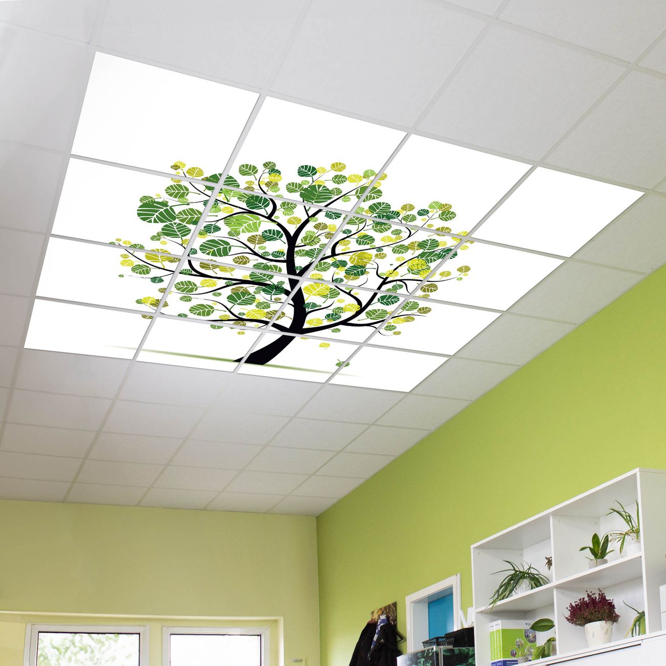 Entdecken Sie unsere vielseitigen Lichtdecken, hier in der Größe 248 x 248cm mit dem Motiv Motiv Laubzauberbaum - Ihre Beleuchtungslösung für jede Umgebung Beleuchten Sie Ihren Raum nicht nur, sondern schaffen Sie Atmosphäre! Die banjado Lichtdecke verwandelt jeden Ort, ob zu Hause, in Praxen, Büros oder Studios in eine Wohlfühloase. Unsere einzelnen Elemente haben eine genormte Einheitsgröße von 62 x 62cm und können somit in jede gängige Rasterdecken verbaut werden. So finden Sie Ihre passende Ausführung: Gern helfen wir Ihnen, die passende Ausführung zu wählen. Hierfür muss die aktuelle Gegebenheit Ihrer Decke oder Wand beachtet werden. Haben Sie bereits eine Rasterdecke (auch Odenwalddecke genannt)? Hier bestellen Sie lediglich das Motiv + Beleuchtungspanel, denn beides wird in die bereits vorhandene Decke eingelegt. Haben Sie eine glatte Decke mit Lichtauslass oder möchten die Lichtdecke an der Wand befestigen? Hier bestellen Sie bitte Motiv + Beleuchtungspanel + Deckenbefestigung, eine Aufbauanleitung liegt immer bei. Die Lichtdecke kann sowohl an der Decke als auch an der Wand montiert werden, perfekt für kreative Lichtakzente oder alternative Beleuchtungslösungen. Haben Sie bereits eine Lichtdecke und möchten nur das Motiv wechseln? Hier bestellen Sie bitte nur Motiv, der Wechsel ist denkbar einfach. Der Aufbau Ihrer banjado Lichtdecke gestaltet sich unkompliziert, dank einer verständlichen Anleitung, die Ihnen Schritt für Schritt durch den Montageprozess hilft. Für die endgültige Installation und den sicheren Anschluss empfehlen wir die Hinzuziehung eines Fachmanns, um die optimale Funktion und Sicherheit Ihrer Beleuchtung zu gewährleisten. Falls Sie einen Fachmann für die Installation benötigen, geben Sie uns gern Bescheid, wir vermitteln Ihnen gern einen geeigneten Ansprechpartner aus Ihrer Nähe. Steuerung: Steigern Sie Ihr Beleuchtungserlebnis mit der nahtlosen Integration in Ihr Smart Home. Durch die Kompatibilität mit der SmartLife App, Alexa und Google Assistant wird Ihr Smartphone zur zentralen Steuerungseinheit. Ihr Handy fungiert hierbei sozusagen als Fernbedienung. Legen Sie individuelle Lichtszenen in der App fest, die bei Aktivierung über den Wand-Ein-/Ausschalter immer wieder abgerufen werden können ohne Handy. Mit der Szenenfunktion in der Smart App können Sie die Beleuchtung personalisieren und steuern, sodass sie auf Ihre individuellen Bedürfnisse, Tagesrhythmus und Stimmung zugeschnitten ist. Beispielsweise können Sie sich in der Morgendämmerung durch ein sanftes Licht wecken lassen oder das Licht der Praxis werktags um 7 Uhr automatisch einschalten lassen. Dieses kann dann natürlich auch zu einer bestimmten Zeit automatisch ausgeschaltet werden. Motivwahl: Diese einzigartige Lichtdecke zeichnet sich durch ihre Fähigkeit aus, die Lichtfarbe je nach gewähltem Motiv anzupassen - ein Baum wirft ein sanftes grünes Licht, während eine Wolkendecke Ihren Raum in ein beruhigendes blaues Leuchten hüllt. Berücksichtigen Sie dies bitte bei Ihrer Motivauswahl. Sie können das Motiv jederzeit ohne großen Aufwand austauschen, ob nach Jahreszeit oder anderem Anlass, unsere Auswahl lässt kaum Wünsche offen. Wir fertigen Ihnen gern eine personalisierte Lichtdecke mit einem eigenen Motiv oder Logo oder Foto, schreiben Sie uns jederzeit an. Technische Daten: Das Motiv ist auf einer 4mm starken Acrylglas Scheibe aufgebracht, das Gesamtgewicht Ihrer Ausführung beträgt 70,9kg. Die Farbtemperatur lässt sich frei einstellen von 3000 bis 6000 Kelvin, damit können Sie stufenlos zwischen warmweiß, neutralweiß und kaltweiß wählen. Die Gesamtleistung bei Ihrer gewählten Ausführung beträgt 640W. Der Lichtstrom beträgt 3600 Lumen, die Nennspannung 230 V. Die Lichtdecke ist mit Schutzart IP20 für den Innenbereich konzipiert und sollte nicht im Nassbereich verwendet werden.