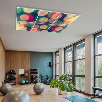 Entdecken Sie unsere vielseitigen Lichtdecken, hier in der Größe 186 x 124cm mit dem Motiv Motiv Lichtpunkte Weiß Grün Rot - Ihre Beleuchtungslösung für jede Umgebung Beleuchten Sie Ihren Raum nicht nur, sondern schaffen Sie Atmosphäre! Die banjado Lichtdecke verwandelt jeden Ort, ob zu Hause, in Praxen, Büros oder Studios in eine Wohlfühloase. Unsere einzelnen Elemente haben eine genormte Einheitsgröße von 62 x 62cm und können somit in jede gängige Rasterdecken verbaut werden. So finden Sie Ihre passende Ausführung: Gern helfen wir Ihnen, die passende Ausführung zu wählen. Hierfür muss die aktuelle Gegebenheit Ihrer Decke oder Wand beachtet werden. Haben Sie bereits eine Rasterdecke (auch Odenwalddecke genannt)? Hier bestellen Sie lediglich das Motiv + Beleuchtungspanel, denn beides wird in die bereits vorhandene Decke eingelegt. Haben Sie eine glatte Decke mit Lichtauslass oder möchten die Lichtdecke an der Wand befestigen? Hier bestellen Sie bitte Motiv + Beleuchtungspanel + Deckenbefestigung, eine Aufbauanleitung liegt immer bei. Die Lichtdecke kann sowohl an der Decke als auch an der Wand montiert werden, perfekt für kreative Lichtakzente oder alternative Beleuchtungslösungen. Haben Sie bereits eine Lichtdecke und möchten nur das Motiv wechseln? Hier bestellen Sie bitte nur Motiv, der Wechsel ist denkbar einfach. Der Aufbau Ihrer banjado Lichtdecke gestaltet sich unkompliziert, dank einer verständlichen Anleitung, die Ihnen Schritt für Schritt durch den Montageprozess hilft. Für die endgültige Installation und den sicheren Anschluss empfehlen wir die Hinzuziehung eines Fachmanns, um die optimale Funktion und Sicherheit Ihrer Beleuchtung zu gewährleisten. Falls Sie einen Fachmann für die Installation benötigen, geben Sie uns gern Bescheid, wir vermitteln Ihnen gern einen geeigneten Ansprechpartner aus Ihrer Nähe. Steuerung: Steigern Sie Ihr Beleuchtungserlebnis mit der nahtlosen Integration in Ihr Smart Home. Durch die Kompatibilität mit der SmartLife App, Alexa und Google Assistant wird Ihr Smartphone zur zentralen Steuerungseinheit. Ihr Handy fungiert hierbei sozusagen als Fernbedienung. Legen Sie individuelle Lichtszenen in der App fest, die bei Aktivierung über den Wand-Ein-/Ausschalter immer wieder abgerufen werden können ohne Handy. Mit der Szenenfunktion in der Smart App können Sie die Beleuchtung personalisieren und steuern, sodass sie auf Ihre individuellen Bedürfnisse, Tagesrhythmus und Stimmung zugeschnitten ist. Beispielsweise können Sie sich in der Morgendämmerung durch ein sanftes Licht wecken lassen oder das Licht der Praxis werktags um 7 Uhr automatisch einschalten lassen. Dieses kann dann natürlich auch zu einer bestimmten Zeit automatisch ausgeschaltet werden. Motivwahl: Diese einzigartige Lichtdecke zeichnet sich durch ihre Fähigkeit aus, die Lichtfarbe je nach gewähltem Motiv anzupassen - ein Baum wirft ein sanftes grünes Licht, während eine Wolkendecke Ihren Raum in ein beruhigendes blaues Leuchten hüllt. Berücksichtigen Sie dies bitte bei Ihrer Motivauswahl. Sie können das Motiv jederzeit ohne großen Aufwand austauschen, ob nach Jahreszeit oder anderem Anlass, unsere Auswahl lässt kaum Wünsche offen. Wir fertigen Ihnen gern eine personalisierte Lichtdecke mit einem eigenen Motiv oder Logo oder Foto, schreiben Sie uns jederzeit an. Technische Daten: Das Motiv ist auf einer 4mm starken Acrylglas Scheibe aufgebracht, das Gesamtgewicht Ihrer Ausführung beträgt 29,6kg. Die Farbtemperatur lässt sich frei einstellen von 3000 bis 6000 Kelvin, damit können Sie stufenlos zwischen warmweiß, neutralweiß und kaltweiß wählen. Die Gesamtleistung bei Ihrer gewählten Ausführung beträgt 240W. Der Lichtstrom beträgt 3600 Lumen, die Nennspannung 230 V. Die Lichtdecke ist mit Schutzart IP20 für den Innenbereich konzipiert und sollte nicht im Nassbereich verwendet werden.