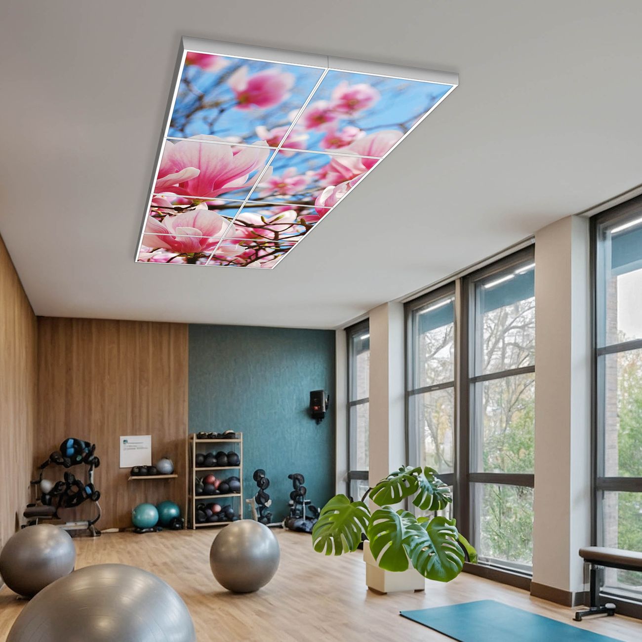 Entdecken Sie unsere vielseitigen Lichtdecken, hier in der Größe 124 x 248cm mit dem Motiv Motiv Magnolienbaum - Ihre Beleuchtungslösung für jede Umgebung Beleuchten Sie Ihren Raum nicht nur, sondern schaffen Sie Atmosphäre! Die banjado Lichtdecke verwandelt jeden Ort, ob zu Hause, in Praxen, Büros oder Studios in eine Wohlfühloase. Unsere einzelnen Elemente haben eine genormte Einheitsgröße von 62 x 62cm und können somit in jede gängige Rasterdecken verbaut werden. So finden Sie Ihre passende Ausführung: Gern helfen wir Ihnen, die passende Ausführung zu wählen. Hierfür muss die aktuelle Gegebenheit Ihrer Decke oder Wand beachtet werden. Haben Sie bereits eine Rasterdecke (auch Odenwalddecke genannt)? Hier bestellen Sie lediglich das Motiv + Beleuchtungspanel, denn beides wird in die bereits vorhandene Decke eingelegt. Haben Sie eine glatte Decke mit Lichtauslass oder möchten die Lichtdecke an der Wand befestigen? Hier bestellen Sie bitte Motiv + Beleuchtungspanel + Deckenbefestigung, eine Aufbauanleitung liegt immer bei. Die Lichtdecke kann sowohl an der Decke als auch an der Wand montiert werden, perfekt für kreative Lichtakzente oder alternative Beleuchtungslösungen. Haben Sie bereits eine Lichtdecke und möchten nur das Motiv wechseln? Hier bestellen Sie bitte nur Motiv, der Wechsel ist denkbar einfach. Der Aufbau Ihrer banjado Lichtdecke gestaltet sich unkompliziert, dank einer verständlichen Anleitung, die Ihnen Schritt für Schritt durch den Montageprozess hilft. Für die endgültige Installation und den sicheren Anschluss empfehlen wir die Hinzuziehung eines Fachmanns, um die optimale Funktion und Sicherheit Ihrer Beleuchtung zu gewährleisten. Falls Sie einen Fachmann für die Installation benötigen, geben Sie uns gern Bescheid, wir vermitteln Ihnen gern einen geeigneten Ansprechpartner aus Ihrer Nähe. Steuerung: Steigern Sie Ihr Beleuchtungserlebnis mit der nahtlosen Integration in Ihr Smart Home. Durch die Kompatibilität mit der SmartLife App, Alexa und Google Assistant wird Ihr Smartphone zur zentralen Steuerungseinheit. Ihr Handy fungiert hierbei sozusagen als Fernbedienung. Legen Sie individuelle Lichtszenen in der App fest, die bei Aktivierung über den Wand-Ein-/Ausschalter immer wieder abgerufen werden können ohne Handy. Mit der Szenenfunktion in der Smart App können Sie die Beleuchtung personalisieren und steuern, sodass sie auf Ihre individuellen Bedürfnisse, Tagesrhythmus und Stimmung zugeschnitten ist. Beispielsweise können Sie sich in der Morgendämmerung durch ein sanftes Licht wecken lassen oder das Licht der Praxis werktags um 7 Uhr automatisch einschalten lassen. Dieses kann dann natürlich auch zu einer bestimmten Zeit automatisch ausgeschaltet werden. Motivwahl: Diese einzigartige Lichtdecke zeichnet sich durch ihre Fähigkeit aus, die Lichtfarbe je nach gewähltem Motiv anzupassen - ein Baum wirft ein sanftes grünes Licht, während eine Wolkendecke Ihren Raum in ein beruhigendes blaues Leuchten hüllt. Berücksichtigen Sie dies bitte bei Ihrer Motivauswahl. Sie können das Motiv jederzeit ohne großen Aufwand austauschen, ob nach Jahreszeit oder anderem Anlass, unsere Auswahl lässt kaum Wünsche offen. Wir fertigen Ihnen gern eine personalisierte Lichtdecke mit einem eigenen Motiv oder Logo oder Foto, schreiben Sie uns jederzeit an. Technische Daten: Das Motiv ist auf einer 4mm starken Acrylglas Scheibe aufgebracht, das Gesamtgewicht Ihrer Ausführung beträgt 39,4kg. Die Farbtemperatur lässt sich frei einstellen von 3000 bis 6000 Kelvin, damit können Sie stufenlos zwischen warmweiß, neutralweiß und kaltweiß wählen. Die Gesamtleistung bei Ihrer gewählten Ausführung beträgt 320W. Der Lichtstrom beträgt 3600 Lumen, die Nennspannung 230 V. Die Lichtdecke ist mit Schutzart IP20 für den Innenbereich konzipiert und sollte nicht im Nassbereich verwendet werden.