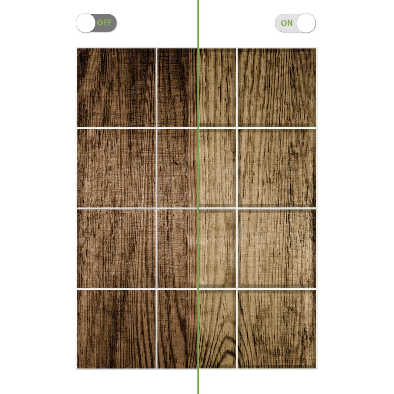 Motiv Maserung Dunkel Nr. 11317 Größe: 186x248x0,3cm BxHxT Gewicht: ca. 22,80 kg Material: Acylglas, hochwertig bedruckte Premiumfolie Druck: farbbrilliant, hochauflösend Stärke Glas: 4mm Acylglas Einzelelement: 62x62cm groß