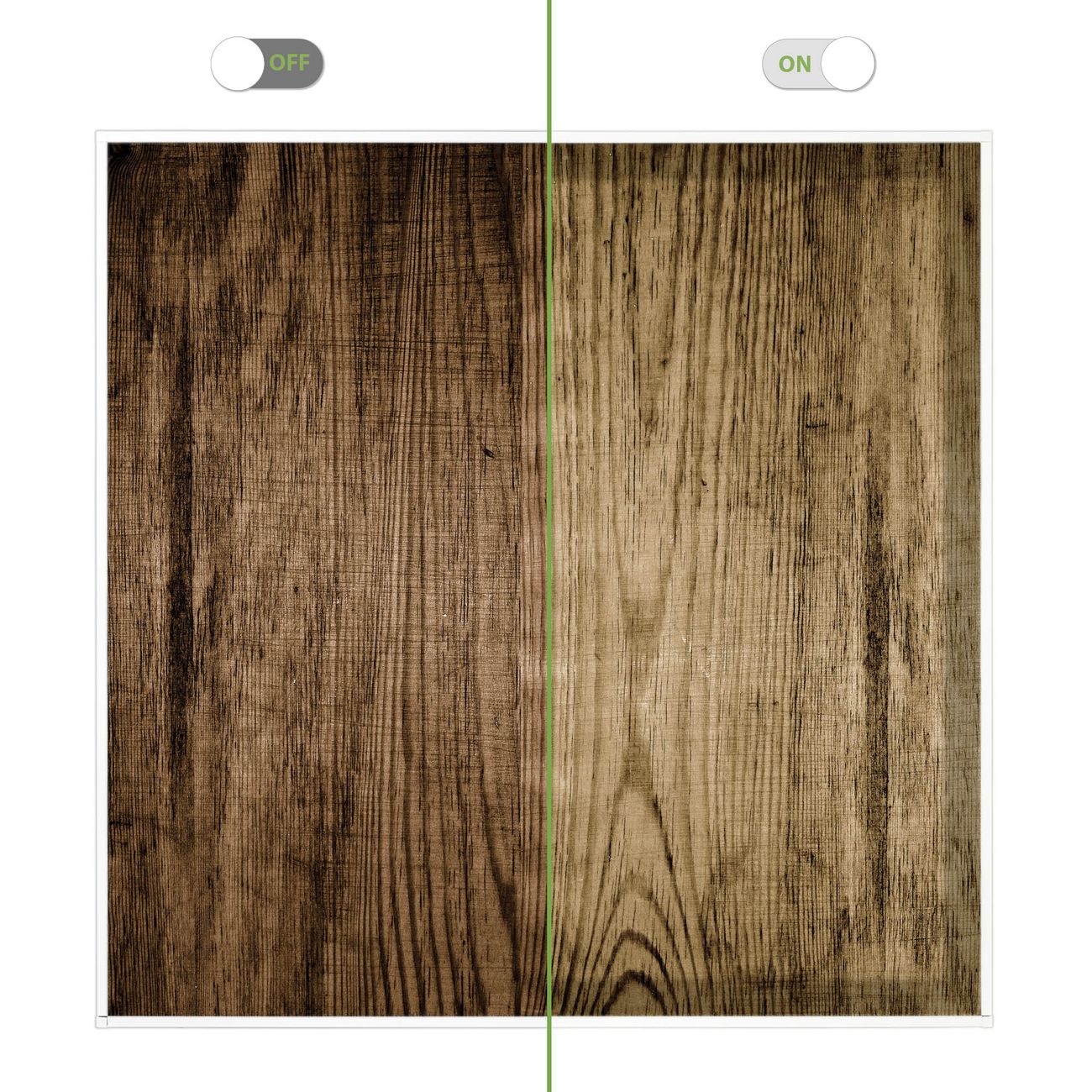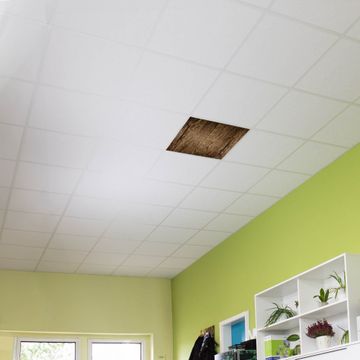 Entdecken Sie unsere vielseitigen Lichtdecken, hier in der Größe 62 x 62cm mit dem Motiv Motiv Maserung Dunkel - Ihre Beleuchtungslösung für jede Umgebung Beleuchten Sie Ihren Raum nicht nur, sondern schaffen Sie Atmosphäre! Die banjado Lichtdecke verwandelt jeden Ort, ob zu Hause, in Praxen, Büros oder Studios in eine Wohlfühloase. Unsere einzelnen Elemente haben eine genormte Einheitsgröße von 62 x 62cm und können somit in jede gängige Rasterdecken verbaut werden. So finden Sie Ihre passende Ausführung: Gern helfen wir Ihnen, die passende Ausführung zu wählen. Hierfür muss die aktuelle Gegebenheit Ihrer Decke oder Wand beachtet werden. Haben Sie bereits eine Rasterdecke (auch Odenwalddecke genannt)? Hier bestellen Sie lediglich das Motiv + Beleuchtungspanel, denn beides wird in die bereits vorhandene Decke eingelegt. Haben Sie eine glatte Decke mit Lichtauslass oder möchten die Lichtdecke an der Wand befestigen? Hier bestellen Sie bitte Motiv + Beleuchtungspanel + Deckenbefestigung, eine Aufbauanleitung liegt immer bei. Die Lichtdecke kann sowohl an der Decke als auch an der Wand montiert werden, perfekt für kreative Lichtakzente oder alternative Beleuchtungslösungen. Haben Sie bereits eine Lichtdecke und möchten nur das Motiv wechseln? Hier bestellen Sie bitte nur Motiv, der Wechsel ist denkbar einfach. Der Aufbau Ihrer banjado Lichtdecke gestaltet sich unkompliziert, dank einer verständlichen Anleitung, die Ihnen Schritt für Schritt durch den Montageprozess hilft. Für die endgültige Installation und den sicheren Anschluss empfehlen wir die Hinzuziehung eines Fachmanns, um die optimale Funktion und Sicherheit Ihrer Beleuchtung zu gewährleisten. Falls Sie einen Fachmann für die Installation benötigen, geben Sie uns gern Bescheid, wir vermitteln Ihnen gern einen geeigneten Ansprechpartner aus Ihrer Nähe. Steuerung: Steigern Sie Ihr Beleuchtungserlebnis mit der nahtlosen Integration in Ihr Smart Home. Durch die Kompatibilität mit der SmartLife App, Alexa und Google Assistant wird Ihr Smartphone zur zentralen Steuerungseinheit. Ihr Handy fungiert hierbei sozusagen als Fernbedienung. Legen Sie individuelle Lichtszenen in der App fest, die bei Aktivierung über den Wand-Ein-/Ausschalter immer wieder abgerufen werden können ohne Handy. Mit der Szenenfunktion in der Smart App können Sie die Beleuchtung personalisieren und steuern, sodass sie auf Ihre individuellen Bedürfnisse, Tagesrhythmus und Stimmung zugeschnitten ist. Beispielsweise können Sie sich in der Morgendämmerung durch ein sanftes Licht wecken lassen oder das Licht der Praxis werktags um 7 Uhr automatisch einschalten lassen. Dieses kann dann natürlich auch zu einer bestimmten Zeit automatisch ausgeschaltet werden. Motivwahl: Diese einzigartige Lichtdecke zeichnet sich durch ihre Fähigkeit aus, die Lichtfarbe je nach gewähltem Motiv anzupassen - ein Baum wirft ein sanftes grünes Licht, während eine Wolkendecke Ihren Raum in ein beruhigendes blaues Leuchten hüllt. Berücksichtigen Sie dies bitte bei Ihrer Motivauswahl. Sie können das Motiv jederzeit ohne großen Aufwand austauschen, ob nach Jahreszeit oder anderem Anlass, unsere Auswahl lässt kaum Wünsche offen. Wir fertigen Ihnen gern eine personalisierte Lichtdecke mit einem eigenen Motiv oder Logo oder Foto, schreiben Sie uns jederzeit an. Technische Daten: Das Motiv ist auf einer 4mm starken Acrylglas Scheibe aufgebracht, das Gesamtgewicht Ihrer Ausführung beträgt 4,4kg. Die Farbtemperatur lässt sich frei einstellen von 3000 bis 6000 Kelvin, damit können Sie stufenlos zwischen warmweiß, neutralweiß und kaltweiß wählen. Die Gesamtleistung bei Ihrer gewählten Ausführung beträgt 40W. Der Lichtstrom beträgt 3600 Lumen, die Nennspannung 230 V. Die Lichtdecke ist mit Schutzart IP20 für den Innenbereich konzipiert und sollte nicht im Nassbereich verwendet werden.