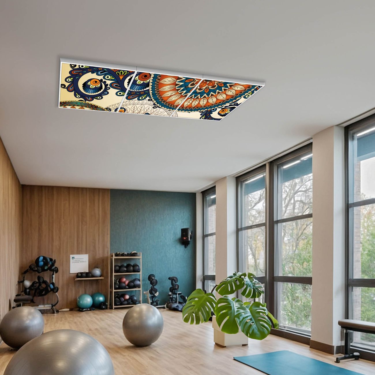 Entdecken Sie unsere vielseitigen Lichtdecken, hier in der Größe 186 x 62cm mit dem Motiv Motiv Modernes Mandala - Ihre Beleuchtungslösung für jede Umgebung Beleuchten Sie Ihren Raum nicht nur, sondern schaffen Sie Atmosphäre! Die banjado Lichtdecke verwandelt jeden Ort, ob zu Hause, in Praxen, Büros oder Studios in eine Wohlfühloase. Unsere einzelnen Elemente haben eine genormte Einheitsgröße von 62 x 62cm und können somit in jede gängige Rasterdecken verbaut werden. So finden Sie Ihre passende Ausführung: Gern helfen wir Ihnen, die passende Ausführung zu wählen. Hierfür muss die aktuelle Gegebenheit Ihrer Decke oder Wand beachtet werden. Haben Sie bereits eine Rasterdecke (auch Odenwalddecke genannt)? Hier bestellen Sie lediglich das Motiv + Beleuchtungspanel, denn beides wird in die bereits vorhandene Decke eingelegt. Haben Sie eine glatte Decke mit Lichtauslass oder möchten die Lichtdecke an der Wand befestigen? Hier bestellen Sie bitte Motiv + Beleuchtungspanel + Deckenbefestigung, eine Aufbauanleitung liegt immer bei. Die Lichtdecke kann sowohl an der Decke als auch an der Wand montiert werden, perfekt für kreative Lichtakzente oder alternative Beleuchtungslösungen. Haben Sie bereits eine Lichtdecke und möchten nur das Motiv wechseln? Hier bestellen Sie bitte nur Motiv, der Wechsel ist denkbar einfach. Der Aufbau Ihrer banjado Lichtdecke gestaltet sich unkompliziert, dank einer verständlichen Anleitung, die Ihnen Schritt für Schritt durch den Montageprozess hilft. Für die endgültige Installation und den sicheren Anschluss empfehlen wir die Hinzuziehung eines Fachmanns, um die optimale Funktion und Sicherheit Ihrer Beleuchtung zu gewährleisten. Falls Sie einen Fachmann für die Installation benötigen, geben Sie uns gern Bescheid, wir vermitteln Ihnen gern einen geeigneten Ansprechpartner aus Ihrer Nähe. Steuerung: Steigern Sie Ihr Beleuchtungserlebnis mit der nahtlosen Integration in Ihr Smart Home. Durch die Kompatibilität mit der SmartLife App, Alexa und Google Assistant wird Ihr Smartphone zur zentralen Steuerungseinheit. Ihr Handy fungiert hierbei sozusagen als Fernbedienung. Legen Sie individuelle Lichtszenen in der App fest, die bei Aktivierung über den Wand-Ein-/Ausschalter immer wieder abgerufen werden können ohne Handy. Mit der Szenenfunktion in der Smart App können Sie die Beleuchtung personalisieren und steuern, sodass sie auf Ihre individuellen Bedürfnisse, Tagesrhythmus und Stimmung zugeschnitten ist. Beispielsweise können Sie sich in der Morgendämmerung durch ein sanftes Licht wecken lassen oder das Licht der Praxis werktags um 7 Uhr automatisch einschalten lassen. Dieses kann dann natürlich auch zu einer bestimmten Zeit automatisch ausgeschaltet werden. Motivwahl: Diese einzigartige Lichtdecke zeichnet sich durch ihre Fähigkeit aus, die Lichtfarbe je nach gewähltem Motiv anzupassen - ein Baum wirft ein sanftes grünes Licht, während eine Wolkendecke Ihren Raum in ein beruhigendes blaues Leuchten hüllt. Berücksichtigen Sie dies bitte bei Ihrer Motivauswahl. Sie können das Motiv jederzeit ohne großen Aufwand austauschen, ob nach Jahreszeit oder anderem Anlass, unsere Auswahl lässt kaum Wünsche offen. Wir fertigen Ihnen gern eine personalisierte Lichtdecke mit einem eigenen Motiv oder Logo oder Foto, schreiben Sie uns jederzeit an. Technische Daten: Das Motiv ist auf einer 4mm starken Acrylglas Scheibe aufgebracht, das Gesamtgewicht Ihrer Ausführung beträgt 14,8kg. Die Farbtemperatur lässt sich frei einstellen von 3000 bis 6000 Kelvin, damit können Sie stufenlos zwischen warmweiß, neutralweiß und kaltweiß wählen. Die Gesamtleistung bei Ihrer gewählten Ausführung beträgt 120W. Der Lichtstrom beträgt 3600 Lumen, die Nennspannung 230 V. Die Lichtdecke ist mit Schutzart IP20 für den Innenbereich konzipiert und sollte nicht im Nassbereich verwendet werden.