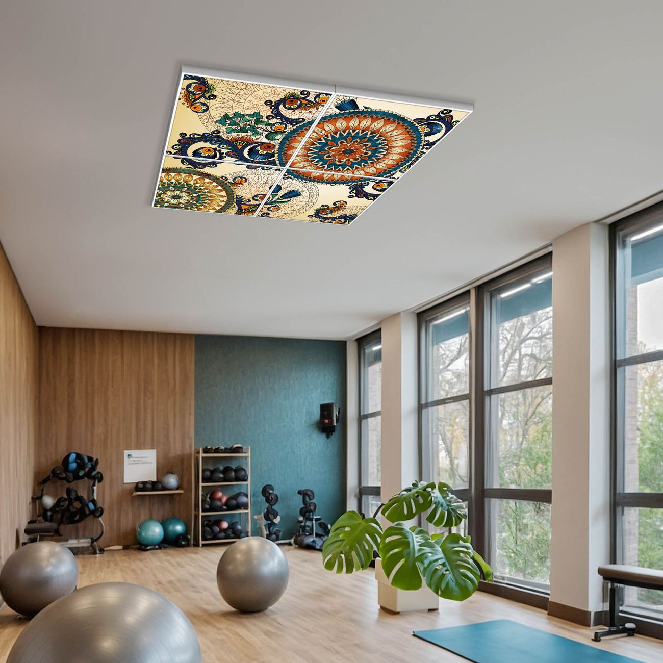 Entdecken Sie unsere vielseitigen Lichtdecken, hier in der Größe 124 x 124cm mit dem Motiv Motiv Modernes Mandala - Ihre Beleuchtungslösung für jede Umgebung Beleuchten Sie Ihren Raum nicht nur, sondern schaffen Sie Atmosphäre! Die banjado Lichtdecke verwandelt jeden Ort, ob zu Hause, in Praxen, Büros oder Studios in eine Wohlfühloase. Unsere einzelnen Elemente haben eine genormte Einheitsgröße von 62 x 62cm und können somit in jede gängige Rasterdecken verbaut werden. So finden Sie Ihre passende Ausführung: Gern helfen wir Ihnen, die passende Ausführung zu wählen. Hierfür muss die aktuelle Gegebenheit Ihrer Decke oder Wand beachtet werden. Haben Sie bereits eine Rasterdecke (auch Odenwalddecke genannt)? Hier bestellen Sie lediglich das Motiv + Beleuchtungspanel, denn beides wird in die bereits vorhandene Decke eingelegt. Haben Sie eine glatte Decke mit Lichtauslass oder möchten die Lichtdecke an der Wand befestigen? Hier bestellen Sie bitte Motiv + Beleuchtungspanel + Deckenbefestigung, eine Aufbauanleitung liegt immer bei. Die Lichtdecke kann sowohl an der Decke als auch an der Wand montiert werden, perfekt für kreative Lichtakzente oder alternative Beleuchtungslösungen. Haben Sie bereits eine Lichtdecke und möchten nur das Motiv wechseln? Hier bestellen Sie bitte nur Motiv, der Wechsel ist denkbar einfach. Der Aufbau Ihrer banjado Lichtdecke gestaltet sich unkompliziert, dank einer verständlichen Anleitung, die Ihnen Schritt für Schritt durch den Montageprozess hilft. Für die endgültige Installation und den sicheren Anschluss empfehlen wir die Hinzuziehung eines Fachmanns, um die optimale Funktion und Sicherheit Ihrer Beleuchtung zu gewährleisten. Falls Sie einen Fachmann für die Installation benötigen, geben Sie uns gern Bescheid, wir vermitteln Ihnen gern einen geeigneten Ansprechpartner aus Ihrer Nähe. Steuerung: Steigern Sie Ihr Beleuchtungserlebnis mit der nahtlosen Integration in Ihr Smart Home. Durch die Kompatibilität mit der SmartLife App, Alexa und Google Assistant wird Ihr Smartphone zur zentralen Steuerungseinheit. Ihr Handy fungiert hierbei sozusagen als Fernbedienung. Legen Sie individuelle Lichtszenen in der App fest, die bei Aktivierung über den Wand-Ein-/Ausschalter immer wieder abgerufen werden können ohne Handy. Mit der Szenenfunktion in der Smart App können Sie die Beleuchtung personalisieren und steuern, sodass sie auf Ihre individuellen Bedürfnisse, Tagesrhythmus und Stimmung zugeschnitten ist. Beispielsweise können Sie sich in der Morgendämmerung durch ein sanftes Licht wecken lassen oder das Licht der Praxis werktags um 7 Uhr automatisch einschalten lassen. Dieses kann dann natürlich auch zu einer bestimmten Zeit automatisch ausgeschaltet werden. Motivwahl: Diese einzigartige Lichtdecke zeichnet sich durch ihre Fähigkeit aus, die Lichtfarbe je nach gewähltem Motiv anzupassen - ein Baum wirft ein sanftes grünes Licht, während eine Wolkendecke Ihren Raum in ein beruhigendes blaues Leuchten hüllt. Berücksichtigen Sie dies bitte bei Ihrer Motivauswahl. Sie können das Motiv jederzeit ohne großen Aufwand austauschen, ob nach Jahreszeit oder anderem Anlass, unsere Auswahl lässt kaum Wünsche offen. Wir fertigen Ihnen gern eine personalisierte Lichtdecke mit einem eigenen Motiv oder Logo oder Foto, schreiben Sie uns jederzeit an. Technische Daten: Das Motiv ist auf einer 4mm starken Acrylglas Scheibe aufgebracht, das Gesamtgewicht Ihrer Ausführung beträgt 19,7kg. Die Farbtemperatur lässt sich frei einstellen von 3000 bis 6000 Kelvin, damit können Sie stufenlos zwischen warmweiß, neutralweiß und kaltweiß wählen. Die Gesamtleistung bei Ihrer gewählten Ausführung beträgt 160W. Der Lichtstrom beträgt 3600 Lumen, die Nennspannung 230 V. Die Lichtdecke ist mit Schutzart IP20 für den Innenbereich konzipiert und sollte nicht im Nassbereich verwendet werden.