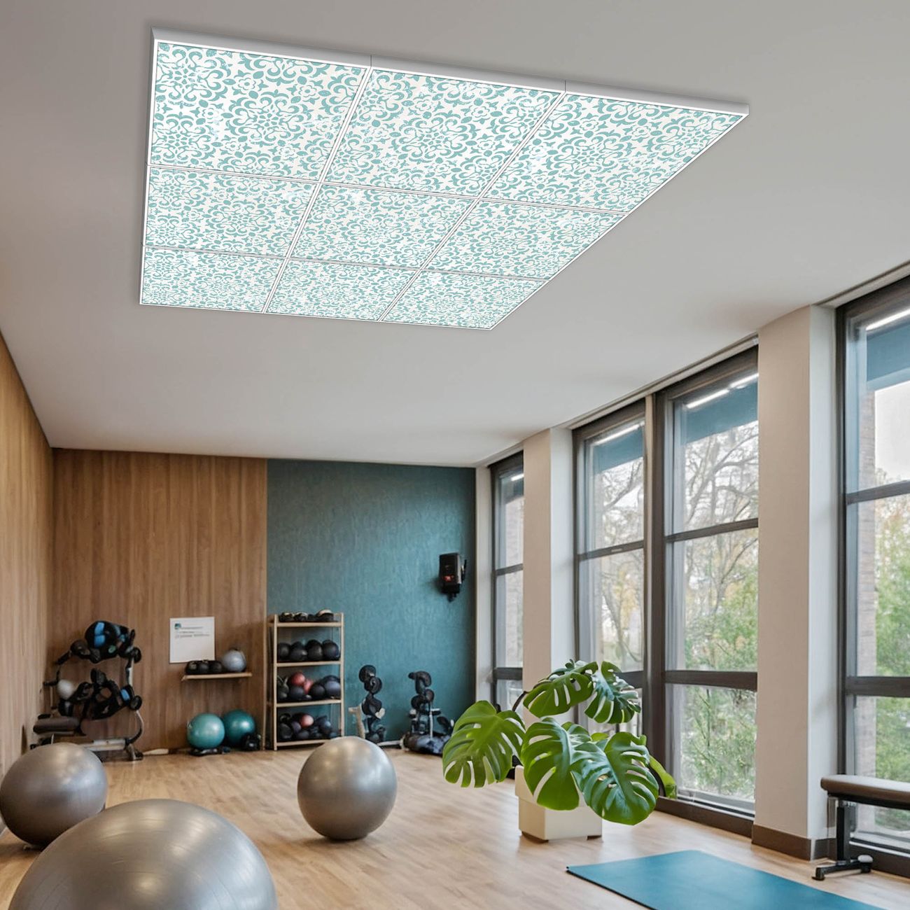 Entdecken Sie unsere vielseitigen Lichtdecken, hier in der Größe 186 x 186cm mit dem Motiv Motiv Muster Getupft Blau - Ihre Beleuchtungslösung für jede Umgebung Beleuchten Sie Ihren Raum nicht nur, sondern schaffen Sie Atmosphäre! Die banjado Lichtdecke verwandelt jeden Ort, ob zu Hause, in Praxen, Büros oder Studios in eine Wohlfühloase. Unsere einzelnen Elemente haben eine genormte Einheitsgröße von 62 x 62cm und können somit in jede gängige Rasterdecken verbaut werden. So finden Sie Ihre passende Ausführung: Gern helfen wir Ihnen, die passende Ausführung zu wählen. Hierfür muss die aktuelle Gegebenheit Ihrer Decke oder Wand beachtet werden. Haben Sie bereits eine Rasterdecke (auch Odenwalddecke genannt)? Hier bestellen Sie lediglich das Motiv + Beleuchtungspanel, denn beides wird in die bereits vorhandene Decke eingelegt. Haben Sie eine glatte Decke mit Lichtauslass oder möchten die Lichtdecke an der Wand befestigen? Hier bestellen Sie bitte Motiv + Beleuchtungspanel + Deckenbefestigung, eine Aufbauanleitung liegt immer bei. Die Lichtdecke kann sowohl an der Decke als auch an der Wand montiert werden, perfekt für kreative Lichtakzente oder alternative Beleuchtungslösungen. Haben Sie bereits eine Lichtdecke und möchten nur das Motiv wechseln? Hier bestellen Sie bitte nur Motiv, der Wechsel ist denkbar einfach. Der Aufbau Ihrer banjado Lichtdecke gestaltet sich unkompliziert, dank einer verständlichen Anleitung, die Ihnen Schritt für Schritt durch den Montageprozess hilft. Für die endgültige Installation und den sicheren Anschluss empfehlen wir die Hinzuziehung eines Fachmanns, um die optimale Funktion und Sicherheit Ihrer Beleuchtung zu gewährleisten. Falls Sie einen Fachmann für die Installation benötigen, geben Sie uns gern Bescheid, wir vermitteln Ihnen gern einen geeigneten Ansprechpartner aus Ihrer Nähe. Steuerung: Steigern Sie Ihr Beleuchtungserlebnis mit der nahtlosen Integration in Ihr Smart Home. Durch die Kompatibilität mit der SmartLife App, Alexa und Google Assistant wird Ihr Smartphone zur zentralen Steuerungseinheit. Ihr Handy fungiert hierbei sozusagen als Fernbedienung. Legen Sie individuelle Lichtszenen in der App fest, die bei Aktivierung über den Wand-Ein-/Ausschalter immer wieder abgerufen werden können ohne Handy. Mit der Szenenfunktion in der Smart App können Sie die Beleuchtung personalisieren und steuern, sodass sie auf Ihre individuellen Bedürfnisse, Tagesrhythmus und Stimmung zugeschnitten ist. Beispielsweise können Sie sich in der Morgendämmerung durch ein sanftes Licht wecken lassen oder das Licht der Praxis werktags um 7 Uhr automatisch einschalten lassen. Dieses kann dann natürlich auch zu einer bestimmten Zeit automatisch ausgeschaltet werden. Motivwahl: Diese einzigartige Lichtdecke zeichnet sich durch ihre Fähigkeit aus, die Lichtfarbe je nach gewähltem Motiv anzupassen - ein Baum wirft ein sanftes grünes Licht, während eine Wolkendecke Ihren Raum in ein beruhigendes blaues Leuchten hüllt. Berücksichtigen Sie dies bitte bei Ihrer Motivauswahl. Sie können das Motiv jederzeit ohne großen Aufwand austauschen, ob nach Jahreszeit oder anderem Anlass, unsere Auswahl lässt kaum Wünsche offen. Wir fertigen Ihnen gern eine personalisierte Lichtdecke mit einem eigenen Motiv oder Logo oder Foto, schreiben Sie uns jederzeit an. Technische Daten: Das Motiv ist auf einer 4mm starken Acrylglas Scheibe aufgebracht, das Gesamtgewicht Ihrer Ausführung beträgt 44,4kg. Die Farbtemperatur lässt sich frei einstellen von 3000 bis 6000 Kelvin, damit können Sie stufenlos zwischen warmweiß, neutralweiß und kaltweiß wählen. Die Gesamtleistung bei Ihrer gewählten Ausführung beträgt 360W. Der Lichtstrom beträgt 3600 Lumen, die Nennspannung 230 V. Die Lichtdecke ist mit Schutzart IP20 für den Innenbereich konzipiert und sollte nicht im Nassbereich verwendet werden.