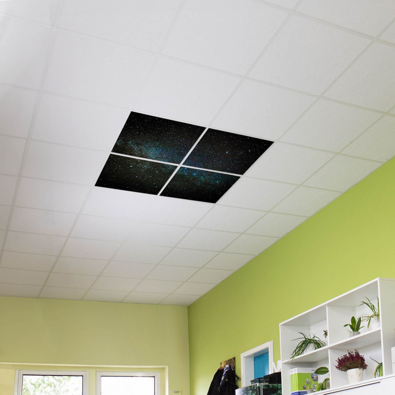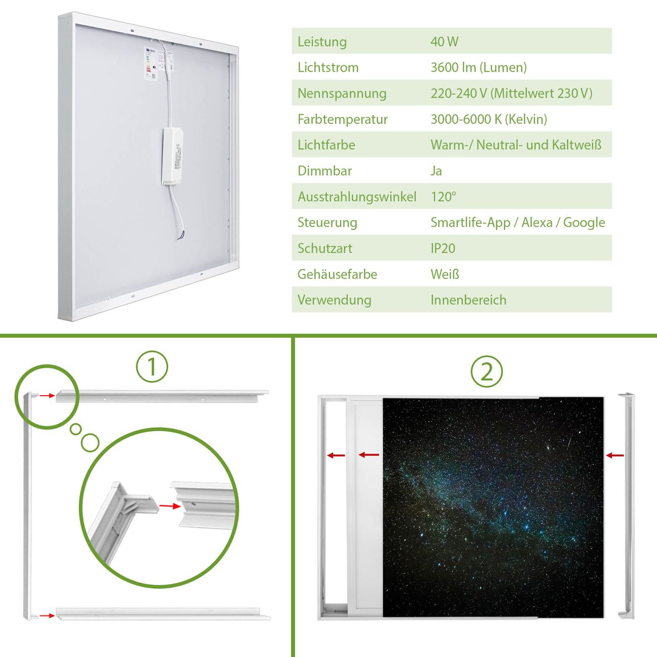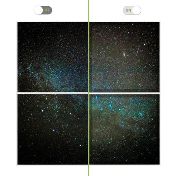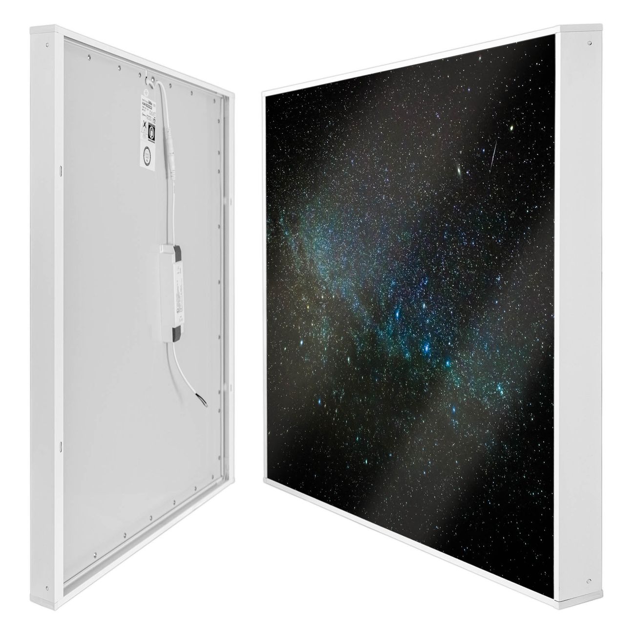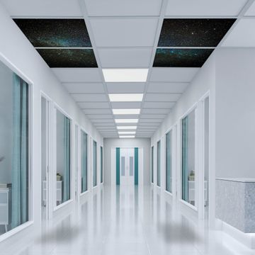 Entdecken Sie unsere vielseitigen Lichtdecken, hier in der Größe 124 x 124cm mit dem Motiv Motiv Nachthimmel - Ihre Beleuchtungslösung für jede Umgebung Beleuchten Sie Ihren Raum nicht nur, sondern schaffen Sie Atmosphäre! Die banjado Lichtdecke verwandelt jeden Ort, ob zu Hause, in Praxen, Büros oder Studios in eine Wohlfühloase. Unsere einzelnen Elemente haben eine genormte Einheitsgröße von 62 x 62cm und können somit in jede gängige Rasterdecken verbaut werden. So finden Sie Ihre passende Ausführung: Gern helfen wir Ihnen, die passende Ausführung zu wählen. Hierfür muss die aktuelle Gegebenheit Ihrer Decke oder Wand beachtet werden. Haben Sie bereits eine Rasterdecke (auch Odenwalddecke genannt)? Hier bestellen Sie lediglich das Motiv + Beleuchtungspanel, denn beides wird in die bereits vorhandene Decke eingelegt. Haben Sie eine glatte Decke mit Lichtauslass oder möchten die Lichtdecke an der Wand befestigen? Hier bestellen Sie bitte Motiv + Beleuchtungspanel + Deckenbefestigung, eine Aufbauanleitung liegt immer bei. Die Lichtdecke kann sowohl an der Decke als auch an der Wand montiert werden, perfekt für kreative Lichtakzente oder alternative Beleuchtungslösungen. Haben Sie bereits eine Lichtdecke und möchten nur das Motiv wechseln? Hier bestellen Sie bitte nur Motiv, der Wechsel ist denkbar einfach. Der Aufbau Ihrer banjado Lichtdecke gestaltet sich unkompliziert, dank einer verständlichen Anleitung, die Ihnen Schritt für Schritt durch den Montageprozess hilft. Für die endgültige Installation und den sicheren Anschluss empfehlen wir die Hinzuziehung eines Fachmanns, um die optimale Funktion und Sicherheit Ihrer Beleuchtung zu gewährleisten. Falls Sie einen Fachmann für die Installation benötigen, geben Sie uns gern Bescheid, wir vermitteln Ihnen gern einen geeigneten Ansprechpartner aus Ihrer Nähe. Steuerung: Steigern Sie Ihr Beleuchtungserlebnis mit der nahtlosen Integration in Ihr Smart Home. Durch die Kompatibilität mit der SmartLife App, Alexa und Google Assistant wird Ihr Smartphone zur zentralen Steuerungseinheit. Ihr Handy fungiert hierbei sozusagen als Fernbedienung. Legen Sie individuelle Lichtszenen in der App fest, die bei Aktivierung über den Wand-Ein-/Ausschalter immer wieder abgerufen werden können ohne Handy. Mit der Szenenfunktion in der Smart App können Sie die Beleuchtung personalisieren und steuern, sodass sie auf Ihre individuellen Bedürfnisse, Tagesrhythmus und Stimmung zugeschnitten ist. Beispielsweise können Sie sich in der Morgendämmerung durch ein sanftes Licht wecken lassen oder das Licht der Praxis werktags um 7 Uhr automatisch einschalten lassen. Dieses kann dann natürlich auch zu einer bestimmten Zeit automatisch ausgeschaltet werden. Motivwahl: Diese einzigartige Lichtdecke zeichnet sich durch ihre Fähigkeit aus, die Lichtfarbe je nach gewähltem Motiv anzupassen - ein Baum wirft ein sanftes grünes Licht, während eine Wolkendecke Ihren Raum in ein beruhigendes blaues Leuchten hüllt. Berücksichtigen Sie dies bitte bei Ihrer Motivauswahl. Sie können das Motiv jederzeit ohne großen Aufwand austauschen, ob nach Jahreszeit oder anderem Anlass, unsere Auswahl lässt kaum Wünsche offen. Wir fertigen Ihnen gern eine personalisierte Lichtdecke mit einem eigenen Motiv oder Logo oder Foto, schreiben Sie uns jederzeit an. Technische Daten: Das Motiv ist auf einer 4mm starken Acrylglas Scheibe aufgebracht, das Gesamtgewicht Ihrer Ausführung beträgt 17,7kg. Die Farbtemperatur lässt sich frei einstellen von 3000 bis 6000 Kelvin, damit können Sie stufenlos zwischen warmweiß, neutralweiß und kaltweiß wählen. Die Gesamtleistung bei Ihrer gewählten Ausführung beträgt 160W. Der Lichtstrom beträgt 3600 Lumen, die Nennspannung 230 V. Die Lichtdecke ist mit Schutzart IP20 für den Innenbereich konzipiert und sollte nicht im Nassbereich verwendet werden.