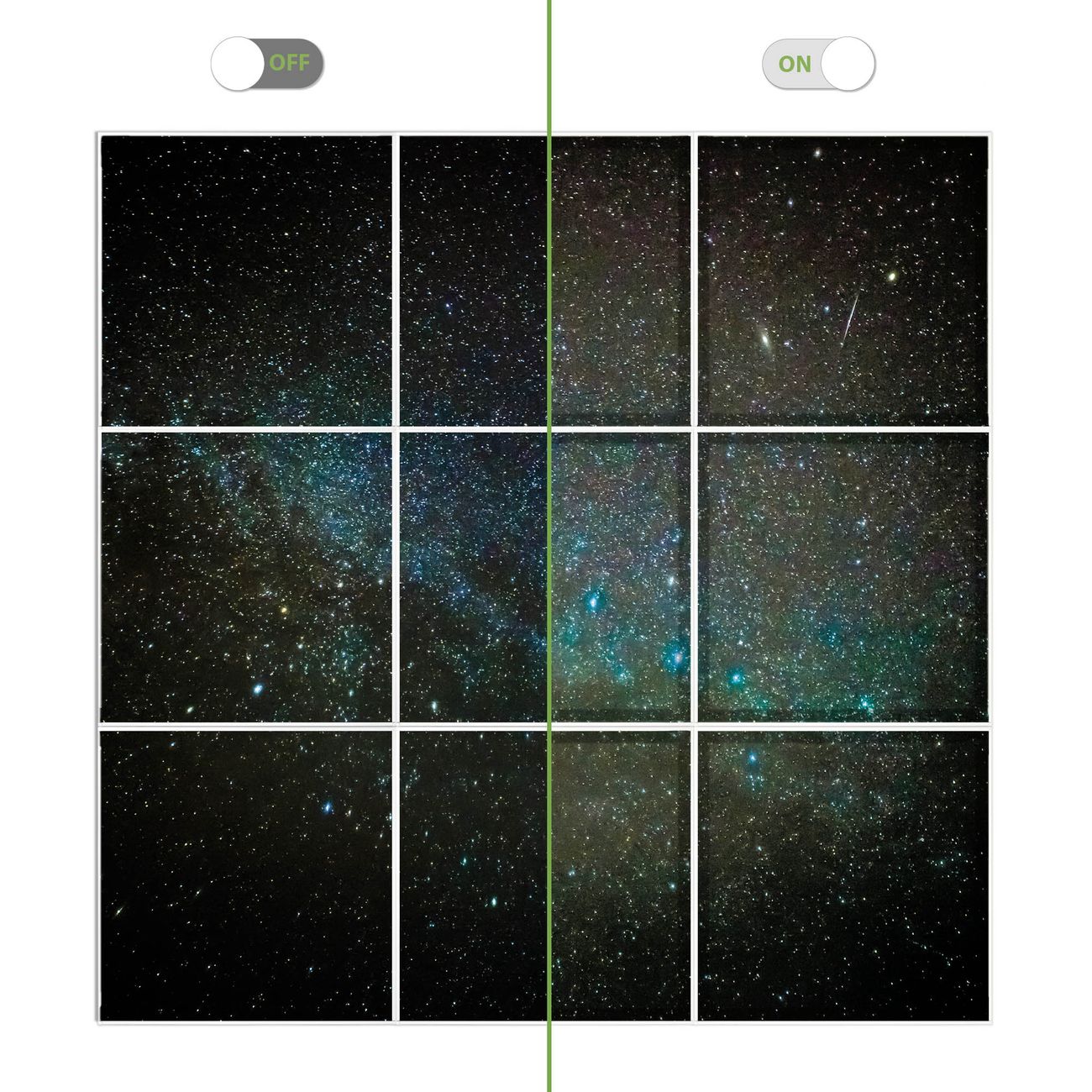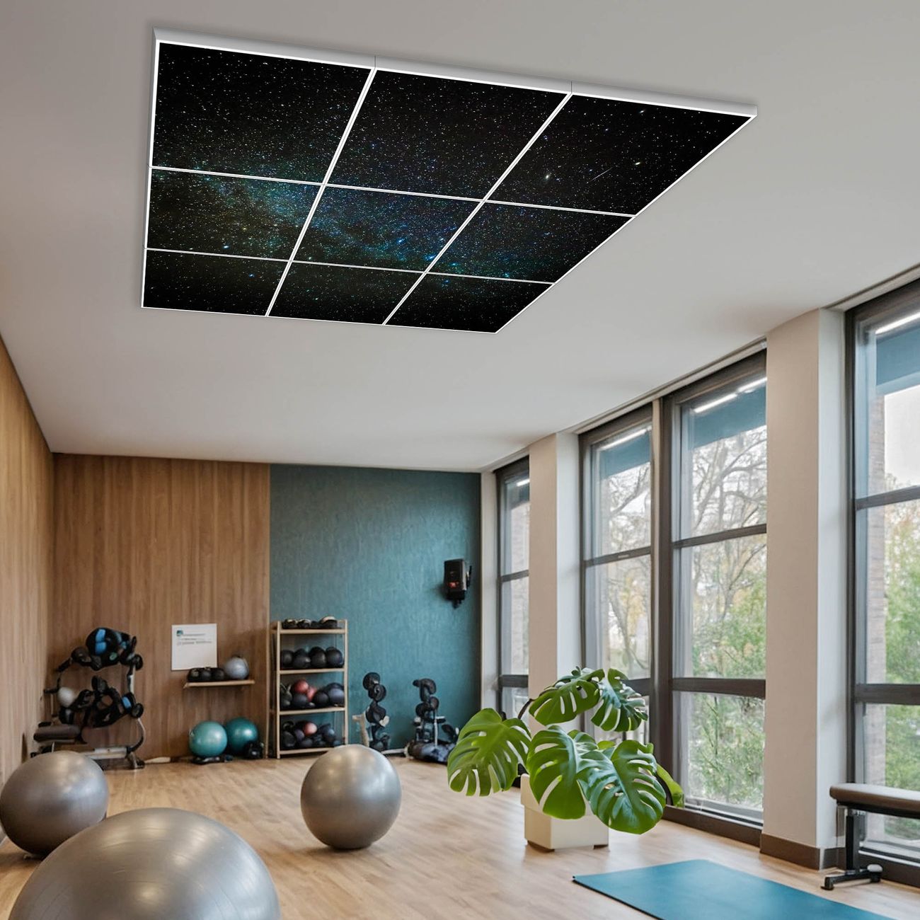 Entdecken Sie unsere vielseitigen Lichtdecken, hier in der Größe 186 x 186cm mit dem Motiv Motiv Nachthimmel - Ihre Beleuchtungslösung für jede Umgebung Beleuchten Sie Ihren Raum nicht nur, sondern schaffen Sie Atmosphäre! Die banjado Lichtdecke verwandelt jeden Ort, ob zu Hause, in Praxen, Büros oder Studios in eine Wohlfühloase. Unsere einzelnen Elemente haben eine genormte Einheitsgröße von 62 x 62cm und können somit in jede gängige Rasterdecken verbaut werden. So finden Sie Ihre passende Ausführung: Gern helfen wir Ihnen, die passende Ausführung zu wählen. Hierfür muss die aktuelle Gegebenheit Ihrer Decke oder Wand beachtet werden. Haben Sie bereits eine Rasterdecke (auch Odenwalddecke genannt)? Hier bestellen Sie lediglich das Motiv + Beleuchtungspanel, denn beides wird in die bereits vorhandene Decke eingelegt. Haben Sie eine glatte Decke mit Lichtauslass oder möchten die Lichtdecke an der Wand befestigen? Hier bestellen Sie bitte Motiv + Beleuchtungspanel + Deckenbefestigung, eine Aufbauanleitung liegt immer bei. Die Lichtdecke kann sowohl an der Decke als auch an der Wand montiert werden, perfekt für kreative Lichtakzente oder alternative Beleuchtungslösungen. Haben Sie bereits eine Lichtdecke und möchten nur das Motiv wechseln? Hier bestellen Sie bitte nur Motiv, der Wechsel ist denkbar einfach. Der Aufbau Ihrer banjado Lichtdecke gestaltet sich unkompliziert, dank einer verständlichen Anleitung, die Ihnen Schritt für Schritt durch den Montageprozess hilft. Für die endgültige Installation und den sicheren Anschluss empfehlen wir die Hinzuziehung eines Fachmanns, um die optimale Funktion und Sicherheit Ihrer Beleuchtung zu gewährleisten. Falls Sie einen Fachmann für die Installation benötigen, geben Sie uns gern Bescheid, wir vermitteln Ihnen gern einen geeigneten Ansprechpartner aus Ihrer Nähe. Steuerung: Steigern Sie Ihr Beleuchtungserlebnis mit der nahtlosen Integration in Ihr Smart Home. Durch die Kompatibilität mit der SmartLife App, Alexa und Google Assistant wird Ihr Smartphone zur zentralen Steuerungseinheit. Ihr Handy fungiert hierbei sozusagen als Fernbedienung. Legen Sie individuelle Lichtszenen in der App fest, die bei Aktivierung über den Wand-Ein-/Ausschalter immer wieder abgerufen werden können ohne Handy. Mit der Szenenfunktion in der Smart App können Sie die Beleuchtung personalisieren und steuern, sodass sie auf Ihre individuellen Bedürfnisse, Tagesrhythmus und Stimmung zugeschnitten ist. Beispielsweise können Sie sich in der Morgendämmerung durch ein sanftes Licht wecken lassen oder das Licht der Praxis werktags um 7 Uhr automatisch einschalten lassen. Dieses kann dann natürlich auch zu einer bestimmten Zeit automatisch ausgeschaltet werden. Motivwahl: Diese einzigartige Lichtdecke zeichnet sich durch ihre Fähigkeit aus, die Lichtfarbe je nach gewähltem Motiv anzupassen - ein Baum wirft ein sanftes grünes Licht, während eine Wolkendecke Ihren Raum in ein beruhigendes blaues Leuchten hüllt. Berücksichtigen Sie dies bitte bei Ihrer Motivauswahl. Sie können das Motiv jederzeit ohne großen Aufwand austauschen, ob nach Jahreszeit oder anderem Anlass, unsere Auswahl lässt kaum Wünsche offen. Wir fertigen Ihnen gern eine personalisierte Lichtdecke mit einem eigenen Motiv oder Logo oder Foto, schreiben Sie uns jederzeit an. Technische Daten: Das Motiv ist auf einer 4mm starken Acrylglas Scheibe aufgebracht, das Gesamtgewicht Ihrer Ausführung beträgt 44,4kg. Die Farbtemperatur lässt sich frei einstellen von 3000 bis 6000 Kelvin, damit können Sie stufenlos zwischen warmweiß, neutralweiß und kaltweiß wählen. Die Gesamtleistung bei Ihrer gewählten Ausführung beträgt 360W. Der Lichtstrom beträgt 3600 Lumen, die Nennspannung 230 V. Die Lichtdecke ist mit Schutzart IP20 für den Innenbereich konzipiert und sollte nicht im Nassbereich verwendet werden.