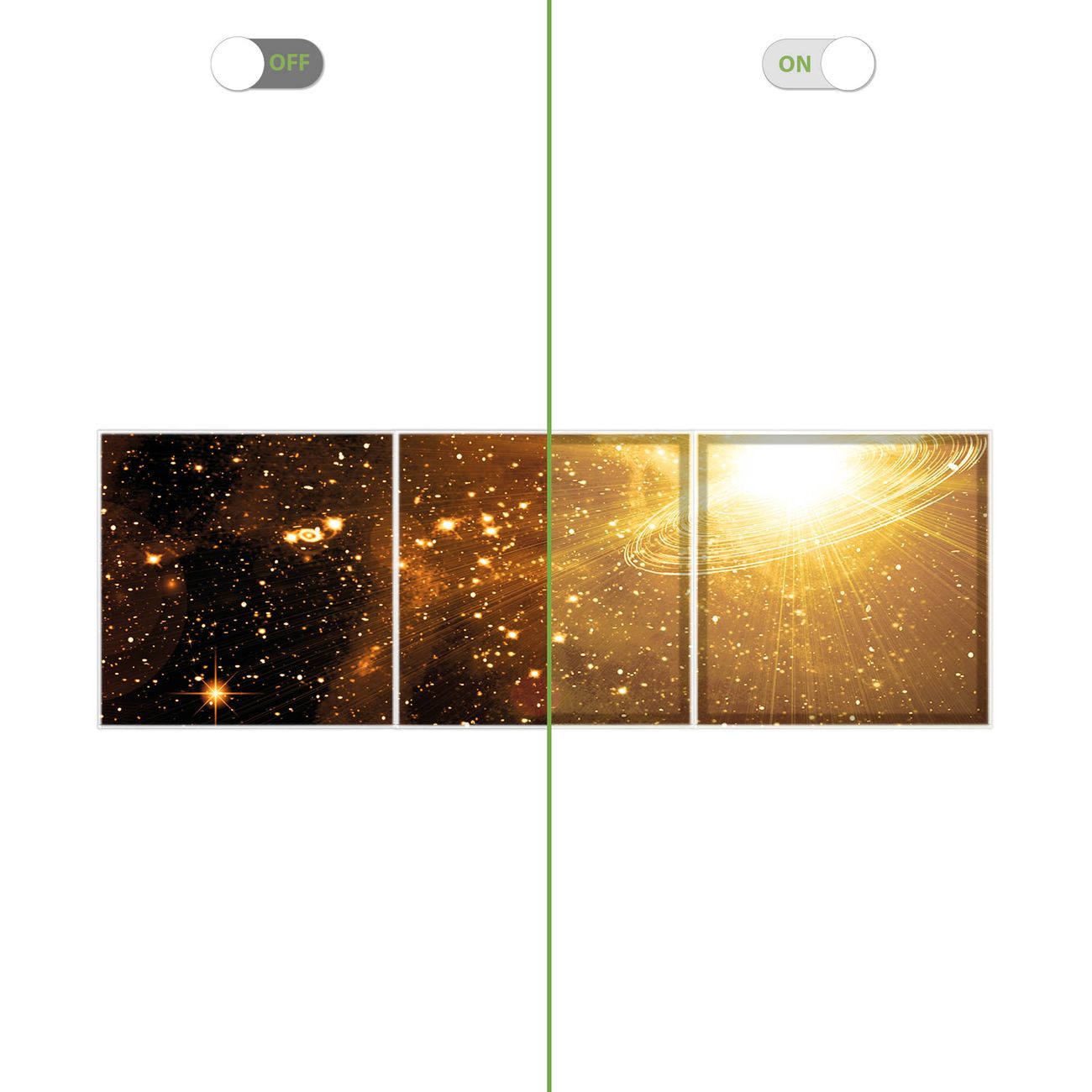 Entdecken Sie unsere vielseitigen Lichtdecken, hier in der Größe 186 x 62cm mit dem Motiv Motiv Outer Space - Ihre Beleuchtungslösung für jede Umgebung Beleuchten Sie Ihren Raum nicht nur, sondern schaffen Sie Atmosphäre! Die banjado Lichtdecke verwandelt jeden Ort, ob zu Hause, in Praxen, Büros oder Studios in eine Wohlfühloase. Unsere einzelnen Elemente haben eine genormte Einheitsgröße von 62 x 62cm und können somit in jede gängige Rasterdecken verbaut werden. So finden Sie Ihre passende Ausführung: Gern helfen wir Ihnen, die passende Ausführung zu wählen. Hierfür muss die aktuelle Gegebenheit Ihrer Decke oder Wand beachtet werden. Haben Sie bereits eine Rasterdecke (auch Odenwalddecke genannt)? Hier bestellen Sie lediglich das Motiv + Beleuchtungspanel, denn beides wird in die bereits vorhandene Decke eingelegt. Haben Sie eine glatte Decke mit Lichtauslass oder möchten die Lichtdecke an der Wand befestigen? Hier bestellen Sie bitte Motiv + Beleuchtungspanel + Deckenbefestigung, eine Aufbauanleitung liegt immer bei. Die Lichtdecke kann sowohl an der Decke als auch an der Wand montiert werden, perfekt für kreative Lichtakzente oder alternative Beleuchtungslösungen. Haben Sie bereits eine Lichtdecke und möchten nur das Motiv wechseln? Hier bestellen Sie bitte nur Motiv, der Wechsel ist denkbar einfach. Der Aufbau Ihrer banjado Lichtdecke gestaltet sich unkompliziert, dank einer verständlichen Anleitung, die Ihnen Schritt für Schritt durch den Montageprozess hilft. Für die endgültige Installation und den sicheren Anschluss empfehlen wir die Hinzuziehung eines Fachmanns, um die optimale Funktion und Sicherheit Ihrer Beleuchtung zu gewährleisten. Falls Sie einen Fachmann für die Installation benötigen, geben Sie uns gern Bescheid, wir vermitteln Ihnen gern einen geeigneten Ansprechpartner aus Ihrer Nähe. Steuerung: Steigern Sie Ihr Beleuchtungserlebnis mit der nahtlosen Integration in Ihr Smart Home. Durch die Kompatibilität mit der SmartLife App, Alexa und Google Assistant wird Ihr Smartphone zur zentralen Steuerungseinheit. Ihr Handy fungiert hierbei sozusagen als Fernbedienung. Legen Sie individuelle Lichtszenen in der App fest, die bei Aktivierung über den Wand-Ein-/Ausschalter immer wieder abgerufen werden können ohne Handy. Mit der Szenenfunktion in der Smart App können Sie die Beleuchtung personalisieren und steuern, sodass sie auf Ihre individuellen Bedürfnisse, Tagesrhythmus und Stimmung zugeschnitten ist. Beispielsweise können Sie sich in der Morgendämmerung durch ein sanftes Licht wecken lassen oder das Licht der Praxis werktags um 7 Uhr automatisch einschalten lassen. Dieses kann dann natürlich auch zu einer bestimmten Zeit automatisch ausgeschaltet werden. Motivwahl: Diese einzigartige Lichtdecke zeichnet sich durch ihre Fähigkeit aus, die Lichtfarbe je nach gewähltem Motiv anzupassen - ein Baum wirft ein sanftes grünes Licht, während eine Wolkendecke Ihren Raum in ein beruhigendes blaues Leuchten hüllt. Berücksichtigen Sie dies bitte bei Ihrer Motivauswahl. Sie können das Motiv jederzeit ohne großen Aufwand austauschen, ob nach Jahreszeit oder anderem Anlass, unsere Auswahl lässt kaum Wünsche offen. Wir fertigen Ihnen gern eine personalisierte Lichtdecke mit einem eigenen Motiv oder Logo oder Foto, schreiben Sie uns jederzeit an. Technische Daten: Das Motiv ist auf einer 4mm starken Acrylglas Scheibe aufgebracht, das Gesamtgewicht Ihrer Ausführung beträgt 13,3kg. Die Farbtemperatur lässt sich frei einstellen von 3000 bis 6000 Kelvin, damit können Sie stufenlos zwischen warmweiß, neutralweiß und kaltweiß wählen. Die Gesamtleistung bei Ihrer gewählten Ausführung beträgt 120W. Der Lichtstrom beträgt 3600 Lumen, die Nennspannung 230 V. Die Lichtdecke ist mit Schutzart IP20 für den Innenbereich konzipiert und sollte nicht im Nassbereich verwendet werden.