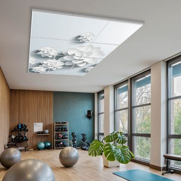Entdecken Sie unsere vielseitigen Lichtdecken, hier in der Größe 186 x 248cm mit dem Motiv Motiv Papier Lotus - Ihre Beleuchtungslösung für jede Umgebung Beleuchten Sie Ihren Raum nicht nur, sondern schaffen Sie Atmosphäre! Die banjado Lichtdecke verwandelt jeden Ort, ob zu Hause, in Praxen, Büros oder Studios in eine Wohlfühloase. Unsere einzelnen Elemente haben eine genormte Einheitsgröße von 62 x 62cm und können somit in jede gängige Rasterdecken verbaut werden. So finden Sie Ihre passende Ausführung: Gern helfen wir Ihnen, die passende Ausführung zu wählen. Hierfür muss die aktuelle Gegebenheit Ihrer Decke oder Wand beachtet werden. Haben Sie bereits eine Rasterdecke (auch Odenwalddecke genannt)? Hier bestellen Sie lediglich das Motiv + Beleuchtungspanel, denn beides wird in die bereits vorhandene Decke eingelegt. Haben Sie eine glatte Decke mit Lichtauslass oder möchten die Lichtdecke an der Wand befestigen? Hier bestellen Sie bitte Motiv + Beleuchtungspanel + Deckenbefestigung, eine Aufbauanleitung liegt immer bei. Die Lichtdecke kann sowohl an der Decke als auch an der Wand montiert werden, perfekt für kreative Lichtakzente oder alternative Beleuchtungslösungen. Haben Sie bereits eine Lichtdecke und möchten nur das Motiv wechseln? Hier bestellen Sie bitte nur Motiv, der Wechsel ist denkbar einfach. Der Aufbau Ihrer banjado Lichtdecke gestaltet sich unkompliziert, dank einer verständlichen Anleitung, die Ihnen Schritt für Schritt durch den Montageprozess hilft. Für die endgültige Installation und den sicheren Anschluss empfehlen wir die Hinzuziehung eines Fachmanns, um die optimale Funktion und Sicherheit Ihrer Beleuchtung zu gewährleisten. Falls Sie einen Fachmann für die Installation benötigen, geben Sie uns gern Bescheid, wir vermitteln Ihnen gern einen geeigneten Ansprechpartner aus Ihrer Nähe. Steuerung: Steigern Sie Ihr Beleuchtungserlebnis mit der nahtlosen Integration in Ihr Smart Home. Durch die Kompatibilität mit der SmartLife App, Alexa und Google Assistant wird Ihr Smartphone zur zentralen Steuerungseinheit. Ihr Handy fungiert hierbei sozusagen als Fernbedienung. Legen Sie individuelle Lichtszenen in der App fest, die bei Aktivierung über den Wand-Ein-/Ausschalter immer wieder abgerufen werden können ohne Handy. Mit der Szenenfunktion in der Smart App können Sie die Beleuchtung personalisieren und steuern, sodass sie auf Ihre individuellen Bedürfnisse, Tagesrhythmus und Stimmung zugeschnitten ist. Beispielsweise können Sie sich in der Morgendämmerung durch ein sanftes Licht wecken lassen oder das Licht der Praxis werktags um 7 Uhr automatisch einschalten lassen. Dieses kann dann natürlich auch zu einer bestimmten Zeit automatisch ausgeschaltet werden. Motivwahl: Diese einzigartige Lichtdecke zeichnet sich durch ihre Fähigkeit aus, die Lichtfarbe je nach gewähltem Motiv anzupassen - ein Baum wirft ein sanftes grünes Licht, während eine Wolkendecke Ihren Raum in ein beruhigendes blaues Leuchten hüllt. Berücksichtigen Sie dies bitte bei Ihrer Motivauswahl. Sie können das Motiv jederzeit ohne großen Aufwand austauschen, ob nach Jahreszeit oder anderem Anlass, unsere Auswahl lässt kaum Wünsche offen. Wir fertigen Ihnen gern eine personalisierte Lichtdecke mit einem eigenen Motiv oder Logo oder Foto, schreiben Sie uns jederzeit an. Technische Daten: Das Motiv ist auf einer 4mm starken Acrylglas Scheibe aufgebracht, das Gesamtgewicht Ihrer Ausführung beträgt 59,1kg. Die Farbtemperatur lässt sich frei einstellen von 3000 bis 6000 Kelvin, damit können Sie stufenlos zwischen warmweiß, neutralweiß und kaltweiß wählen. Die Gesamtleistung bei Ihrer gewählten Ausführung beträgt 480W. Der Lichtstrom beträgt 3600 Lumen, die Nennspannung 230 V. Die Lichtdecke ist mit Schutzart IP20 für den Innenbereich konzipiert und sollte nicht im Nassbereich verwendet werden.