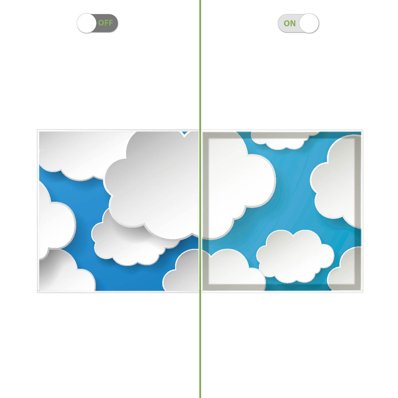 Entdecken Sie unsere vielseitigen Lichtdecken, hier in der Größe 124 x 62cm mit dem Motiv Motiv Plastische Wolken - Ihre Beleuchtungslösung für jede Umgebung Beleuchten Sie Ihren Raum nicht nur, sondern schaffen Sie Atmosphäre! Die banjado Lichtdecke verwandelt jeden Ort, ob zu Hause, in Praxen, Büros oder Studios in eine Wohlfühloase. Unsere einzelnen Elemente haben eine genormte Einheitsgröße von 62 x 62cm und können somit in jede gängige Rasterdecken verbaut werden. So finden Sie Ihre passende Ausführung: Gern helfen wir Ihnen, die passende Ausführung zu wählen. Hierfür muss die aktuelle Gegebenheit Ihrer Decke oder Wand beachtet werden. Haben Sie bereits eine Rasterdecke (auch Odenwalddecke genannt)? Hier bestellen Sie lediglich das Motiv + Beleuchtungspanel, denn beides wird in die bereits vorhandene Decke eingelegt. Haben Sie eine glatte Decke mit Lichtauslass oder möchten die Lichtdecke an der Wand befestigen? Hier bestellen Sie bitte Motiv + Beleuchtungspanel + Deckenbefestigung, eine Aufbauanleitung liegt immer bei. Die Lichtdecke kann sowohl an der Decke als auch an der Wand montiert werden, perfekt für kreative Lichtakzente oder alternative Beleuchtungslösungen. Haben Sie bereits eine Lichtdecke und möchten nur das Motiv wechseln? Hier bestellen Sie bitte nur Motiv, der Wechsel ist denkbar einfach. Der Aufbau Ihrer banjado Lichtdecke gestaltet sich unkompliziert, dank einer verständlichen Anleitung, die Ihnen Schritt für Schritt durch den Montageprozess hilft. Für die endgültige Installation und den sicheren Anschluss empfehlen wir die Hinzuziehung eines Fachmanns, um die optimale Funktion und Sicherheit Ihrer Beleuchtung zu gewährleisten. Falls Sie einen Fachmann für die Installation benötigen, geben Sie uns gern Bescheid, wir vermitteln Ihnen gern einen geeigneten Ansprechpartner aus Ihrer Nähe. Steuerung: Steigern Sie Ihr Beleuchtungserlebnis mit der nahtlosen Integration in Ihr Smart Home. Durch die Kompatibilität mit der SmartLife App, Alexa und Google Assistant wird Ihr Smartphone zur zentralen Steuerungseinheit. Ihr Handy fungiert hierbei sozusagen als Fernbedienung. Legen Sie individuelle Lichtszenen in der App fest, die bei Aktivierung über den Wand-Ein-/Ausschalter immer wieder abgerufen werden können ohne Handy. Mit der Szenenfunktion in der Smart App können Sie die Beleuchtung personalisieren und steuern, sodass sie auf Ihre individuellen Bedürfnisse, Tagesrhythmus und Stimmung zugeschnitten ist. Beispielsweise können Sie sich in der Morgendämmerung durch ein sanftes Licht wecken lassen oder das Licht der Praxis werktags um 7 Uhr automatisch einschalten lassen. Dieses kann dann natürlich auch zu einer bestimmten Zeit automatisch ausgeschaltet werden. Motivwahl: Diese einzigartige Lichtdecke zeichnet sich durch ihre Fähigkeit aus, die Lichtfarbe je nach gewähltem Motiv anzupassen - ein Baum wirft ein sanftes grünes Licht, während eine Wolkendecke Ihren Raum in ein beruhigendes blaues Leuchten hüllt. Berücksichtigen Sie dies bitte bei Ihrer Motivauswahl. Sie können das Motiv jederzeit ohne großen Aufwand austauschen, ob nach Jahreszeit oder anderem Anlass, unsere Auswahl lässt kaum Wünsche offen. Wir fertigen Ihnen gern eine personalisierte Lichtdecke mit einem eigenen Motiv oder Logo oder Foto, schreiben Sie uns jederzeit an. Technische Daten: Das Motiv ist auf einer 4mm starken Acrylglas Scheibe aufgebracht, das Gesamtgewicht Ihrer Ausführung beträgt 4,5kg. Die Farbtemperatur lässt sich frei einstellen von 3000 bis 6000 Kelvin, damit können Sie stufenlos zwischen warmweiß, neutralweiß und kaltweiß wählen. Die Gesamtleistung bei Ihrer gewählten Ausführung beträgt 80W. Der Lichtstrom beträgt 3600 Lumen, die Nennspannung 230 V. Die Lichtdecke ist mit Schutzart IP20 für den Innenbereich konzipiert und sollte nicht im Nassbereich verwendet werden.