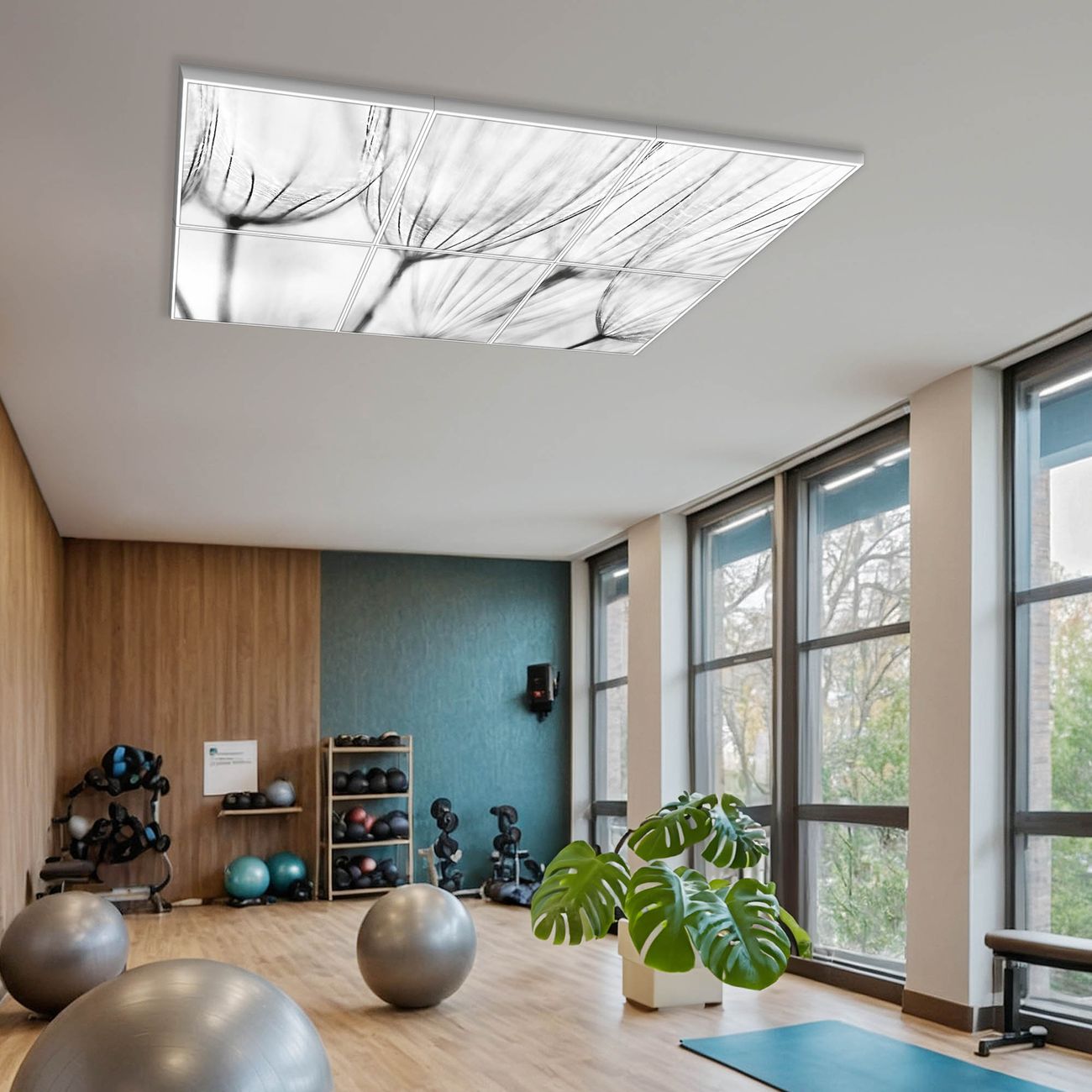 Entdecken Sie unsere vielseitigen Lichtdecken, hier in der Größe 186 x 124cm mit dem Motiv Motiv Pusteblumen SW - Ihre Beleuchtungslösung für jede Umgebung Beleuchten Sie Ihren Raum nicht nur, sondern schaffen Sie Atmosphäre! Die banjado Lichtdecke verwandelt jeden Ort, ob zu Hause, in Praxen, Büros oder Studios in eine Wohlfühloase. Unsere einzelnen Elemente haben eine genormte Einheitsgröße von 62 x 62cm und können somit in jede gängige Rasterdecken verbaut werden. So finden Sie Ihre passende Ausführung: Gern helfen wir Ihnen, die passende Ausführung zu wählen. Hierfür muss die aktuelle Gegebenheit Ihrer Decke oder Wand beachtet werden. Haben Sie bereits eine Rasterdecke (auch Odenwalddecke genannt)? Hier bestellen Sie lediglich das Motiv + Beleuchtungspanel, denn beides wird in die bereits vorhandene Decke eingelegt. Haben Sie eine glatte Decke mit Lichtauslass oder möchten die Lichtdecke an der Wand befestigen? Hier bestellen Sie bitte Motiv + Beleuchtungspanel + Deckenbefestigung, eine Aufbauanleitung liegt immer bei. Die Lichtdecke kann sowohl an der Decke als auch an der Wand montiert werden, perfekt für kreative Lichtakzente oder alternative Beleuchtungslösungen. Haben Sie bereits eine Lichtdecke und möchten nur das Motiv wechseln? Hier bestellen Sie bitte nur Motiv, der Wechsel ist denkbar einfach. Der Aufbau Ihrer banjado Lichtdecke gestaltet sich unkompliziert, dank einer verständlichen Anleitung, die Ihnen Schritt für Schritt durch den Montageprozess hilft. Für die endgültige Installation und den sicheren Anschluss empfehlen wir die Hinzuziehung eines Fachmanns, um die optimale Funktion und Sicherheit Ihrer Beleuchtung zu gewährleisten. Falls Sie einen Fachmann für die Installation benötigen, geben Sie uns gern Bescheid, wir vermitteln Ihnen gern einen geeigneten Ansprechpartner aus Ihrer Nähe. Steuerung: Steigern Sie Ihr Beleuchtungserlebnis mit der nahtlosen Integration in Ihr Smart Home. Durch die Kompatibilität mit der SmartLife App, Alexa und Google Assistant wird Ihr Smartphone zur zentralen Steuerungseinheit. Ihr Handy fungiert hierbei sozusagen als Fernbedienung. Legen Sie individuelle Lichtszenen in der App fest, die bei Aktivierung über den Wand-Ein-/Ausschalter immer wieder abgerufen werden können ohne Handy. Mit der Szenenfunktion in der Smart App können Sie die Beleuchtung personalisieren und steuern, sodass sie auf Ihre individuellen Bedürfnisse, Tagesrhythmus und Stimmung zugeschnitten ist. Beispielsweise können Sie sich in der Morgendämmerung durch ein sanftes Licht wecken lassen oder das Licht der Praxis werktags um 7 Uhr automatisch einschalten lassen. Dieses kann dann natürlich auch zu einer bestimmten Zeit automatisch ausgeschaltet werden. Motivwahl: Diese einzigartige Lichtdecke zeichnet sich durch ihre Fähigkeit aus, die Lichtfarbe je nach gewähltem Motiv anzupassen - ein Baum wirft ein sanftes grünes Licht, während eine Wolkendecke Ihren Raum in ein beruhigendes blaues Leuchten hüllt. Berücksichtigen Sie dies bitte bei Ihrer Motivauswahl. Sie können das Motiv jederzeit ohne großen Aufwand austauschen, ob nach Jahreszeit oder anderem Anlass, unsere Auswahl lässt kaum Wünsche offen. Wir fertigen Ihnen gern eine personalisierte Lichtdecke mit einem eigenen Motiv oder Logo oder Foto, schreiben Sie uns jederzeit an. Technische Daten: Das Motiv ist auf einer 4mm starken Acrylglas Scheibe aufgebracht, das Gesamtgewicht Ihrer Ausführung beträgt 29,6kg. Die Farbtemperatur lässt sich frei einstellen von 3000 bis 6000 Kelvin, damit können Sie stufenlos zwischen warmweiß, neutralweiß und kaltweiß wählen. Die Gesamtleistung bei Ihrer gewählten Ausführung beträgt 240W. Der Lichtstrom beträgt 3600 Lumen, die Nennspannung 230 V. Die Lichtdecke ist mit Schutzart IP20 für den Innenbereich konzipiert und sollte nicht im Nassbereich verwendet werden.