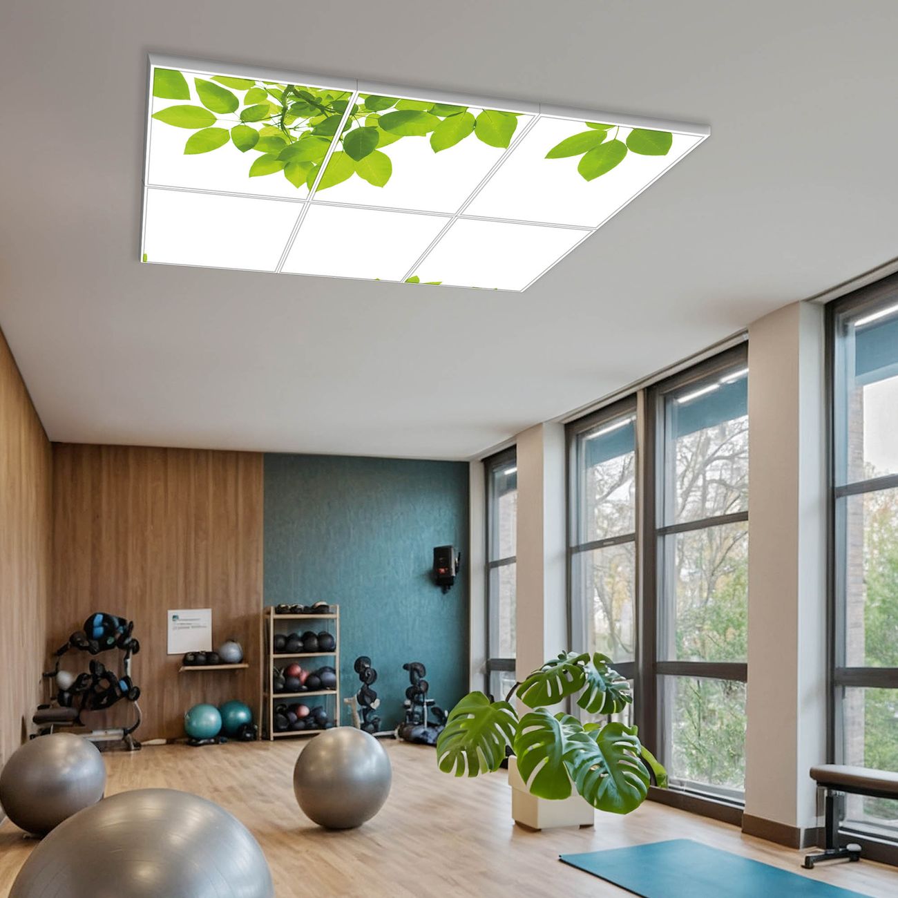 Entdecken Sie unsere vielseitigen Lichtdecken, hier in der Größe 186 x 124cm mit dem Motiv Motiv Rahmen Blätter - Ihre Beleuchtungslösung für jede Umgebung Beleuchten Sie Ihren Raum nicht nur, sondern schaffen Sie Atmosphäre! Die banjado Lichtdecke verwandelt jeden Ort, ob zu Hause, in Praxen, Büros oder Studios in eine Wohlfühloase. Unsere einzelnen Elemente haben eine genormte Einheitsgröße von 62 x 62cm und können somit in jede gängige Rasterdecken verbaut werden. So finden Sie Ihre passende Ausführung: Gern helfen wir Ihnen, die passende Ausführung zu wählen. Hierfür muss die aktuelle Gegebenheit Ihrer Decke oder Wand beachtet werden. Haben Sie bereits eine Rasterdecke (auch Odenwalddecke genannt)? Hier bestellen Sie lediglich das Motiv + Beleuchtungspanel, denn beides wird in die bereits vorhandene Decke eingelegt. Haben Sie eine glatte Decke mit Lichtauslass oder möchten die Lichtdecke an der Wand befestigen? Hier bestellen Sie bitte Motiv + Beleuchtungspanel + Deckenbefestigung, eine Aufbauanleitung liegt immer bei. Die Lichtdecke kann sowohl an der Decke als auch an der Wand montiert werden, perfekt für kreative Lichtakzente oder alternative Beleuchtungslösungen. Haben Sie bereits eine Lichtdecke und möchten nur das Motiv wechseln? Hier bestellen Sie bitte nur Motiv, der Wechsel ist denkbar einfach. Der Aufbau Ihrer banjado Lichtdecke gestaltet sich unkompliziert, dank einer verständlichen Anleitung, die Ihnen Schritt für Schritt durch den Montageprozess hilft. Für die endgültige Installation und den sicheren Anschluss empfehlen wir die Hinzuziehung eines Fachmanns, um die optimale Funktion und Sicherheit Ihrer Beleuchtung zu gewährleisten. Falls Sie einen Fachmann für die Installation benötigen, geben Sie uns gern Bescheid, wir vermitteln Ihnen gern einen geeigneten Ansprechpartner aus Ihrer Nähe. Steuerung: Steigern Sie Ihr Beleuchtungserlebnis mit der nahtlosen Integration in Ihr Smart Home. Durch die Kompatibilität mit der SmartLife App, Alexa und Google Assistant wird Ihr Smartphone zur zentralen Steuerungseinheit. Ihr Handy fungiert hierbei sozusagen als Fernbedienung. Legen Sie individuelle Lichtszenen in der App fest, die bei Aktivierung über den Wand-Ein-/Ausschalter immer wieder abgerufen werden können ohne Handy. Mit der Szenenfunktion in der Smart App können Sie die Beleuchtung personalisieren und steuern, sodass sie auf Ihre individuellen Bedürfnisse, Tagesrhythmus und Stimmung zugeschnitten ist. Beispielsweise können Sie sich in der Morgendämmerung durch ein sanftes Licht wecken lassen oder das Licht der Praxis werktags um 7 Uhr automatisch einschalten lassen. Dieses kann dann natürlich auch zu einer bestimmten Zeit automatisch ausgeschaltet werden. Motivwahl: Diese einzigartige Lichtdecke zeichnet sich durch ihre Fähigkeit aus, die Lichtfarbe je nach gewähltem Motiv anzupassen - ein Baum wirft ein sanftes grünes Licht, während eine Wolkendecke Ihren Raum in ein beruhigendes blaues Leuchten hüllt. Berücksichtigen Sie dies bitte bei Ihrer Motivauswahl. Sie können das Motiv jederzeit ohne großen Aufwand austauschen, ob nach Jahreszeit oder anderem Anlass, unsere Auswahl lässt kaum Wünsche offen. Wir fertigen Ihnen gern eine personalisierte Lichtdecke mit einem eigenen Motiv oder Logo oder Foto, schreiben Sie uns jederzeit an. Technische Daten: Das Motiv ist auf einer 4mm starken Acrylglas Scheibe aufgebracht, das Gesamtgewicht Ihrer Ausführung beträgt 29,6kg. Die Farbtemperatur lässt sich frei einstellen von 3000 bis 6000 Kelvin, damit können Sie stufenlos zwischen warmweiß, neutralweiß und kaltweiß wählen. Die Gesamtleistung bei Ihrer gewählten Ausführung beträgt 240W. Der Lichtstrom beträgt 3600 Lumen, die Nennspannung 230 V. Die Lichtdecke ist mit Schutzart IP20 für den Innenbereich konzipiert und sollte nicht im Nassbereich verwendet werden.