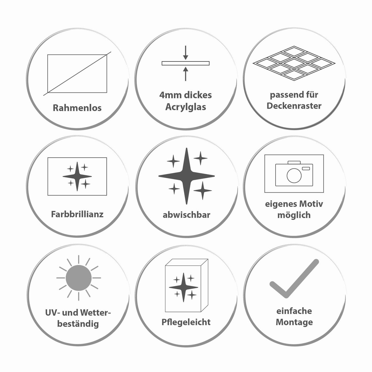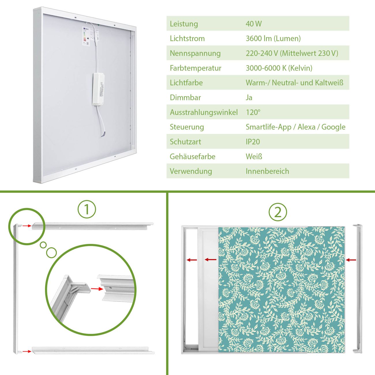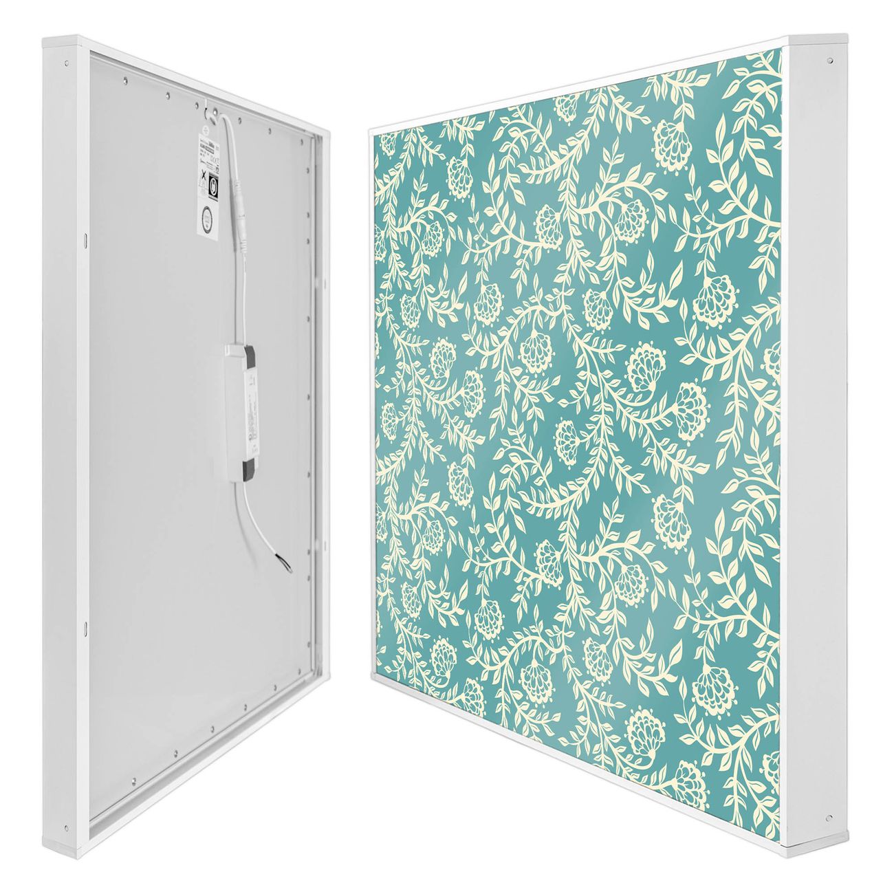 Entdecken Sie unsere vielseitigen Lichtdecken, hier in der Größe 124 x 62cm mit dem Motiv Motiv Rankenornament - Ihre Beleuchtungslösung für jede Umgebung Beleuchten Sie Ihren Raum nicht nur, sondern schaffen Sie Atmosphäre! Die banjado Lichtdecke verwandelt jeden Ort, ob zu Hause, in Praxen, Büros oder Studios in eine Wohlfühloase. Unsere einzelnen Elemente haben eine genormte Einheitsgröße von 62 x 62cm und können somit in jede gängige Rasterdecken verbaut werden. So finden Sie Ihre passende Ausführung: Gern helfen wir Ihnen, die passende Ausführung zu wählen. Hierfür muss die aktuelle Gegebenheit Ihrer Decke oder Wand beachtet werden. Haben Sie bereits eine Rasterdecke (auch Odenwalddecke genannt)? Hier bestellen Sie lediglich das Motiv + Beleuchtungspanel, denn beides wird in die bereits vorhandene Decke eingelegt. Haben Sie eine glatte Decke mit Lichtauslass oder möchten die Lichtdecke an der Wand befestigen? Hier bestellen Sie bitte Motiv + Beleuchtungspanel + Deckenbefestigung, eine Aufbauanleitung liegt immer bei. Die Lichtdecke kann sowohl an der Decke als auch an der Wand montiert werden, perfekt für kreative Lichtakzente oder alternative Beleuchtungslösungen. Haben Sie bereits eine Lichtdecke und möchten nur das Motiv wechseln? Hier bestellen Sie bitte nur Motiv, der Wechsel ist denkbar einfach. Der Aufbau Ihrer banjado Lichtdecke gestaltet sich unkompliziert, dank einer verständlichen Anleitung, die Ihnen Schritt für Schritt durch den Montageprozess hilft. Für die endgültige Installation und den sicheren Anschluss empfehlen wir die Hinzuziehung eines Fachmanns, um die optimale Funktion und Sicherheit Ihrer Beleuchtung zu gewährleisten. Falls Sie einen Fachmann für die Installation benötigen, geben Sie uns gern Bescheid, wir vermitteln Ihnen gern einen geeigneten Ansprechpartner aus Ihrer Nähe. Steuerung: Steigern Sie Ihr Beleuchtungserlebnis mit der nahtlosen Integration in Ihr Smart Home. Durch die Kompatibilität mit der SmartLife App, Alexa und Google Assistant wird Ihr Smartphone zur zentralen Steuerungseinheit. Ihr Handy fungiert hierbei sozusagen als Fernbedienung. Legen Sie individuelle Lichtszenen in der App fest, die bei Aktivierung über den Wand-Ein-/Ausschalter immer wieder abgerufen werden können ohne Handy. Mit der Szenenfunktion in der Smart App können Sie die Beleuchtung personalisieren und steuern, sodass sie auf Ihre individuellen Bedürfnisse, Tagesrhythmus und Stimmung zugeschnitten ist. Beispielsweise können Sie sich in der Morgendämmerung durch ein sanftes Licht wecken lassen oder das Licht der Praxis werktags um 7 Uhr automatisch einschalten lassen. Dieses kann dann natürlich auch zu einer bestimmten Zeit automatisch ausgeschaltet werden. Motivwahl: Diese einzigartige Lichtdecke zeichnet sich durch ihre Fähigkeit aus, die Lichtfarbe je nach gewähltem Motiv anzupassen - ein Baum wirft ein sanftes grünes Licht, während eine Wolkendecke Ihren Raum in ein beruhigendes blaues Leuchten hüllt. Berücksichtigen Sie dies bitte bei Ihrer Motivauswahl. Sie können das Motiv jederzeit ohne großen Aufwand austauschen, ob nach Jahreszeit oder anderem Anlass, unsere Auswahl lässt kaum Wünsche offen. Wir fertigen Ihnen gern eine personalisierte Lichtdecke mit einem eigenen Motiv oder Logo oder Foto, schreiben Sie uns jederzeit an. Technische Daten: Das Motiv ist auf einer 4mm starken Acrylglas Scheibe aufgebracht, das Gesamtgewicht Ihrer Ausführung beträgt 4,5kg. Die Farbtemperatur lässt sich frei einstellen von 3000 bis 6000 Kelvin, damit können Sie stufenlos zwischen warmweiß, neutralweiß und kaltweiß wählen. Die Gesamtleistung bei Ihrer gewählten Ausführung beträgt 80W. Der Lichtstrom beträgt 3600 Lumen, die Nennspannung 230 V. Die Lichtdecke ist mit Schutzart IP20 für den Innenbereich konzipiert und sollte nicht im Nassbereich verwendet werden.