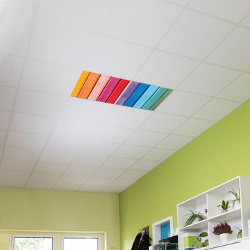 Entdecken Sie unsere vielseitigen Lichtdecken, hier in der Größe 124 x 62cm mit dem Motiv Motiv Regenbogenfarben - Ihre Beleuchtungslösung für jede Umgebung Beleuchten Sie Ihren Raum nicht nur, sondern schaffen Sie Atmosphäre! Die banjado Lichtdecke verwandelt jeden Ort, ob zu Hause, in Praxen, Büros oder Studios in eine Wohlfühloase. Unsere einzelnen Elemente haben eine genormte Einheitsgröße von 62 x 62cm und können somit in jede gängige Rasterdecken verbaut werden. So finden Sie Ihre passende Ausführung: Gern helfen wir Ihnen, die passende Ausführung zu wählen. Hierfür muss die aktuelle Gegebenheit Ihrer Decke oder Wand beachtet werden. Haben Sie bereits eine Rasterdecke (auch Odenwalddecke genannt)? Hier bestellen Sie lediglich das Motiv + Beleuchtungspanel, denn beides wird in die bereits vorhandene Decke eingelegt. Haben Sie eine glatte Decke mit Lichtauslass oder möchten die Lichtdecke an der Wand befestigen? Hier bestellen Sie bitte Motiv + Beleuchtungspanel + Deckenbefestigung, eine Aufbauanleitung liegt immer bei. Die Lichtdecke kann sowohl an der Decke als auch an der Wand montiert werden, perfekt für kreative Lichtakzente oder alternative Beleuchtungslösungen. Haben Sie bereits eine Lichtdecke und möchten nur das Motiv wechseln? Hier bestellen Sie bitte nur Motiv, der Wechsel ist denkbar einfach. Der Aufbau Ihrer banjado Lichtdecke gestaltet sich unkompliziert, dank einer verständlichen Anleitung, die Ihnen Schritt für Schritt durch den Montageprozess hilft. Für die endgültige Installation und den sicheren Anschluss empfehlen wir die Hinzuziehung eines Fachmanns, um die optimale Funktion und Sicherheit Ihrer Beleuchtung zu gewährleisten. Falls Sie einen Fachmann für die Installation benötigen, geben Sie uns gern Bescheid, wir vermitteln Ihnen gern einen geeigneten Ansprechpartner aus Ihrer Nähe. Steuerung: Steigern Sie Ihr Beleuchtungserlebnis mit der nahtlosen Integration in Ihr Smart Home. Durch die Kompatibilität mit der SmartLife App, Alexa und Google Assistant wird Ihr Smartphone zur zentralen Steuerungseinheit. Ihr Handy fungiert hierbei sozusagen als Fernbedienung. Legen Sie individuelle Lichtszenen in der App fest, die bei Aktivierung über den Wand-Ein-/Ausschalter immer wieder abgerufen werden können ohne Handy. Mit der Szenenfunktion in der Smart App können Sie die Beleuchtung personalisieren und steuern, sodass sie auf Ihre individuellen Bedürfnisse, Tagesrhythmus und Stimmung zugeschnitten ist. Beispielsweise können Sie sich in der Morgendämmerung durch ein sanftes Licht wecken lassen oder das Licht der Praxis werktags um 7 Uhr automatisch einschalten lassen. Dieses kann dann natürlich auch zu einer bestimmten Zeit automatisch ausgeschaltet werden. Motivwahl: Diese einzigartige Lichtdecke zeichnet sich durch ihre Fähigkeit aus, die Lichtfarbe je nach gewähltem Motiv anzupassen - ein Baum wirft ein sanftes grünes Licht, während eine Wolkendecke Ihren Raum in ein beruhigendes blaues Leuchten hüllt. Berücksichtigen Sie dies bitte bei Ihrer Motivauswahl. Sie können das Motiv jederzeit ohne großen Aufwand austauschen, ob nach Jahreszeit oder anderem Anlass, unsere Auswahl lässt kaum Wünsche offen. Wir fertigen Ihnen gern eine personalisierte Lichtdecke mit einem eigenen Motiv oder Logo oder Foto, schreiben Sie uns jederzeit an. Technische Daten: Das Motiv ist auf einer 4mm starken Acrylglas Scheibe aufgebracht, das Gesamtgewicht Ihrer Ausführung beträgt 8,9kg. Die Farbtemperatur lässt sich frei einstellen von 3000 bis 6000 Kelvin, damit können Sie stufenlos zwischen warmweiß, neutralweiß und kaltweiß wählen. Die Gesamtleistung bei Ihrer gewählten Ausführung beträgt 80W. Der Lichtstrom beträgt 3600 Lumen, die Nennspannung 230 V. Die Lichtdecke ist mit Schutzart IP20 für den Innenbereich konzipiert und sollte nicht im Nassbereich verwendet werden.