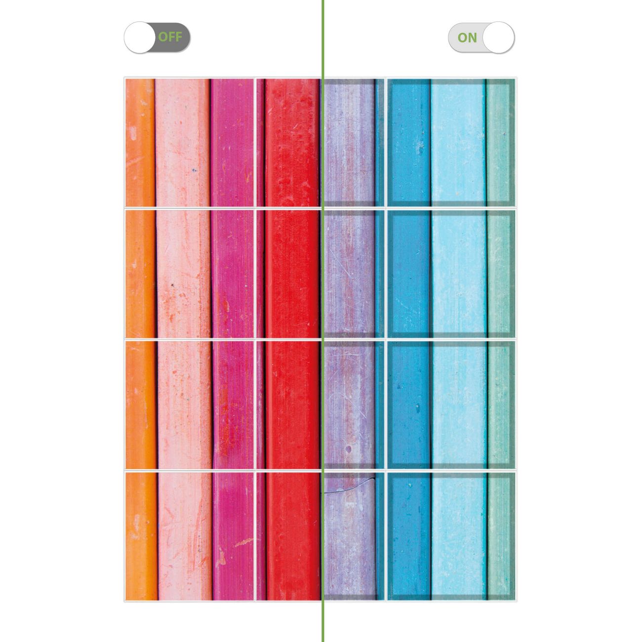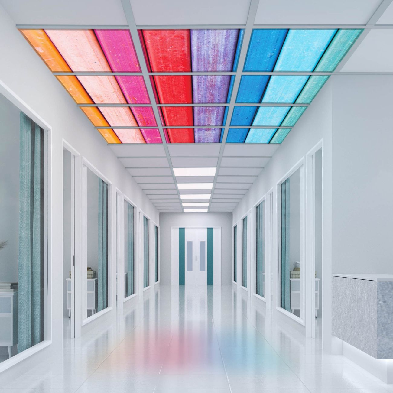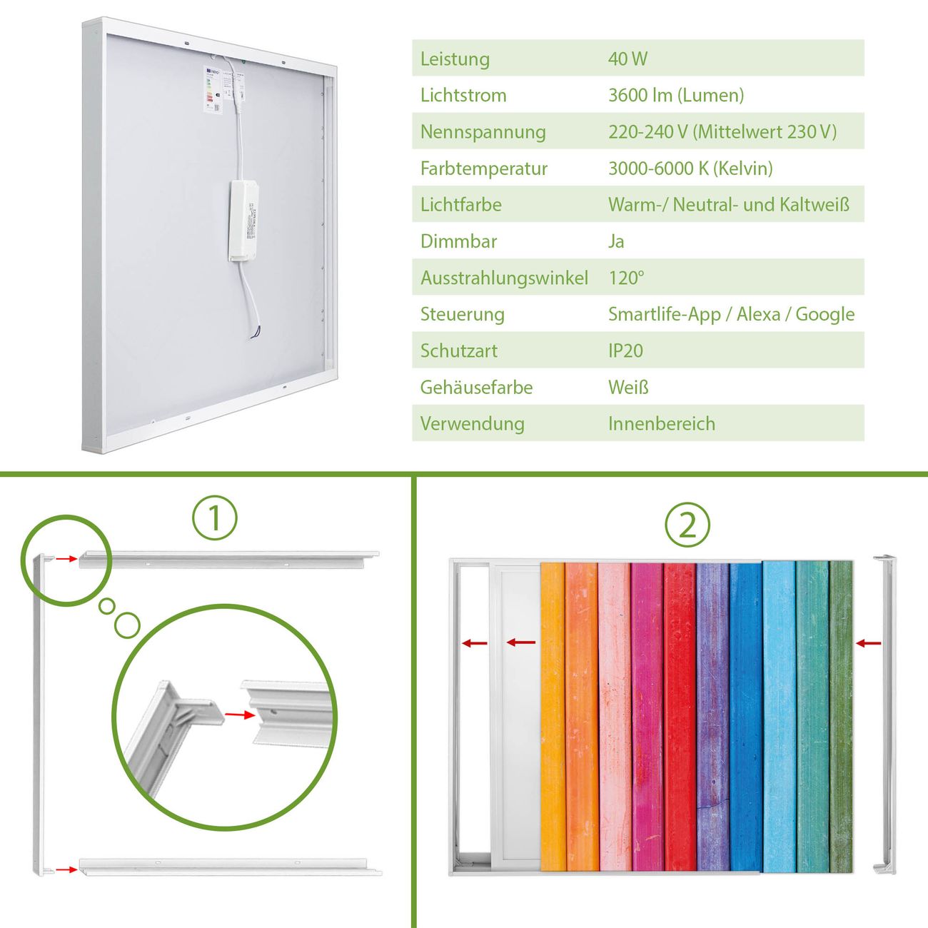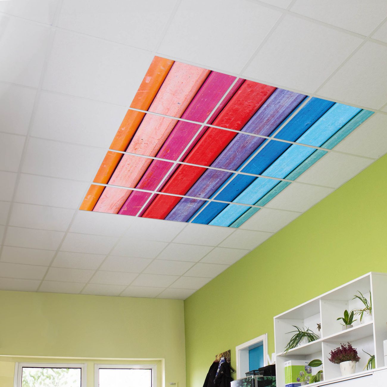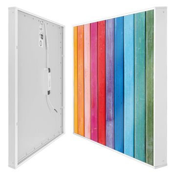 Entdecken Sie unsere vielseitigen Lichtdecken, hier in der Größe 186 x 248cm mit dem Motiv Motiv Regenbogenfarben - Ihre Beleuchtungslösung für jede Umgebung Beleuchten Sie Ihren Raum nicht nur, sondern schaffen Sie Atmosphäre! Die banjado Lichtdecke verwandelt jeden Ort, ob zu Hause, in Praxen, Büros oder Studios in eine Wohlfühloase. Unsere einzelnen Elemente haben eine genormte Einheitsgröße von 62 x 62cm und können somit in jede gängige Rasterdecken verbaut werden. So finden Sie Ihre passende Ausführung: Gern helfen wir Ihnen, die passende Ausführung zu wählen. Hierfür muss die aktuelle Gegebenheit Ihrer Decke oder Wand beachtet werden. Haben Sie bereits eine Rasterdecke (auch Odenwalddecke genannt)? Hier bestellen Sie lediglich das Motiv + Beleuchtungspanel, denn beides wird in die bereits vorhandene Decke eingelegt. Haben Sie eine glatte Decke mit Lichtauslass oder möchten die Lichtdecke an der Wand befestigen? Hier bestellen Sie bitte Motiv + Beleuchtungspanel + Deckenbefestigung, eine Aufbauanleitung liegt immer bei. Die Lichtdecke kann sowohl an der Decke als auch an der Wand montiert werden, perfekt für kreative Lichtakzente oder alternative Beleuchtungslösungen. Haben Sie bereits eine Lichtdecke und möchten nur das Motiv wechseln? Hier bestellen Sie bitte nur Motiv, der Wechsel ist denkbar einfach. Der Aufbau Ihrer banjado Lichtdecke gestaltet sich unkompliziert, dank einer verständlichen Anleitung, die Ihnen Schritt für Schritt durch den Montageprozess hilft. Für die endgültige Installation und den sicheren Anschluss empfehlen wir die Hinzuziehung eines Fachmanns, um die optimale Funktion und Sicherheit Ihrer Beleuchtung zu gewährleisten. Falls Sie einen Fachmann für die Installation benötigen, geben Sie uns gern Bescheid, wir vermitteln Ihnen gern einen geeigneten Ansprechpartner aus Ihrer Nähe. Steuerung: Steigern Sie Ihr Beleuchtungserlebnis mit der nahtlosen Integration in Ihr Smart Home. Durch die Kompatibilität mit der SmartLife App, Alexa und Google Assistant wird Ihr Smartphone zur zentralen Steuerungseinheit. Ihr Handy fungiert hierbei sozusagen als Fernbedienung. Legen Sie individuelle Lichtszenen in der App fest, die bei Aktivierung über den Wand-Ein-/Ausschalter immer wieder abgerufen werden können ohne Handy. Mit der Szenenfunktion in der Smart App können Sie die Beleuchtung personalisieren und steuern, sodass sie auf Ihre individuellen Bedürfnisse, Tagesrhythmus und Stimmung zugeschnitten ist. Beispielsweise können Sie sich in der Morgendämmerung durch ein sanftes Licht wecken lassen oder das Licht der Praxis werktags um 7 Uhr automatisch einschalten lassen. Dieses kann dann natürlich auch zu einer bestimmten Zeit automatisch ausgeschaltet werden. Motivwahl: Diese einzigartige Lichtdecke zeichnet sich durch ihre Fähigkeit aus, die Lichtfarbe je nach gewähltem Motiv anzupassen - ein Baum wirft ein sanftes grünes Licht, während eine Wolkendecke Ihren Raum in ein beruhigendes blaues Leuchten hüllt. Berücksichtigen Sie dies bitte bei Ihrer Motivauswahl. Sie können das Motiv jederzeit ohne großen Aufwand austauschen, ob nach Jahreszeit oder anderem Anlass, unsere Auswahl lässt kaum Wünsche offen. Wir fertigen Ihnen gern eine personalisierte Lichtdecke mit einem eigenen Motiv oder Logo oder Foto, schreiben Sie uns jederzeit an. Technische Daten: Das Motiv ist auf einer 4mm starken Acrylglas Scheibe aufgebracht, das Gesamtgewicht Ihrer Ausführung beträgt 27,1kg. Die Farbtemperatur lässt sich frei einstellen von 3000 bis 6000 Kelvin, damit können Sie stufenlos zwischen warmweiß, neutralweiß und kaltweiß wählen. Die Gesamtleistung bei Ihrer gewählten Ausführung beträgt 480W. Der Lichtstrom beträgt 3600 Lumen, die Nennspannung 230 V. Die Lichtdecke ist mit Schutzart IP20 für den Innenbereich konzipiert und sollte nicht im Nassbereich verwendet werden.