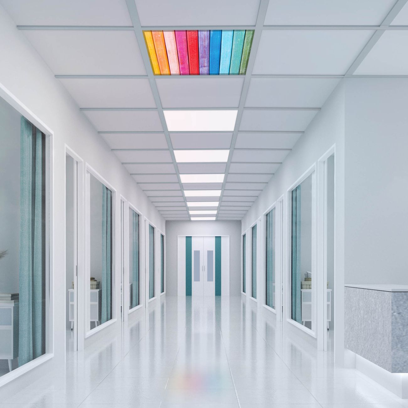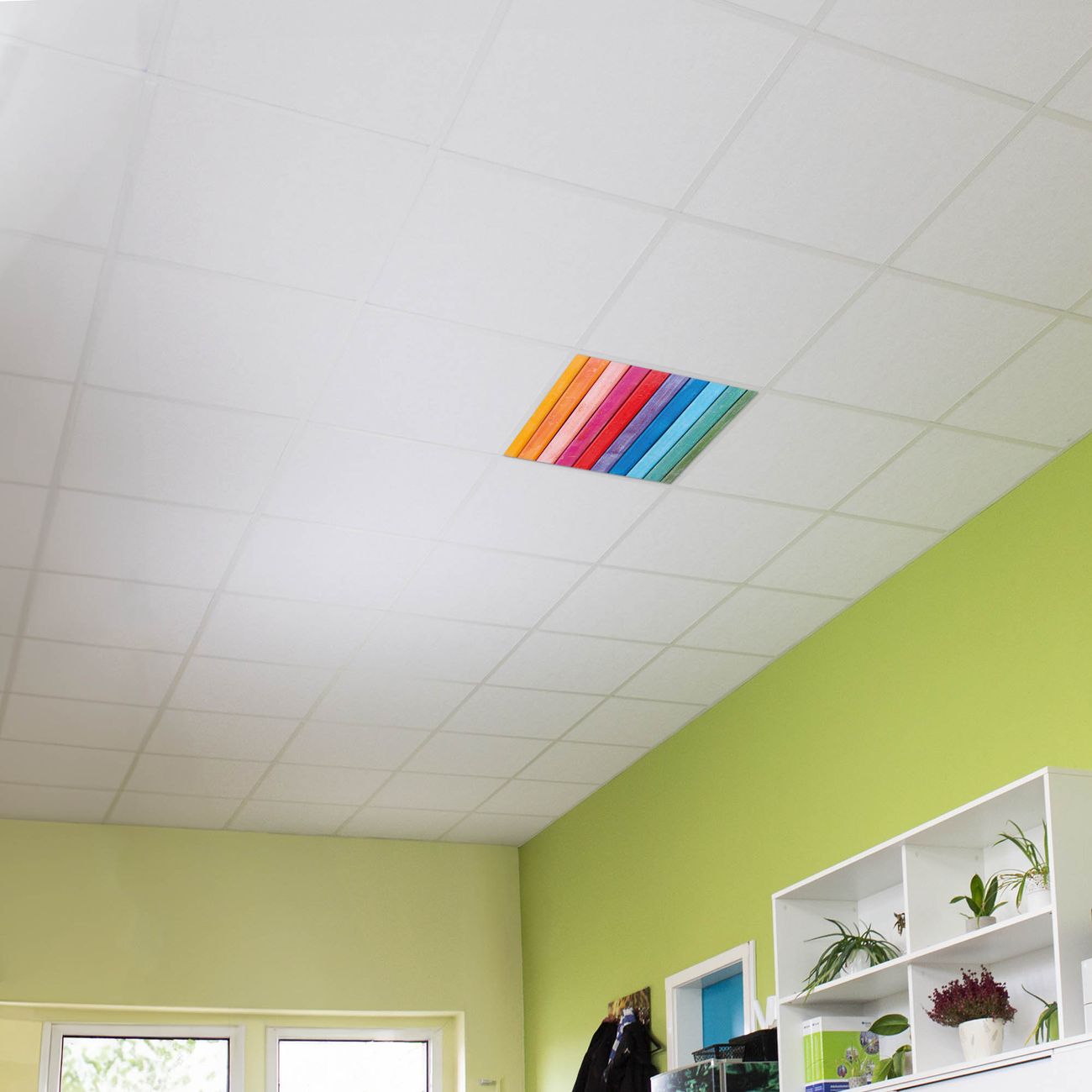 Entdecken Sie unsere vielseitigen Lichtdecken, hier in der Größe 62 x 62cm mit dem Motiv Motiv Regenbogenfarben - Ihre Beleuchtungslösung für jede Umgebung Beleuchten Sie Ihren Raum nicht nur, sondern schaffen Sie Atmosphäre! Die banjado Lichtdecke verwandelt jeden Ort, ob zu Hause, in Praxen, Büros oder Studios in eine Wohlfühloase. Unsere einzelnen Elemente haben eine genormte Einheitsgröße von 62 x 62cm und können somit in jede gängige Rasterdecken verbaut werden. So finden Sie Ihre passende Ausführung: Gern helfen wir Ihnen, die passende Ausführung zu wählen. Hierfür muss die aktuelle Gegebenheit Ihrer Decke oder Wand beachtet werden. Haben Sie bereits eine Rasterdecke (auch Odenwalddecke genannt)? Hier bestellen Sie lediglich das Motiv + Beleuchtungspanel, denn beides wird in die bereits vorhandene Decke eingelegt. Haben Sie eine glatte Decke mit Lichtauslass oder möchten die Lichtdecke an der Wand befestigen? Hier bestellen Sie bitte Motiv + Beleuchtungspanel + Deckenbefestigung, eine Aufbauanleitung liegt immer bei. Die Lichtdecke kann sowohl an der Decke als auch an der Wand montiert werden, perfekt für kreative Lichtakzente oder alternative Beleuchtungslösungen. Haben Sie bereits eine Lichtdecke und möchten nur das Motiv wechseln? Hier bestellen Sie bitte nur Motiv, der Wechsel ist denkbar einfach. Der Aufbau Ihrer banjado Lichtdecke gestaltet sich unkompliziert, dank einer verständlichen Anleitung, die Ihnen Schritt für Schritt durch den Montageprozess hilft. Für die endgültige Installation und den sicheren Anschluss empfehlen wir die Hinzuziehung eines Fachmanns, um die optimale Funktion und Sicherheit Ihrer Beleuchtung zu gewährleisten. Falls Sie einen Fachmann für die Installation benötigen, geben Sie uns gern Bescheid, wir vermitteln Ihnen gern einen geeigneten Ansprechpartner aus Ihrer Nähe. Steuerung: Steigern Sie Ihr Beleuchtungserlebnis mit der nahtlosen Integration in Ihr Smart Home. Durch die Kompatibilität mit der SmartLife App, Alexa und Google Assistant wird Ihr Smartphone zur zentralen Steuerungseinheit. Ihr Handy fungiert hierbei sozusagen als Fernbedienung. Legen Sie individuelle Lichtszenen in der App fest, die bei Aktivierung über den Wand-Ein-/Ausschalter immer wieder abgerufen werden können ohne Handy. Mit der Szenenfunktion in der Smart App können Sie die Beleuchtung personalisieren und steuern, sodass sie auf Ihre individuellen Bedürfnisse, Tagesrhythmus und Stimmung zugeschnitten ist. Beispielsweise können Sie sich in der Morgendämmerung durch ein sanftes Licht wecken lassen oder das Licht der Praxis werktags um 7 Uhr automatisch einschalten lassen. Dieses kann dann natürlich auch zu einer bestimmten Zeit automatisch ausgeschaltet werden. Motivwahl: Diese einzigartige Lichtdecke zeichnet sich durch ihre Fähigkeit aus, die Lichtfarbe je nach gewähltem Motiv anzupassen - ein Baum wirft ein sanftes grünes Licht, während eine Wolkendecke Ihren Raum in ein beruhigendes blaues Leuchten hüllt. Berücksichtigen Sie dies bitte bei Ihrer Motivauswahl. Sie können das Motiv jederzeit ohne großen Aufwand austauschen, ob nach Jahreszeit oder anderem Anlass, unsere Auswahl lässt kaum Wünsche offen. Wir fertigen Ihnen gern eine personalisierte Lichtdecke mit einem eigenen Motiv oder Logo oder Foto, schreiben Sie uns jederzeit an. Technische Daten: Das Motiv ist auf einer 4mm starken Acrylglas Scheibe aufgebracht, das Gesamtgewicht Ihrer Ausführung beträgt 4,4kg. Die Farbtemperatur lässt sich frei einstellen von 3000 bis 6000 Kelvin, damit können Sie stufenlos zwischen warmweiß, neutralweiß und kaltweiß wählen. Die Gesamtleistung bei Ihrer gewählten Ausführung beträgt 40W. Der Lichtstrom beträgt 3600 Lumen, die Nennspannung 230 V. Die Lichtdecke ist mit Schutzart IP20 für den Innenbereich konzipiert und sollte nicht im Nassbereich verwendet werden.
