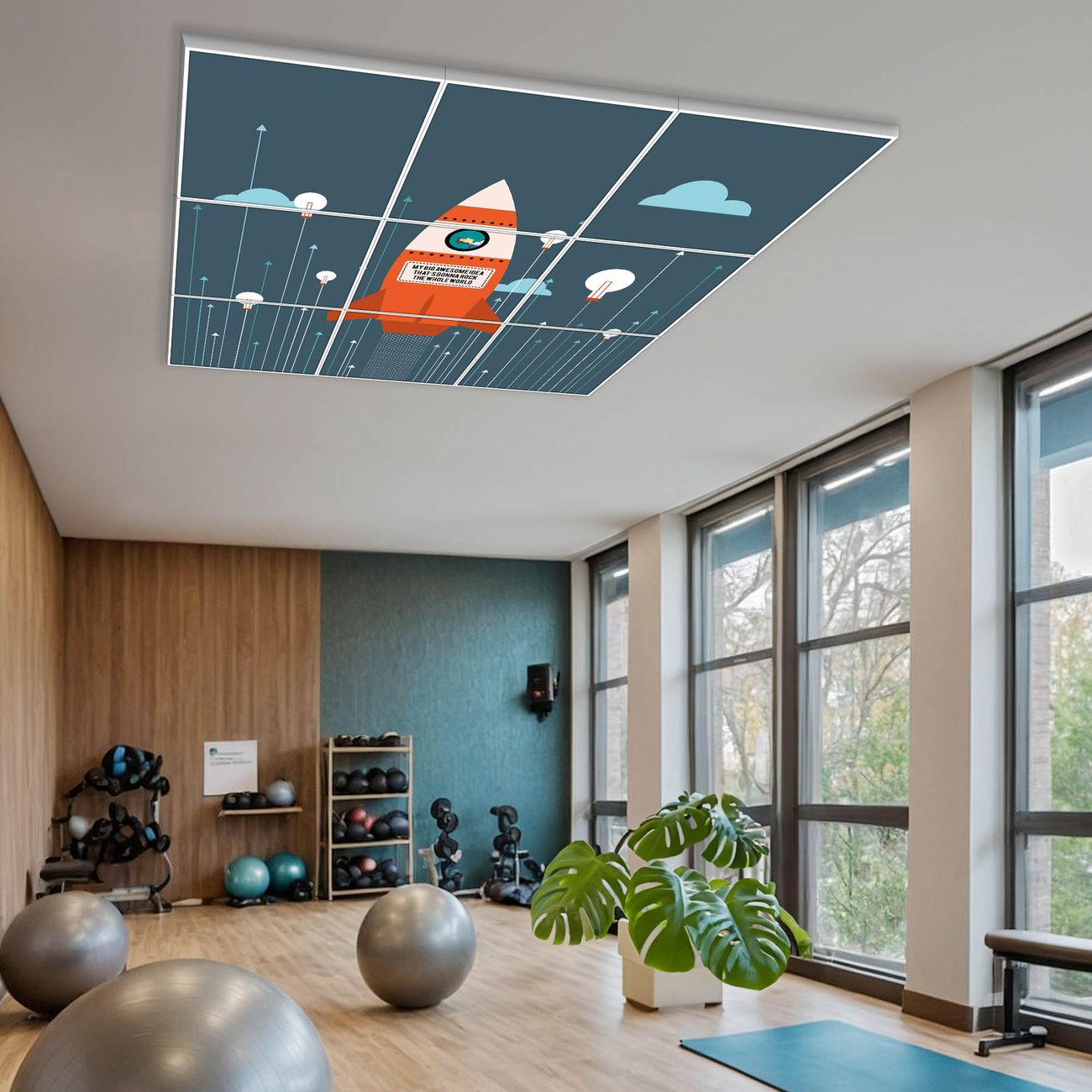Entdecken Sie unsere vielseitigen Lichtdecken, hier in der Größe 186 x 186cm mit dem Motiv Motiv Rock the World - Ihre Beleuchtungslösung für jede Umgebung Beleuchten Sie Ihren Raum nicht nur, sondern schaffen Sie Atmosphäre! Die banjado Lichtdecke verwandelt jeden Ort, ob zu Hause, in Praxen, Büros oder Studios in eine Wohlfühloase. Unsere einzelnen Elemente haben eine genormte Einheitsgröße von 62 x 62cm und können somit in jede gängige Rasterdecken verbaut werden. So finden Sie Ihre passende Ausführung: Gern helfen wir Ihnen, die passende Ausführung zu wählen. Hierfür muss die aktuelle Gegebenheit Ihrer Decke oder Wand beachtet werden. Haben Sie bereits eine Rasterdecke (auch Odenwalddecke genannt)? Hier bestellen Sie lediglich das Motiv + Beleuchtungspanel, denn beides wird in die bereits vorhandene Decke eingelegt. Haben Sie eine glatte Decke mit Lichtauslass oder möchten die Lichtdecke an der Wand befestigen? Hier bestellen Sie bitte Motiv + Beleuchtungspanel + Deckenbefestigung, eine Aufbauanleitung liegt immer bei. Die Lichtdecke kann sowohl an der Decke als auch an der Wand montiert werden, perfekt für kreative Lichtakzente oder alternative Beleuchtungslösungen. Haben Sie bereits eine Lichtdecke und möchten nur das Motiv wechseln? Hier bestellen Sie bitte nur Motiv, der Wechsel ist denkbar einfach. Der Aufbau Ihrer banjado Lichtdecke gestaltet sich unkompliziert, dank einer verständlichen Anleitung, die Ihnen Schritt für Schritt durch den Montageprozess hilft. Für die endgültige Installation und den sicheren Anschluss empfehlen wir die Hinzuziehung eines Fachmanns, um die optimale Funktion und Sicherheit Ihrer Beleuchtung zu gewährleisten. Falls Sie einen Fachmann für die Installation benötigen, geben Sie uns gern Bescheid, wir vermitteln Ihnen gern einen geeigneten Ansprechpartner aus Ihrer Nähe. Steuerung: Steigern Sie Ihr Beleuchtungserlebnis mit der nahtlosen Integration in Ihr Smart Home. Durch die Kompatibilität mit der SmartLife App, Alexa und Google Assistant wird Ihr Smartphone zur zentralen Steuerungseinheit. Ihr Handy fungiert hierbei sozusagen als Fernbedienung. Legen Sie individuelle Lichtszenen in der App fest, die bei Aktivierung über den Wand-Ein-/Ausschalter immer wieder abgerufen werden können ohne Handy. Mit der Szenenfunktion in der Smart App können Sie die Beleuchtung personalisieren und steuern, sodass sie auf Ihre individuellen Bedürfnisse, Tagesrhythmus und Stimmung zugeschnitten ist. Beispielsweise können Sie sich in der Morgendämmerung durch ein sanftes Licht wecken lassen oder das Licht der Praxis werktags um 7 Uhr automatisch einschalten lassen. Dieses kann dann natürlich auch zu einer bestimmten Zeit automatisch ausgeschaltet werden. Motivwahl: Diese einzigartige Lichtdecke zeichnet sich durch ihre Fähigkeit aus, die Lichtfarbe je nach gewähltem Motiv anzupassen - ein Baum wirft ein sanftes grünes Licht, während eine Wolkendecke Ihren Raum in ein beruhigendes blaues Leuchten hüllt. Berücksichtigen Sie dies bitte bei Ihrer Motivauswahl. Sie können das Motiv jederzeit ohne großen Aufwand austauschen, ob nach Jahreszeit oder anderem Anlass, unsere Auswahl lässt kaum Wünsche offen. Wir fertigen Ihnen gern eine personalisierte Lichtdecke mit einem eigenen Motiv oder Logo oder Foto, schreiben Sie uns jederzeit an. Technische Daten: Das Motiv ist auf einer 4mm starken Acrylglas Scheibe aufgebracht, das Gesamtgewicht Ihrer Ausführung beträgt 44,4kg. Die Farbtemperatur lässt sich frei einstellen von 3000 bis 6000 Kelvin, damit können Sie stufenlos zwischen warmweiß, neutralweiß und kaltweiß wählen. Die Gesamtleistung bei Ihrer gewählten Ausführung beträgt 360W. Der Lichtstrom beträgt 3600 Lumen, die Nennspannung 230 V. Die Lichtdecke ist mit Schutzart IP20 für den Innenbereich konzipiert und sollte nicht im Nassbereich verwendet werden.