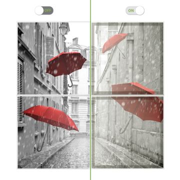 Entdecken Sie unsere vielseitigen Lichtdecken, hier in der Größe 124 x 124cm mit dem Motiv Motiv Rote Schirme - Ihre Beleuchtungslösung für jede Umgebung Beleuchten Sie Ihren Raum nicht nur, sondern schaffen Sie Atmosphäre! Die banjado Lichtdecke verwandelt jeden Ort, ob zu Hause, in Praxen, Büros oder Studios in eine Wohlfühloase. Unsere einzelnen Elemente haben eine genormte Einheitsgröße von 62 x 62cm und können somit in jede gängige Rasterdecken verbaut werden. So finden Sie Ihre passende Ausführung: Gern helfen wir Ihnen, die passende Ausführung zu wählen. Hierfür muss die aktuelle Gegebenheit Ihrer Decke oder Wand beachtet werden. Haben Sie bereits eine Rasterdecke (auch Odenwalddecke genannt)? Hier bestellen Sie lediglich das Motiv + Beleuchtungspanel, denn beides wird in die bereits vorhandene Decke eingelegt. Haben Sie eine glatte Decke mit Lichtauslass oder möchten die Lichtdecke an der Wand befestigen? Hier bestellen Sie bitte Motiv + Beleuchtungspanel + Deckenbefestigung, eine Aufbauanleitung liegt immer bei. Die Lichtdecke kann sowohl an der Decke als auch an der Wand montiert werden, perfekt für kreative Lichtakzente oder alternative Beleuchtungslösungen. Haben Sie bereits eine Lichtdecke und möchten nur das Motiv wechseln? Hier bestellen Sie bitte nur Motiv, der Wechsel ist denkbar einfach. Der Aufbau Ihrer banjado Lichtdecke gestaltet sich unkompliziert, dank einer verständlichen Anleitung, die Ihnen Schritt für Schritt durch den Montageprozess hilft. Für die endgültige Installation und den sicheren Anschluss empfehlen wir die Hinzuziehung eines Fachmanns, um die optimale Funktion und Sicherheit Ihrer Beleuchtung zu gewährleisten. Falls Sie einen Fachmann für die Installation benötigen, geben Sie uns gern Bescheid, wir vermitteln Ihnen gern einen geeigneten Ansprechpartner aus Ihrer Nähe. Steuerung: Steigern Sie Ihr Beleuchtungserlebnis mit der nahtlosen Integration in Ihr Smart Home. Durch die Kompatibilität mit der SmartLife App, Alexa und Google Assistant wird Ihr Smartphone zur zentralen Steuerungseinheit. Ihr Handy fungiert hierbei sozusagen als Fernbedienung. Legen Sie individuelle Lichtszenen in der App fest, die bei Aktivierung über den Wand-Ein-/Ausschalter immer wieder abgerufen werden können ohne Handy. Mit der Szenenfunktion in der Smart App können Sie die Beleuchtung personalisieren und steuern, sodass sie auf Ihre individuellen Bedürfnisse, Tagesrhythmus und Stimmung zugeschnitten ist. Beispielsweise können Sie sich in der Morgendämmerung durch ein sanftes Licht wecken lassen oder das Licht der Praxis werktags um 7 Uhr automatisch einschalten lassen. Dieses kann dann natürlich auch zu einer bestimmten Zeit automatisch ausgeschaltet werden. Motivwahl: Diese einzigartige Lichtdecke zeichnet sich durch ihre Fähigkeit aus, die Lichtfarbe je nach gewähltem Motiv anzupassen - ein Baum wirft ein sanftes grünes Licht, während eine Wolkendecke Ihren Raum in ein beruhigendes blaues Leuchten hüllt. Berücksichtigen Sie dies bitte bei Ihrer Motivauswahl. Sie können das Motiv jederzeit ohne großen Aufwand austauschen, ob nach Jahreszeit oder anderem Anlass, unsere Auswahl lässt kaum Wünsche offen. Wir fertigen Ihnen gern eine personalisierte Lichtdecke mit einem eigenen Motiv oder Logo oder Foto, schreiben Sie uns jederzeit an. Technische Daten: Das Motiv ist auf einer 4mm starken Acrylglas Scheibe aufgebracht, das Gesamtgewicht Ihrer Ausführung beträgt 9,0kg. Die Farbtemperatur lässt sich frei einstellen von 3000 bis 6000 Kelvin, damit können Sie stufenlos zwischen warmweiß, neutralweiß und kaltweiß wählen. Die Gesamtleistung bei Ihrer gewählten Ausführung beträgt 160W. Der Lichtstrom beträgt 3600 Lumen, die Nennspannung 230 V. Die Lichtdecke ist mit Schutzart IP20 für den Innenbereich konzipiert und sollte nicht im Nassbereich verwendet werden.