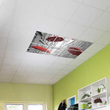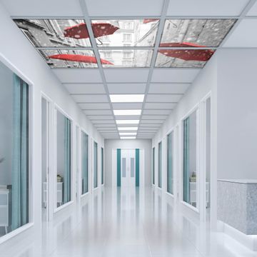 Entdecken Sie unsere vielseitigen Lichtdecken, hier in der Größe 186 x 124cm mit dem Motiv Motiv Rote Schirme - Ihre Beleuchtungslösung für jede Umgebung Beleuchten Sie Ihren Raum nicht nur, sondern schaffen Sie Atmosphäre! Die banjado Lichtdecke verwandelt jeden Ort, ob zu Hause, in Praxen, Büros oder Studios in eine Wohlfühloase. Unsere einzelnen Elemente haben eine genormte Einheitsgröße von 62 x 62cm und können somit in jede gängige Rasterdecken verbaut werden. So finden Sie Ihre passende Ausführung: Gern helfen wir Ihnen, die passende Ausführung zu wählen. Hierfür muss die aktuelle Gegebenheit Ihrer Decke oder Wand beachtet werden. Haben Sie bereits eine Rasterdecke (auch Odenwalddecke genannt)? Hier bestellen Sie lediglich das Motiv + Beleuchtungspanel, denn beides wird in die bereits vorhandene Decke eingelegt. Haben Sie eine glatte Decke mit Lichtauslass oder möchten die Lichtdecke an der Wand befestigen? Hier bestellen Sie bitte Motiv + Beleuchtungspanel + Deckenbefestigung, eine Aufbauanleitung liegt immer bei. Die Lichtdecke kann sowohl an der Decke als auch an der Wand montiert werden, perfekt für kreative Lichtakzente oder alternative Beleuchtungslösungen. Haben Sie bereits eine Lichtdecke und möchten nur das Motiv wechseln? Hier bestellen Sie bitte nur Motiv, der Wechsel ist denkbar einfach. Der Aufbau Ihrer banjado Lichtdecke gestaltet sich unkompliziert, dank einer verständlichen Anleitung, die Ihnen Schritt für Schritt durch den Montageprozess hilft. Für die endgültige Installation und den sicheren Anschluss empfehlen wir die Hinzuziehung eines Fachmanns, um die optimale Funktion und Sicherheit Ihrer Beleuchtung zu gewährleisten. Falls Sie einen Fachmann für die Installation benötigen, geben Sie uns gern Bescheid, wir vermitteln Ihnen gern einen geeigneten Ansprechpartner aus Ihrer Nähe. Steuerung: Steigern Sie Ihr Beleuchtungserlebnis mit der nahtlosen Integration in Ihr Smart Home. Durch die Kompatibilität mit der SmartLife App, Alexa und Google Assistant wird Ihr Smartphone zur zentralen Steuerungseinheit. Ihr Handy fungiert hierbei sozusagen als Fernbedienung. Legen Sie individuelle Lichtszenen in der App fest, die bei Aktivierung über den Wand-Ein-/Ausschalter immer wieder abgerufen werden können ohne Handy. Mit der Szenenfunktion in der Smart App können Sie die Beleuchtung personalisieren und steuern, sodass sie auf Ihre individuellen Bedürfnisse, Tagesrhythmus und Stimmung zugeschnitten ist. Beispielsweise können Sie sich in der Morgendämmerung durch ein sanftes Licht wecken lassen oder das Licht der Praxis werktags um 7 Uhr automatisch einschalten lassen. Dieses kann dann natürlich auch zu einer bestimmten Zeit automatisch ausgeschaltet werden. Motivwahl: Diese einzigartige Lichtdecke zeichnet sich durch ihre Fähigkeit aus, die Lichtfarbe je nach gewähltem Motiv anzupassen - ein Baum wirft ein sanftes grünes Licht, während eine Wolkendecke Ihren Raum in ein beruhigendes blaues Leuchten hüllt. Berücksichtigen Sie dies bitte bei Ihrer Motivauswahl. Sie können das Motiv jederzeit ohne großen Aufwand austauschen, ob nach Jahreszeit oder anderem Anlass, unsere Auswahl lässt kaum Wünsche offen. Wir fertigen Ihnen gern eine personalisierte Lichtdecke mit einem eigenen Motiv oder Logo oder Foto, schreiben Sie uns jederzeit an. Technische Daten: Das Motiv ist auf einer 4mm starken Acrylglas Scheibe aufgebracht, das Gesamtgewicht Ihrer Ausführung beträgt 26,6kg. Die Farbtemperatur lässt sich frei einstellen von 3000 bis 6000 Kelvin, damit können Sie stufenlos zwischen warmweiß, neutralweiß und kaltweiß wählen. Die Gesamtleistung bei Ihrer gewählten Ausführung beträgt 240W. Der Lichtstrom beträgt 3600 Lumen, die Nennspannung 230 V. Die Lichtdecke ist mit Schutzart IP20 für den Innenbereich konzipiert und sollte nicht im Nassbereich verwendet werden.