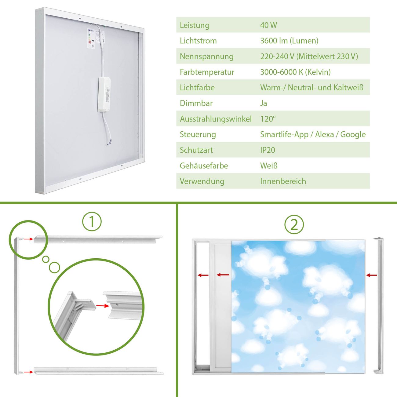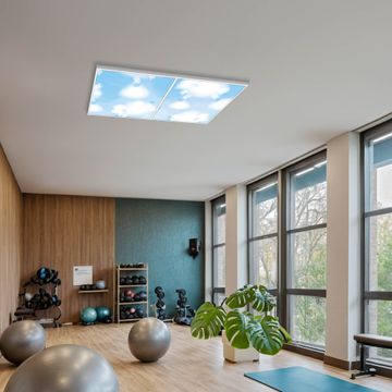 Entdecken Sie unsere vielseitigen Lichtdecken, hier in der Größe 124 x 62cm mit dem Motiv Motiv Schäfchenwolken - Ihre Beleuchtungslösung für jede Umgebung Beleuchten Sie Ihren Raum nicht nur, sondern schaffen Sie Atmosphäre! Die banjado Lichtdecke verwandelt jeden Ort, ob zu Hause, in Praxen, Büros oder Studios in eine Wohlfühloase. Unsere einzelnen Elemente haben eine genormte Einheitsgröße von 62 x 62cm und können somit in jede gängige Rasterdecken verbaut werden. So finden Sie Ihre passende Ausführung: Gern helfen wir Ihnen, die passende Ausführung zu wählen. Hierfür muss die aktuelle Gegebenheit Ihrer Decke oder Wand beachtet werden. Haben Sie bereits eine Rasterdecke (auch Odenwalddecke genannt)? Hier bestellen Sie lediglich das Motiv + Beleuchtungspanel, denn beides wird in die bereits vorhandene Decke eingelegt. Haben Sie eine glatte Decke mit Lichtauslass oder möchten die Lichtdecke an der Wand befestigen? Hier bestellen Sie bitte Motiv + Beleuchtungspanel + Deckenbefestigung, eine Aufbauanleitung liegt immer bei. Die Lichtdecke kann sowohl an der Decke als auch an der Wand montiert werden, perfekt für kreative Lichtakzente oder alternative Beleuchtungslösungen. Haben Sie bereits eine Lichtdecke und möchten nur das Motiv wechseln? Hier bestellen Sie bitte nur Motiv, der Wechsel ist denkbar einfach. Der Aufbau Ihrer banjado Lichtdecke gestaltet sich unkompliziert, dank einer verständlichen Anleitung, die Ihnen Schritt für Schritt durch den Montageprozess hilft. Für die endgültige Installation und den sicheren Anschluss empfehlen wir die Hinzuziehung eines Fachmanns, um die optimale Funktion und Sicherheit Ihrer Beleuchtung zu gewährleisten. Falls Sie einen Fachmann für die Installation benötigen, geben Sie uns gern Bescheid, wir vermitteln Ihnen gern einen geeigneten Ansprechpartner aus Ihrer Nähe. Steuerung: Steigern Sie Ihr Beleuchtungserlebnis mit der nahtlosen Integration in Ihr Smart Home. Durch die Kompatibilität mit der SmartLife App, Alexa und Google Assistant wird Ihr Smartphone zur zentralen Steuerungseinheit. Ihr Handy fungiert hierbei sozusagen als Fernbedienung. Legen Sie individuelle Lichtszenen in der App fest, die bei Aktivierung über den Wand-Ein-/Ausschalter immer wieder abgerufen werden können ohne Handy. Mit der Szenenfunktion in der Smart App können Sie die Beleuchtung personalisieren und steuern, sodass sie auf Ihre individuellen Bedürfnisse, Tagesrhythmus und Stimmung zugeschnitten ist. Beispielsweise können Sie sich in der Morgendämmerung durch ein sanftes Licht wecken lassen oder das Licht der Praxis werktags um 7 Uhr automatisch einschalten lassen. Dieses kann dann natürlich auch zu einer bestimmten Zeit automatisch ausgeschaltet werden. Motivwahl: Diese einzigartige Lichtdecke zeichnet sich durch ihre Fähigkeit aus, die Lichtfarbe je nach gewähltem Motiv anzupassen - ein Baum wirft ein sanftes grünes Licht, während eine Wolkendecke Ihren Raum in ein beruhigendes blaues Leuchten hüllt. Berücksichtigen Sie dies bitte bei Ihrer Motivauswahl. Sie können das Motiv jederzeit ohne großen Aufwand austauschen, ob nach Jahreszeit oder anderem Anlass, unsere Auswahl lässt kaum Wünsche offen. Wir fertigen Ihnen gern eine personalisierte Lichtdecke mit einem eigenen Motiv oder Logo oder Foto, schreiben Sie uns jederzeit an. Technische Daten: Das Motiv ist auf einer 4mm starken Acrylglas Scheibe aufgebracht, das Gesamtgewicht Ihrer Ausführung beträgt 9,9kg. Die Farbtemperatur lässt sich frei einstellen von 3000 bis 6000 Kelvin, damit können Sie stufenlos zwischen warmweiß, neutralweiß und kaltweiß wählen. Die Gesamtleistung bei Ihrer gewählten Ausführung beträgt 80W. Der Lichtstrom beträgt 3600 Lumen, die Nennspannung 230 V. Die Lichtdecke ist mit Schutzart IP20 für den Innenbereich konzipiert und sollte nicht im Nassbereich verwendet werden.