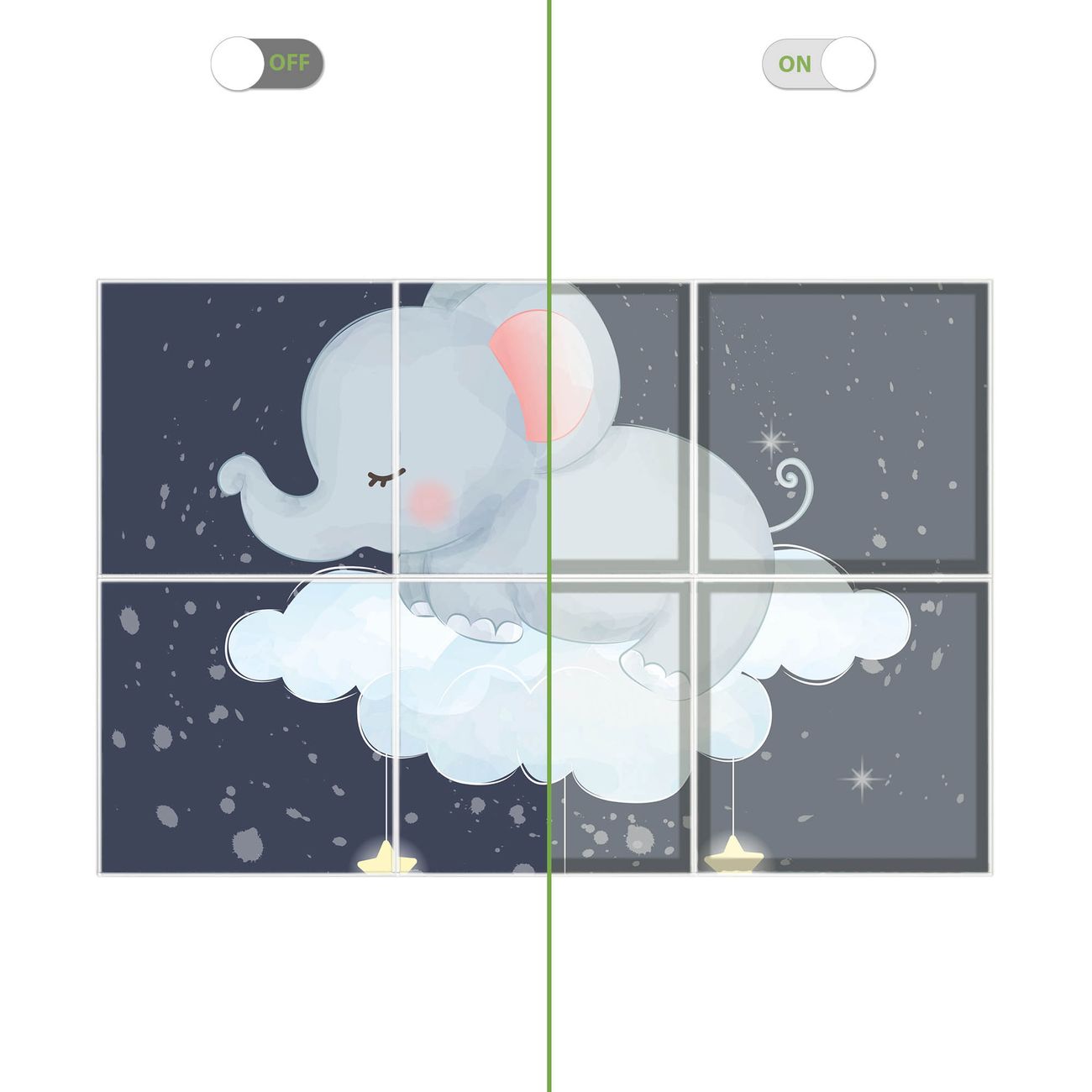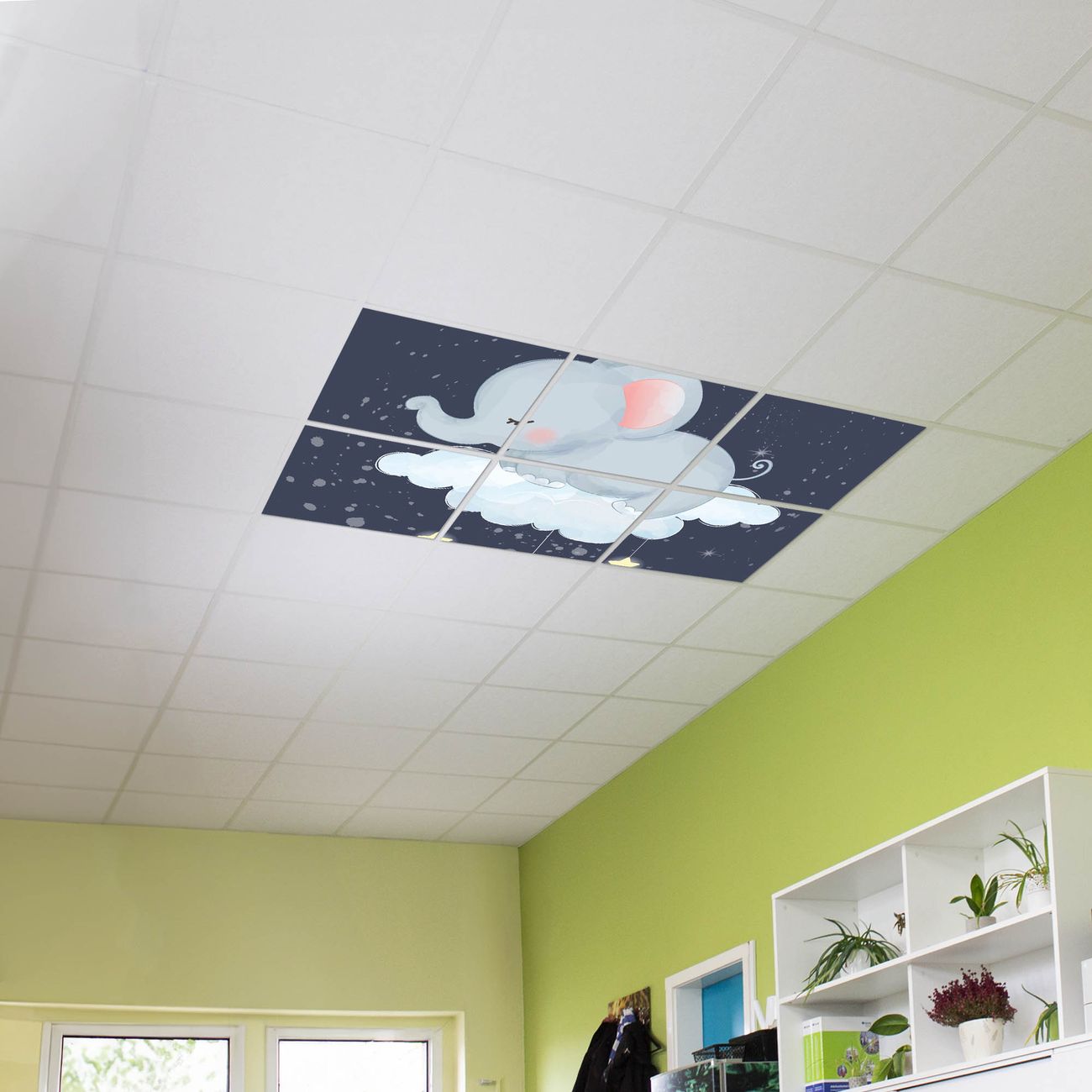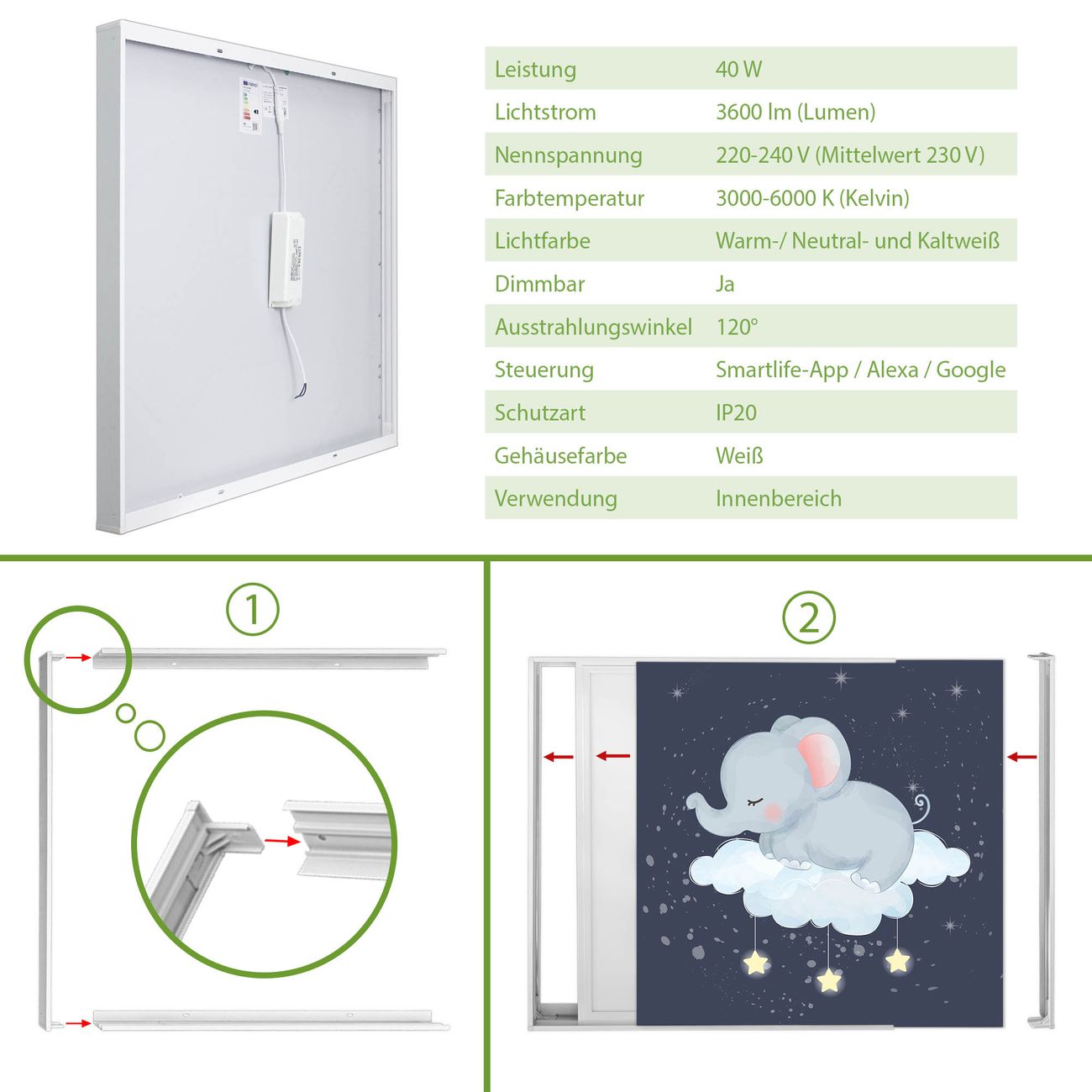 Entdecken Sie unsere vielseitigen Lichtdecken, hier in der Größe 186 x 124cm mit dem Motiv Motiv schlafender Elefant - Ihre Beleuchtungslösung für jede Umgebung Beleuchten Sie Ihren Raum nicht nur, sondern schaffen Sie Atmosphäre! Die banjado Lichtdecke verwandelt jeden Ort, ob zu Hause, in Praxen, Büros oder Studios in eine Wohlfühloase. Unsere einzelnen Elemente haben eine genormte Einheitsgröße von 62 x 62cm und können somit in jede gängige Rasterdecken verbaut werden. So finden Sie Ihre passende Ausführung: Gern helfen wir Ihnen, die passende Ausführung zu wählen. Hierfür muss die aktuelle Gegebenheit Ihrer Decke oder Wand beachtet werden. Haben Sie bereits eine Rasterdecke (auch Odenwalddecke genannt)? Hier bestellen Sie lediglich das Motiv + Beleuchtungspanel, denn beides wird in die bereits vorhandene Decke eingelegt. Haben Sie eine glatte Decke mit Lichtauslass oder möchten die Lichtdecke an der Wand befestigen? Hier bestellen Sie bitte Motiv + Beleuchtungspanel + Deckenbefestigung, eine Aufbauanleitung liegt immer bei. Die Lichtdecke kann sowohl an der Decke als auch an der Wand montiert werden, perfekt für kreative Lichtakzente oder alternative Beleuchtungslösungen. Haben Sie bereits eine Lichtdecke und möchten nur das Motiv wechseln? Hier bestellen Sie bitte nur Motiv, der Wechsel ist denkbar einfach. Der Aufbau Ihrer banjado Lichtdecke gestaltet sich unkompliziert, dank einer verständlichen Anleitung, die Ihnen Schritt für Schritt durch den Montageprozess hilft. Für die endgültige Installation und den sicheren Anschluss empfehlen wir die Hinzuziehung eines Fachmanns, um die optimale Funktion und Sicherheit Ihrer Beleuchtung zu gewährleisten. Falls Sie einen Fachmann für die Installation benötigen, geben Sie uns gern Bescheid, wir vermitteln Ihnen gern einen geeigneten Ansprechpartner aus Ihrer Nähe. Steuerung: Steigern Sie Ihr Beleuchtungserlebnis mit der nahtlosen Integration in Ihr Smart Home. Durch die Kompatibilität mit der SmartLife App, Alexa und Google Assistant wird Ihr Smartphone zur zentralen Steuerungseinheit. Ihr Handy fungiert hierbei sozusagen als Fernbedienung. Legen Sie individuelle Lichtszenen in der App fest, die bei Aktivierung über den Wand-Ein-/Ausschalter immer wieder abgerufen werden können ohne Handy. Mit der Szenenfunktion in der Smart App können Sie die Beleuchtung personalisieren und steuern, sodass sie auf Ihre individuellen Bedürfnisse, Tagesrhythmus und Stimmung zugeschnitten ist. Beispielsweise können Sie sich in der Morgendämmerung durch ein sanftes Licht wecken lassen oder das Licht der Praxis werktags um 7 Uhr automatisch einschalten lassen. Dieses kann dann natürlich auch zu einer bestimmten Zeit automatisch ausgeschaltet werden. Motivwahl: Diese einzigartige Lichtdecke zeichnet sich durch ihre Fähigkeit aus, die Lichtfarbe je nach gewähltem Motiv anzupassen - ein Baum wirft ein sanftes grünes Licht, während eine Wolkendecke Ihren Raum in ein beruhigendes blaues Leuchten hüllt. Berücksichtigen Sie dies bitte bei Ihrer Motivauswahl. Sie können das Motiv jederzeit ohne großen Aufwand austauschen, ob nach Jahreszeit oder anderem Anlass, unsere Auswahl lässt kaum Wünsche offen. Wir fertigen Ihnen gern eine personalisierte Lichtdecke mit einem eigenen Motiv oder Logo oder Foto, schreiben Sie uns jederzeit an. Technische Daten: Das Motiv ist auf einer 4mm starken Acrylglas Scheibe aufgebracht, das Gesamtgewicht Ihrer Ausführung beträgt 26,6kg. Die Farbtemperatur lässt sich frei einstellen von 3000 bis 6000 Kelvin, damit können Sie stufenlos zwischen warmweiß, neutralweiß und kaltweiß wählen. Die Gesamtleistung bei Ihrer gewählten Ausführung beträgt 240W. Der Lichtstrom beträgt 3600 Lumen, die Nennspannung 230 V. Die Lichtdecke ist mit Schutzart IP20 für den Innenbereich konzipiert und sollte nicht im Nassbereich verwendet werden.