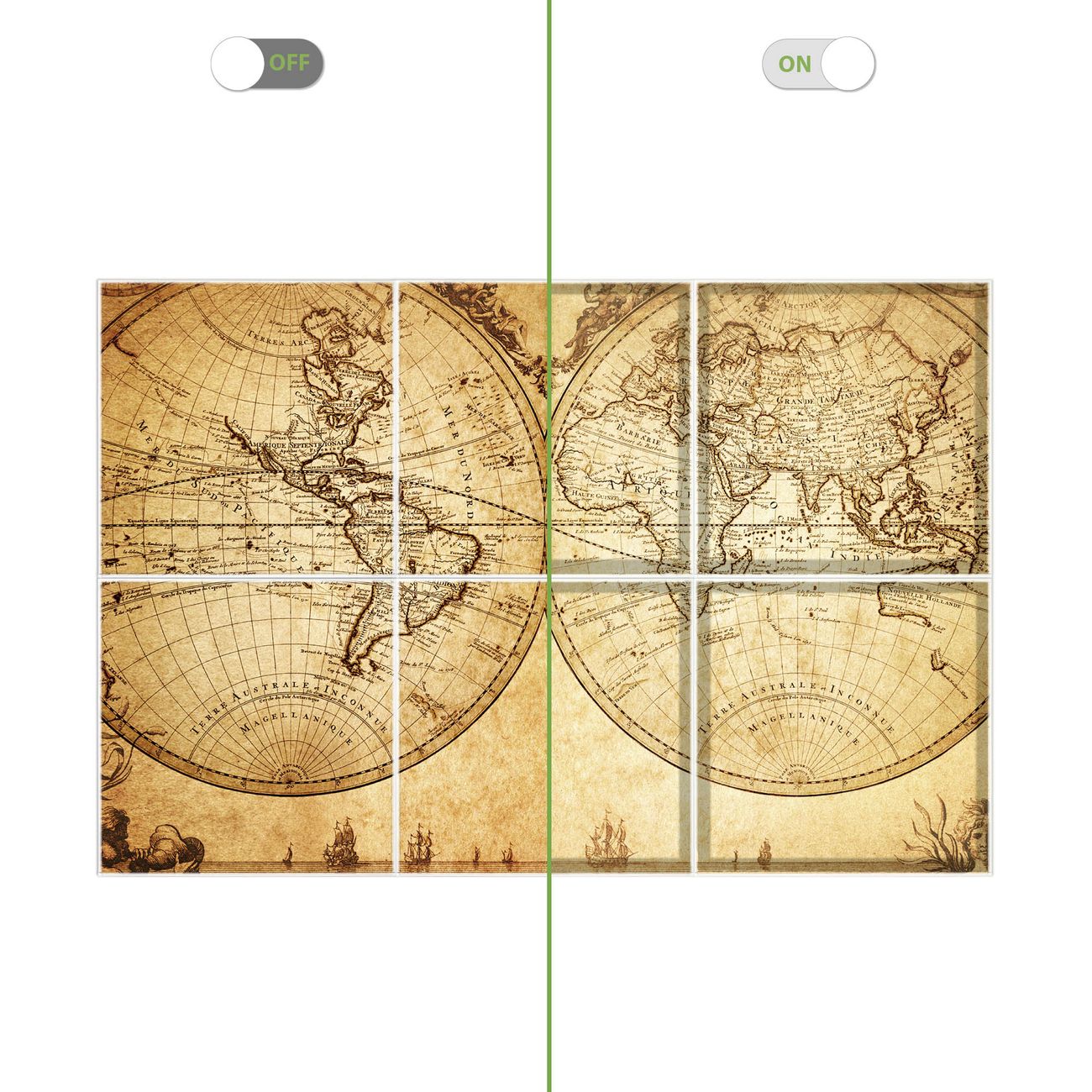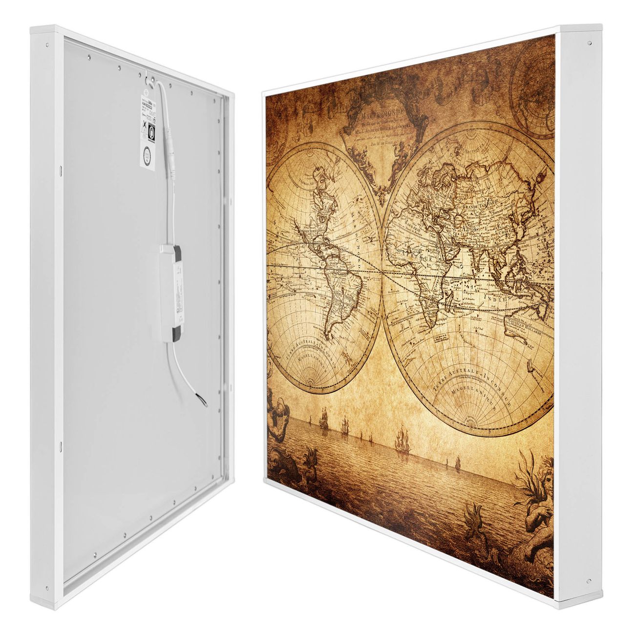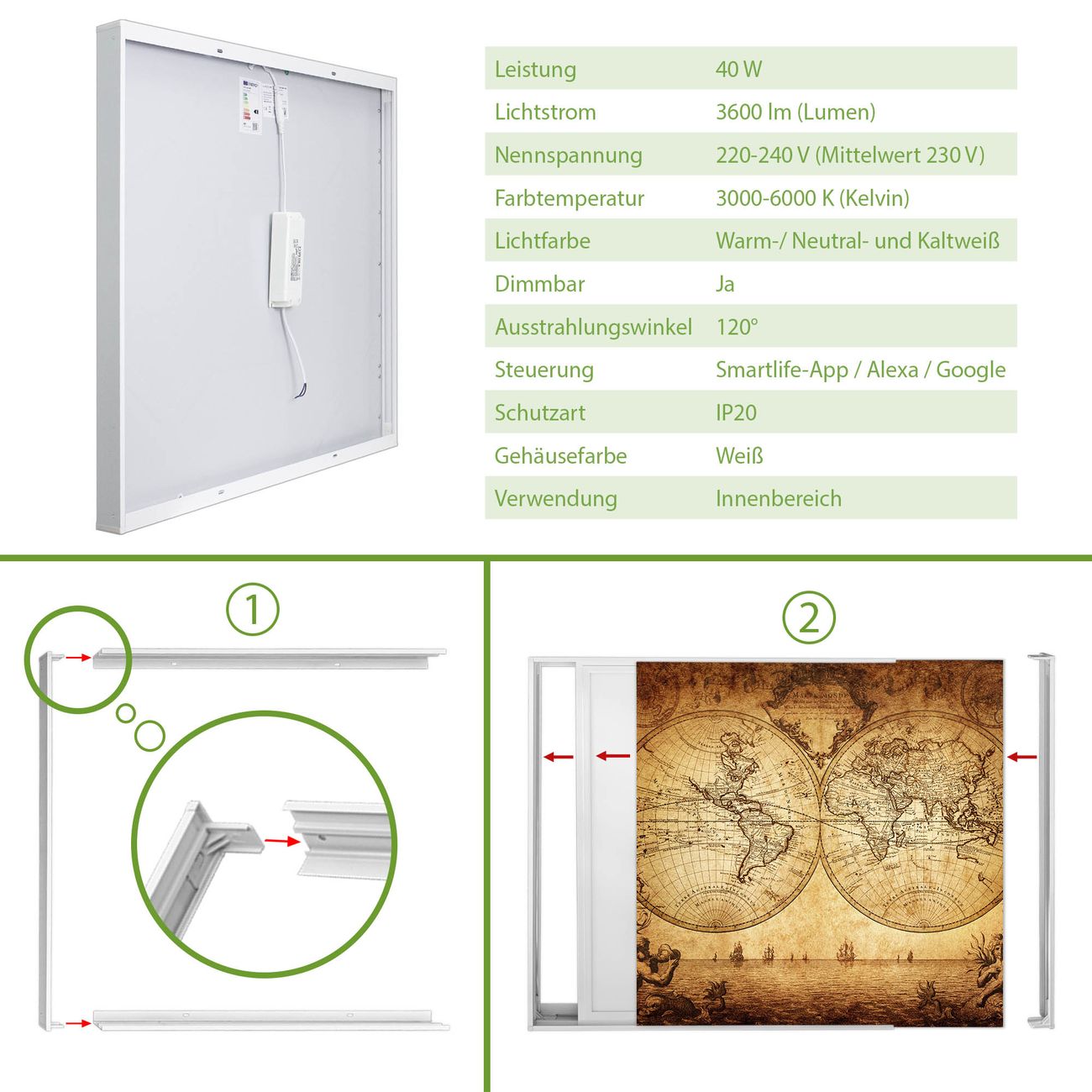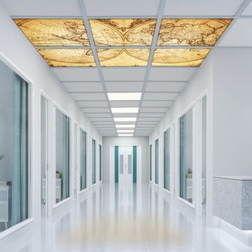Entdecken Sie unsere vielseitigen Lichtdecken, hier in der Größe 186 x 124cm mit dem Motiv Motiv Sieben Weltmeere - Ihre Beleuchtungslösung für jede Umgebung Beleuchten Sie Ihren Raum nicht nur, sondern schaffen Sie Atmosphäre! Die banjado Lichtdecke verwandelt jeden Ort, ob zu Hause, in Praxen, Büros oder Studios in eine Wohlfühloase. Unsere einzelnen Elemente haben eine genormte Einheitsgröße von 62 x 62cm und können somit in jede gängige Rasterdecken verbaut werden. So finden Sie Ihre passende Ausführung: Gern helfen wir Ihnen, die passende Ausführung zu wählen. Hierfür muss die aktuelle Gegebenheit Ihrer Decke oder Wand beachtet werden. Haben Sie bereits eine Rasterdecke (auch Odenwalddecke genannt)? Hier bestellen Sie lediglich das Motiv + Beleuchtungspanel, denn beides wird in die bereits vorhandene Decke eingelegt. Haben Sie eine glatte Decke mit Lichtauslass oder möchten die Lichtdecke an der Wand befestigen? Hier bestellen Sie bitte Motiv + Beleuchtungspanel + Deckenbefestigung, eine Aufbauanleitung liegt immer bei. Die Lichtdecke kann sowohl an der Decke als auch an der Wand montiert werden, perfekt für kreative Lichtakzente oder alternative Beleuchtungslösungen. Haben Sie bereits eine Lichtdecke und möchten nur das Motiv wechseln? Hier bestellen Sie bitte nur Motiv, der Wechsel ist denkbar einfach. Der Aufbau Ihrer banjado Lichtdecke gestaltet sich unkompliziert, dank einer verständlichen Anleitung, die Ihnen Schritt für Schritt durch den Montageprozess hilft. Für die endgültige Installation und den sicheren Anschluss empfehlen wir die Hinzuziehung eines Fachmanns, um die optimale Funktion und Sicherheit Ihrer Beleuchtung zu gewährleisten. Falls Sie einen Fachmann für die Installation benötigen, geben Sie uns gern Bescheid, wir vermitteln Ihnen gern einen geeigneten Ansprechpartner aus Ihrer Nähe. Steuerung: Steigern Sie Ihr Beleuchtungserlebnis mit der nahtlosen Integration in Ihr Smart Home. Durch die Kompatibilität mit der SmartLife App, Alexa und Google Assistant wird Ihr Smartphone zur zentralen Steuerungseinheit. Ihr Handy fungiert hierbei sozusagen als Fernbedienung. Legen Sie individuelle Lichtszenen in der App fest, die bei Aktivierung über den Wand-Ein-/Ausschalter immer wieder abgerufen werden können ohne Handy. Mit der Szenenfunktion in der Smart App können Sie die Beleuchtung personalisieren und steuern, sodass sie auf Ihre individuellen Bedürfnisse, Tagesrhythmus und Stimmung zugeschnitten ist. Beispielsweise können Sie sich in der Morgendämmerung durch ein sanftes Licht wecken lassen oder das Licht der Praxis werktags um 7 Uhr automatisch einschalten lassen. Dieses kann dann natürlich auch zu einer bestimmten Zeit automatisch ausgeschaltet werden. Motivwahl: Diese einzigartige Lichtdecke zeichnet sich durch ihre Fähigkeit aus, die Lichtfarbe je nach gewähltem Motiv anzupassen - ein Baum wirft ein sanftes grünes Licht, während eine Wolkendecke Ihren Raum in ein beruhigendes blaues Leuchten hüllt. Berücksichtigen Sie dies bitte bei Ihrer Motivauswahl. Sie können das Motiv jederzeit ohne großen Aufwand austauschen, ob nach Jahreszeit oder anderem Anlass, unsere Auswahl lässt kaum Wünsche offen. Wir fertigen Ihnen gern eine personalisierte Lichtdecke mit einem eigenen Motiv oder Logo oder Foto, schreiben Sie uns jederzeit an. Technische Daten: Das Motiv ist auf einer 4mm starken Acrylglas Scheibe aufgebracht, das Gesamtgewicht Ihrer Ausführung beträgt 13,6kg. Die Farbtemperatur lässt sich frei einstellen von 3000 bis 6000 Kelvin, damit können Sie stufenlos zwischen warmweiß, neutralweiß und kaltweiß wählen. Die Gesamtleistung bei Ihrer gewählten Ausführung beträgt 240W. Der Lichtstrom beträgt 3600 Lumen, die Nennspannung 230 V. Die Lichtdecke ist mit Schutzart IP20 für den Innenbereich konzipiert und sollte nicht im Nassbereich verwendet werden.
