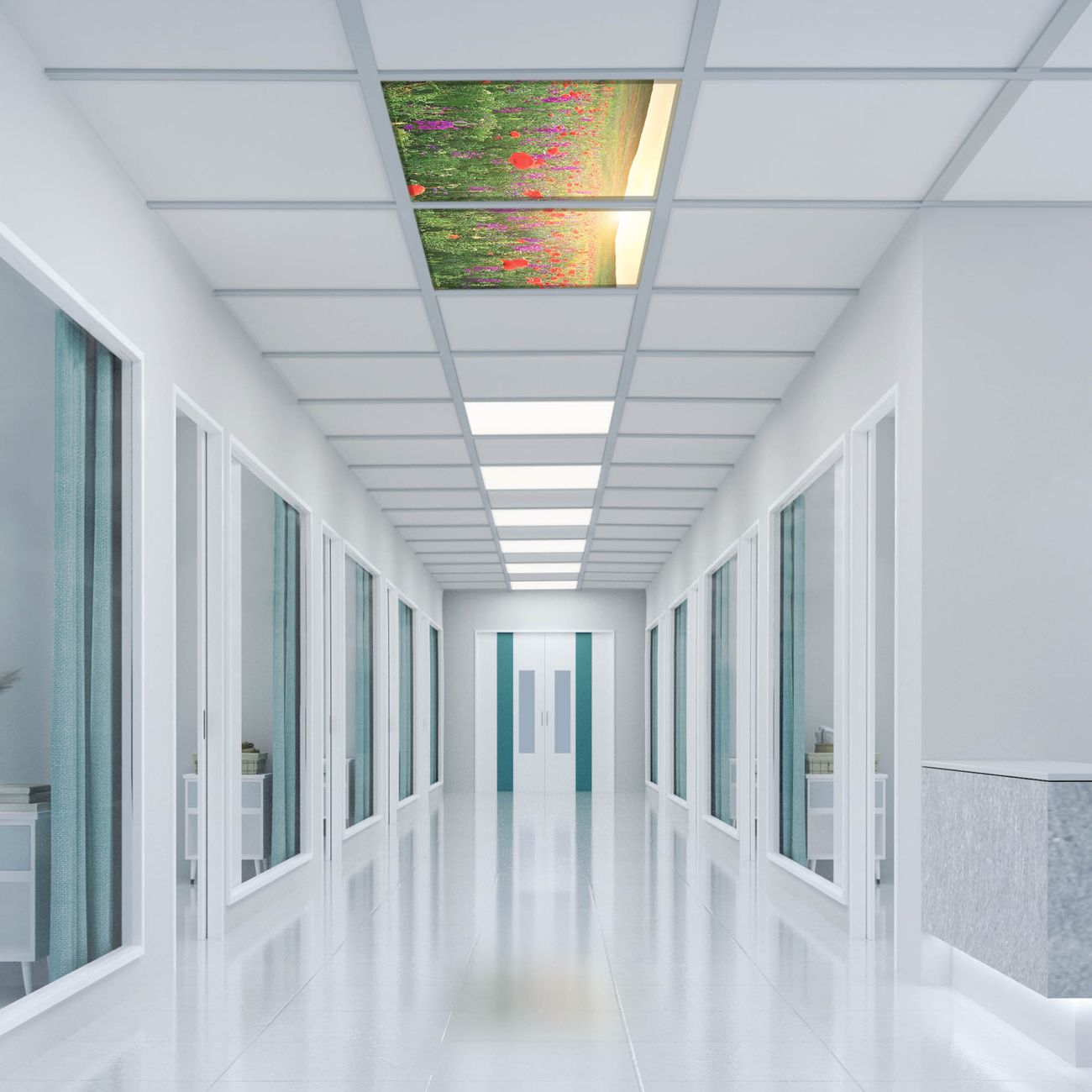 Entdecken Sie unsere vielseitigen Lichtdecken, hier in der Größe 124 x 62cm mit dem Motiv Motiv Sommerfeld - Ihre Beleuchtungslösung für jede Umgebung Beleuchten Sie Ihren Raum nicht nur, sondern schaffen Sie Atmosphäre! Die banjado Lichtdecke verwandelt jeden Ort, ob zu Hause, in Praxen, Büros oder Studios in eine Wohlfühloase. Unsere einzelnen Elemente haben eine genormte Einheitsgröße von 62 x 62cm und können somit in jede gängige Rasterdecken verbaut werden. So finden Sie Ihre passende Ausführung: Gern helfen wir Ihnen, die passende Ausführung zu wählen. Hierfür muss die aktuelle Gegebenheit Ihrer Decke oder Wand beachtet werden. Haben Sie bereits eine Rasterdecke (auch Odenwalddecke genannt)? Hier bestellen Sie lediglich das Motiv + Beleuchtungspanel, denn beides wird in die bereits vorhandene Decke eingelegt. Haben Sie eine glatte Decke mit Lichtauslass oder möchten die Lichtdecke an der Wand befestigen? Hier bestellen Sie bitte Motiv + Beleuchtungspanel + Deckenbefestigung, eine Aufbauanleitung liegt immer bei. Die Lichtdecke kann sowohl an der Decke als auch an der Wand montiert werden, perfekt für kreative Lichtakzente oder alternative Beleuchtungslösungen. Haben Sie bereits eine Lichtdecke und möchten nur das Motiv wechseln? Hier bestellen Sie bitte nur Motiv, der Wechsel ist denkbar einfach. Der Aufbau Ihrer banjado Lichtdecke gestaltet sich unkompliziert, dank einer verständlichen Anleitung, die Ihnen Schritt für Schritt durch den Montageprozess hilft. Für die endgültige Installation und den sicheren Anschluss empfehlen wir die Hinzuziehung eines Fachmanns, um die optimale Funktion und Sicherheit Ihrer Beleuchtung zu gewährleisten. Falls Sie einen Fachmann für die Installation benötigen, geben Sie uns gern Bescheid, wir vermitteln Ihnen gern einen geeigneten Ansprechpartner aus Ihrer Nähe. Steuerung: Steigern Sie Ihr Beleuchtungserlebnis mit der nahtlosen Integration in Ihr Smart Home. Durch die Kompatibilität mit der SmartLife App, Alexa und Google Assistant wird Ihr Smartphone zur zentralen Steuerungseinheit. Ihr Handy fungiert hierbei sozusagen als Fernbedienung. Legen Sie individuelle Lichtszenen in der App fest, die bei Aktivierung über den Wand-Ein-/Ausschalter immer wieder abgerufen werden können ohne Handy. Mit der Szenenfunktion in der Smart App können Sie die Beleuchtung personalisieren und steuern, sodass sie auf Ihre individuellen Bedürfnisse, Tagesrhythmus und Stimmung zugeschnitten ist. Beispielsweise können Sie sich in der Morgendämmerung durch ein sanftes Licht wecken lassen oder das Licht der Praxis werktags um 7 Uhr automatisch einschalten lassen. Dieses kann dann natürlich auch zu einer bestimmten Zeit automatisch ausgeschaltet werden. Motivwahl: Diese einzigartige Lichtdecke zeichnet sich durch ihre Fähigkeit aus, die Lichtfarbe je nach gewähltem Motiv anzupassen - ein Baum wirft ein sanftes grünes Licht, während eine Wolkendecke Ihren Raum in ein beruhigendes blaues Leuchten hüllt. Berücksichtigen Sie dies bitte bei Ihrer Motivauswahl. Sie können das Motiv jederzeit ohne großen Aufwand austauschen, ob nach Jahreszeit oder anderem Anlass, unsere Auswahl lässt kaum Wünsche offen. Wir fertigen Ihnen gern eine personalisierte Lichtdecke mit einem eigenen Motiv oder Logo oder Foto, schreiben Sie uns jederzeit an. Technische Daten: Das Motiv ist auf einer 4mm starken Acrylglas Scheibe aufgebracht, das Gesamtgewicht Ihrer Ausführung beträgt 4,5kg. Die Farbtemperatur lässt sich frei einstellen von 3000 bis 6000 Kelvin, damit können Sie stufenlos zwischen warmweiß, neutralweiß und kaltweiß wählen. Die Gesamtleistung bei Ihrer gewählten Ausführung beträgt 80W. Der Lichtstrom beträgt 3600 Lumen, die Nennspannung 230 V. Die Lichtdecke ist mit Schutzart IP20 für den Innenbereich konzipiert und sollte nicht im Nassbereich verwendet werden.