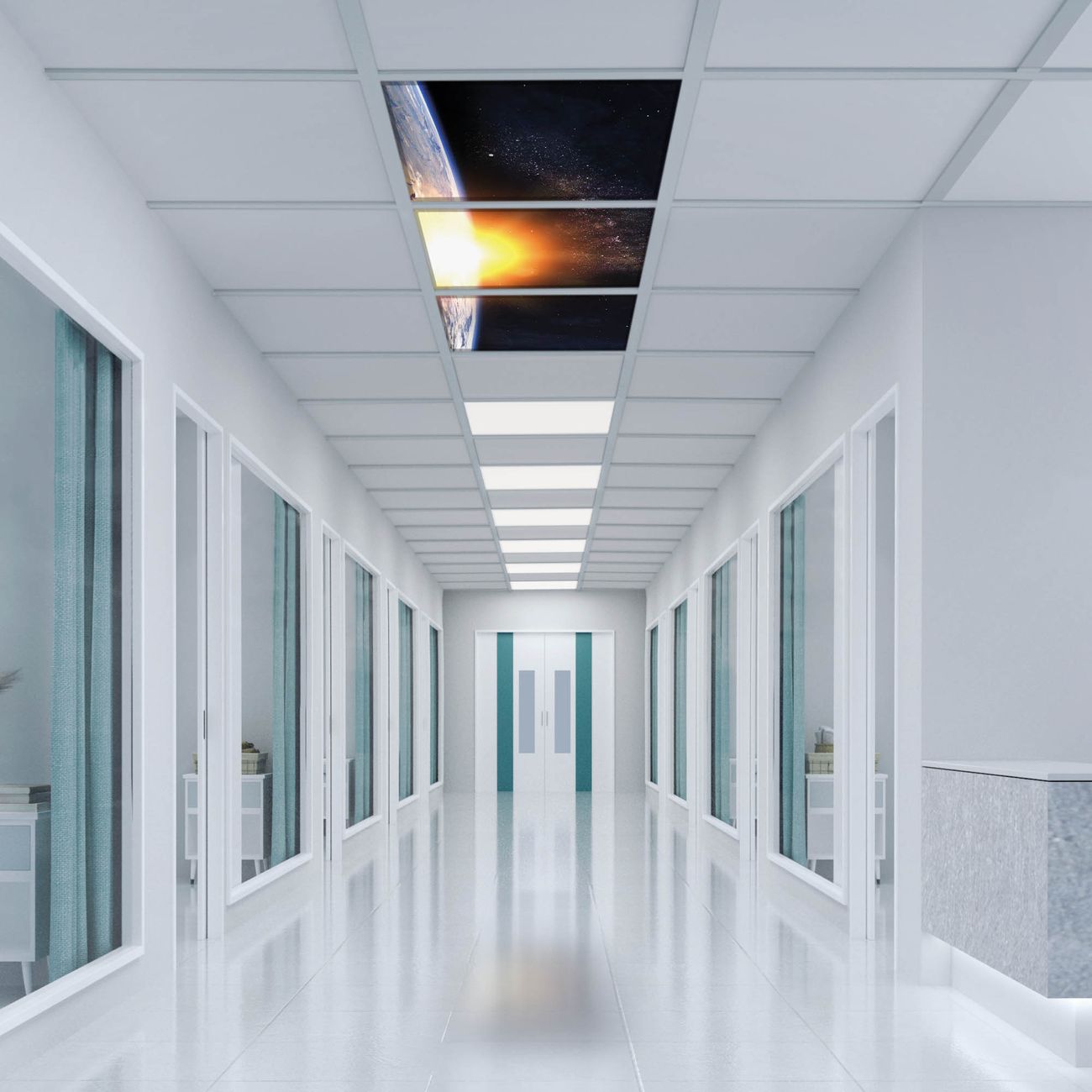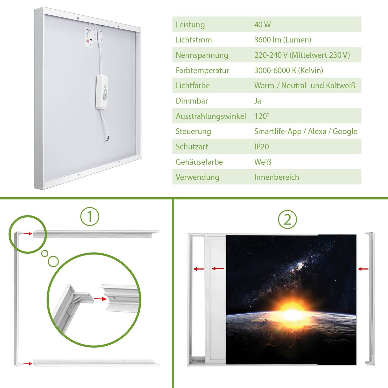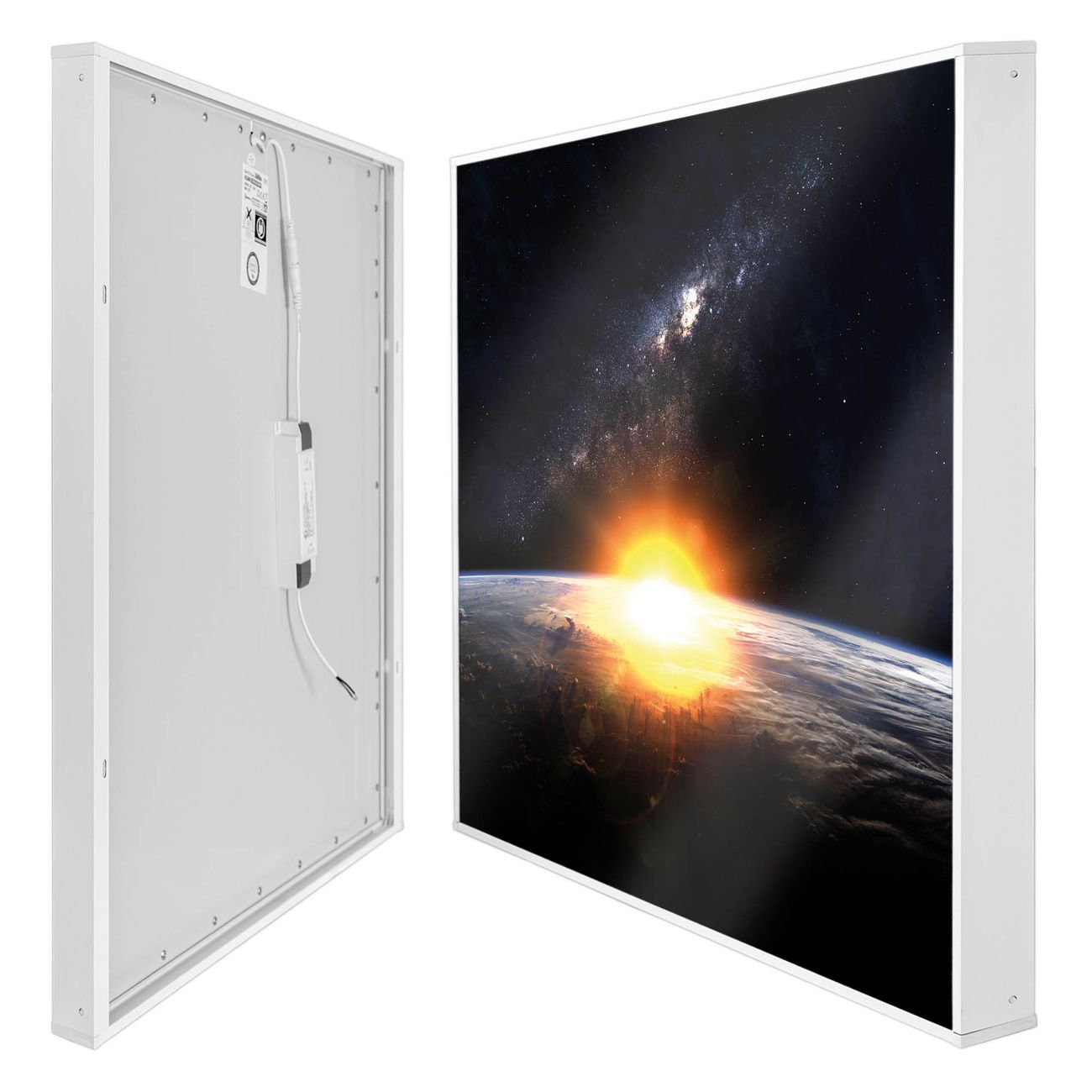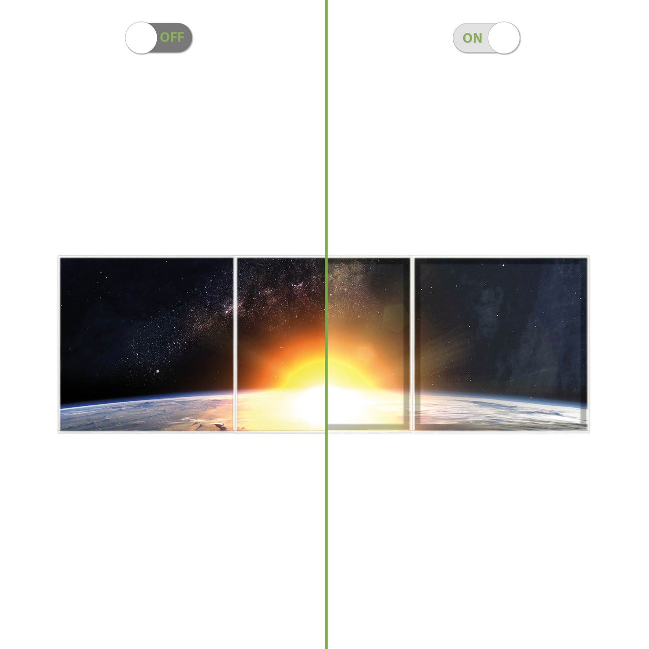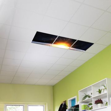 Entdecken Sie unsere vielseitigen Lichtdecken, hier in der Größe 186 x 62cm mit dem Motiv Motiv Sonne im Weltall - Ihre Beleuchtungslösung für jede Umgebung Beleuchten Sie Ihren Raum nicht nur, sondern schaffen Sie Atmosphäre! Die banjado Lichtdecke verwandelt jeden Ort, ob zu Hause, in Praxen, Büros oder Studios in eine Wohlfühloase. Unsere einzelnen Elemente haben eine genormte Einheitsgröße von 62 x 62cm und können somit in jede gängige Rasterdecken verbaut werden. So finden Sie Ihre passende Ausführung: Gern helfen wir Ihnen, die passende Ausführung zu wählen. Hierfür muss die aktuelle Gegebenheit Ihrer Decke oder Wand beachtet werden. Haben Sie bereits eine Rasterdecke (auch Odenwalddecke genannt)? Hier bestellen Sie lediglich das Motiv + Beleuchtungspanel, denn beides wird in die bereits vorhandene Decke eingelegt. Haben Sie eine glatte Decke mit Lichtauslass oder möchten die Lichtdecke an der Wand befestigen? Hier bestellen Sie bitte Motiv + Beleuchtungspanel + Deckenbefestigung, eine Aufbauanleitung liegt immer bei. Die Lichtdecke kann sowohl an der Decke als auch an der Wand montiert werden, perfekt für kreative Lichtakzente oder alternative Beleuchtungslösungen. Haben Sie bereits eine Lichtdecke und möchten nur das Motiv wechseln? Hier bestellen Sie bitte nur Motiv, der Wechsel ist denkbar einfach. Der Aufbau Ihrer banjado Lichtdecke gestaltet sich unkompliziert, dank einer verständlichen Anleitung, die Ihnen Schritt für Schritt durch den Montageprozess hilft. Für die endgültige Installation und den sicheren Anschluss empfehlen wir die Hinzuziehung eines Fachmanns, um die optimale Funktion und Sicherheit Ihrer Beleuchtung zu gewährleisten. Falls Sie einen Fachmann für die Installation benötigen, geben Sie uns gern Bescheid, wir vermitteln Ihnen gern einen geeigneten Ansprechpartner aus Ihrer Nähe. Steuerung: Steigern Sie Ihr Beleuchtungserlebnis mit der nahtlosen Integration in Ihr Smart Home. Durch die Kompatibilität mit der SmartLife App, Alexa und Google Assistant wird Ihr Smartphone zur zentralen Steuerungseinheit. Ihr Handy fungiert hierbei sozusagen als Fernbedienung. Legen Sie individuelle Lichtszenen in der App fest, die bei Aktivierung über den Wand-Ein-/Ausschalter immer wieder abgerufen werden können ohne Handy. Mit der Szenenfunktion in der Smart App können Sie die Beleuchtung personalisieren und steuern, sodass sie auf Ihre individuellen Bedürfnisse, Tagesrhythmus und Stimmung zugeschnitten ist. Beispielsweise können Sie sich in der Morgendämmerung durch ein sanftes Licht wecken lassen oder das Licht der Praxis werktags um 7 Uhr automatisch einschalten lassen. Dieses kann dann natürlich auch zu einer bestimmten Zeit automatisch ausgeschaltet werden. Motivwahl: Diese einzigartige Lichtdecke zeichnet sich durch ihre Fähigkeit aus, die Lichtfarbe je nach gewähltem Motiv anzupassen - ein Baum wirft ein sanftes grünes Licht, während eine Wolkendecke Ihren Raum in ein beruhigendes blaues Leuchten hüllt. Berücksichtigen Sie dies bitte bei Ihrer Motivauswahl. Sie können das Motiv jederzeit ohne großen Aufwand austauschen, ob nach Jahreszeit oder anderem Anlass, unsere Auswahl lässt kaum Wünsche offen. Wir fertigen Ihnen gern eine personalisierte Lichtdecke mit einem eigenen Motiv oder Logo oder Foto, schreiben Sie uns jederzeit an. Technische Daten: Das Motiv ist auf einer 4mm starken Acrylglas Scheibe aufgebracht, das Gesamtgewicht Ihrer Ausführung beträgt 13,3kg. Die Farbtemperatur lässt sich frei einstellen von 3000 bis 6000 Kelvin, damit können Sie stufenlos zwischen warmweiß, neutralweiß und kaltweiß wählen. Die Gesamtleistung bei Ihrer gewählten Ausführung beträgt 120W. Der Lichtstrom beträgt 3600 Lumen, die Nennspannung 230 V. Die Lichtdecke ist mit Schutzart IP20 für den Innenbereich konzipiert und sollte nicht im Nassbereich verwendet werden.