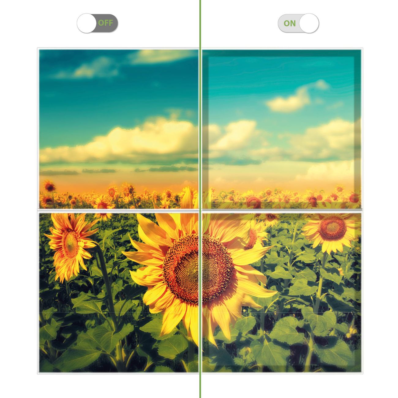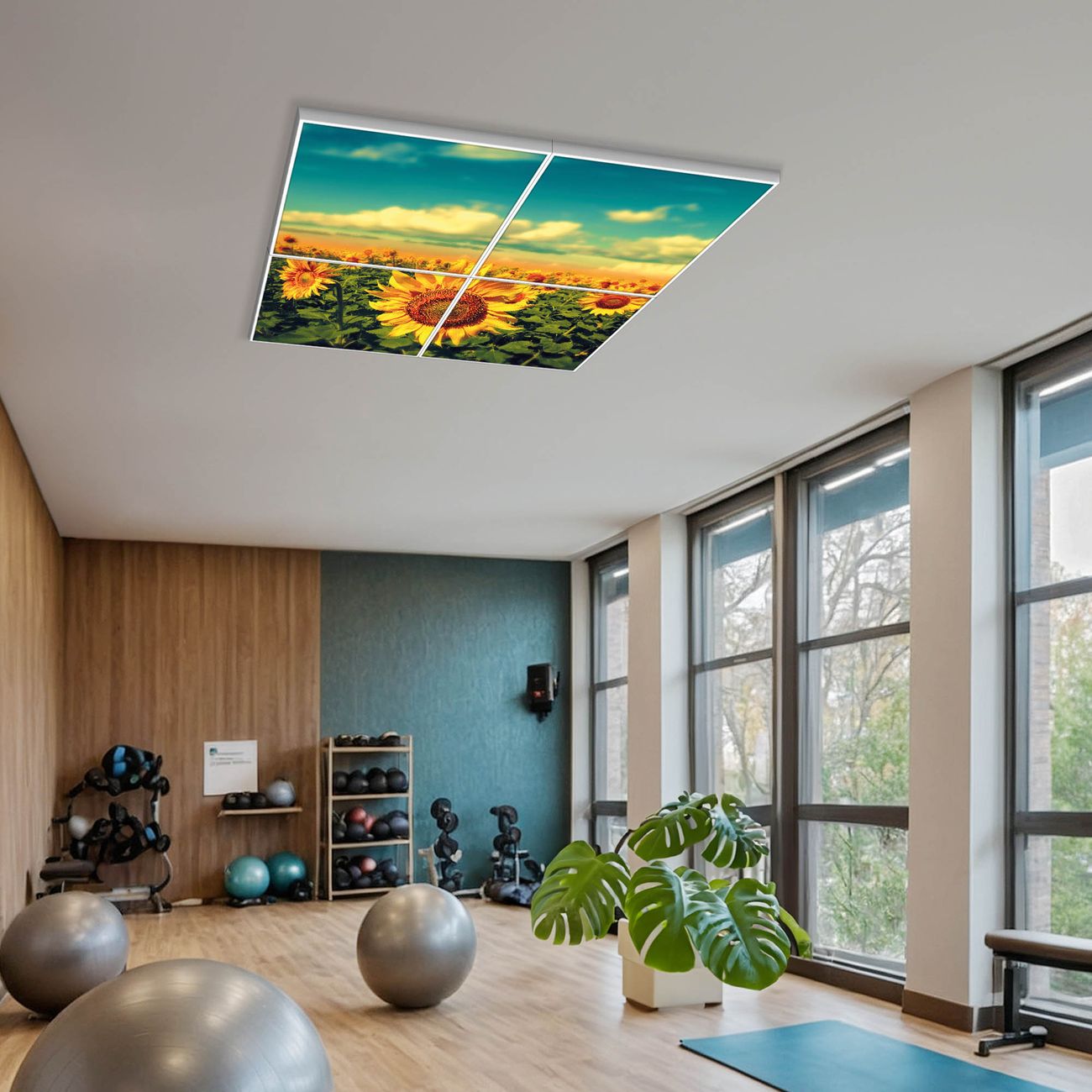 Entdecken Sie unsere vielseitigen Lichtdecken, hier in der Größe 124 x 124cm mit dem Motiv Motiv Sonnenblumen - Ihre Beleuchtungslösung für jede Umgebung Beleuchten Sie Ihren Raum nicht nur, sondern schaffen Sie Atmosphäre! Die banjado Lichtdecke verwandelt jeden Ort, ob zu Hause, in Praxen, Büros oder Studios in eine Wohlfühloase. Unsere einzelnen Elemente haben eine genormte Einheitsgröße von 62 x 62cm und können somit in jede gängige Rasterdecken verbaut werden. So finden Sie Ihre passende Ausführung: Gern helfen wir Ihnen, die passende Ausführung zu wählen. Hierfür muss die aktuelle Gegebenheit Ihrer Decke oder Wand beachtet werden. Haben Sie bereits eine Rasterdecke (auch Odenwalddecke genannt)? Hier bestellen Sie lediglich das Motiv + Beleuchtungspanel, denn beides wird in die bereits vorhandene Decke eingelegt. Haben Sie eine glatte Decke mit Lichtauslass oder möchten die Lichtdecke an der Wand befestigen? Hier bestellen Sie bitte Motiv + Beleuchtungspanel + Deckenbefestigung, eine Aufbauanleitung liegt immer bei. Die Lichtdecke kann sowohl an der Decke als auch an der Wand montiert werden, perfekt für kreative Lichtakzente oder alternative Beleuchtungslösungen. Haben Sie bereits eine Lichtdecke und möchten nur das Motiv wechseln? Hier bestellen Sie bitte nur Motiv, der Wechsel ist denkbar einfach. Der Aufbau Ihrer banjado Lichtdecke gestaltet sich unkompliziert, dank einer verständlichen Anleitung, die Ihnen Schritt für Schritt durch den Montageprozess hilft. Für die endgültige Installation und den sicheren Anschluss empfehlen wir die Hinzuziehung eines Fachmanns, um die optimale Funktion und Sicherheit Ihrer Beleuchtung zu gewährleisten. Falls Sie einen Fachmann für die Installation benötigen, geben Sie uns gern Bescheid, wir vermitteln Ihnen gern einen geeigneten Ansprechpartner aus Ihrer Nähe. Steuerung: Steigern Sie Ihr Beleuchtungserlebnis mit der nahtlosen Integration in Ihr Smart Home. Durch die Kompatibilität mit der SmartLife App, Alexa und Google Assistant wird Ihr Smartphone zur zentralen Steuerungseinheit. Ihr Handy fungiert hierbei sozusagen als Fernbedienung. Legen Sie individuelle Lichtszenen in der App fest, die bei Aktivierung über den Wand-Ein-/Ausschalter immer wieder abgerufen werden können ohne Handy. Mit der Szenenfunktion in der Smart App können Sie die Beleuchtung personalisieren und steuern, sodass sie auf Ihre individuellen Bedürfnisse, Tagesrhythmus und Stimmung zugeschnitten ist. Beispielsweise können Sie sich in der Morgendämmerung durch ein sanftes Licht wecken lassen oder das Licht der Praxis werktags um 7 Uhr automatisch einschalten lassen. Dieses kann dann natürlich auch zu einer bestimmten Zeit automatisch ausgeschaltet werden. Motivwahl: Diese einzigartige Lichtdecke zeichnet sich durch ihre Fähigkeit aus, die Lichtfarbe je nach gewähltem Motiv anzupassen - ein Baum wirft ein sanftes grünes Licht, während eine Wolkendecke Ihren Raum in ein beruhigendes blaues Leuchten hüllt. Berücksichtigen Sie dies bitte bei Ihrer Motivauswahl. Sie können das Motiv jederzeit ohne großen Aufwand austauschen, ob nach Jahreszeit oder anderem Anlass, unsere Auswahl lässt kaum Wünsche offen. Wir fertigen Ihnen gern eine personalisierte Lichtdecke mit einem eigenen Motiv oder Logo oder Foto, schreiben Sie uns jederzeit an. Technische Daten: Das Motiv ist auf einer 4mm starken Acrylglas Scheibe aufgebracht, das Gesamtgewicht Ihrer Ausführung beträgt 19,7kg. Die Farbtemperatur lässt sich frei einstellen von 3000 bis 6000 Kelvin, damit können Sie stufenlos zwischen warmweiß, neutralweiß und kaltweiß wählen. Die Gesamtleistung bei Ihrer gewählten Ausführung beträgt 160W. Der Lichtstrom beträgt 3600 Lumen, die Nennspannung 230 V. Die Lichtdecke ist mit Schutzart IP20 für den Innenbereich konzipiert und sollte nicht im Nassbereich verwendet werden.