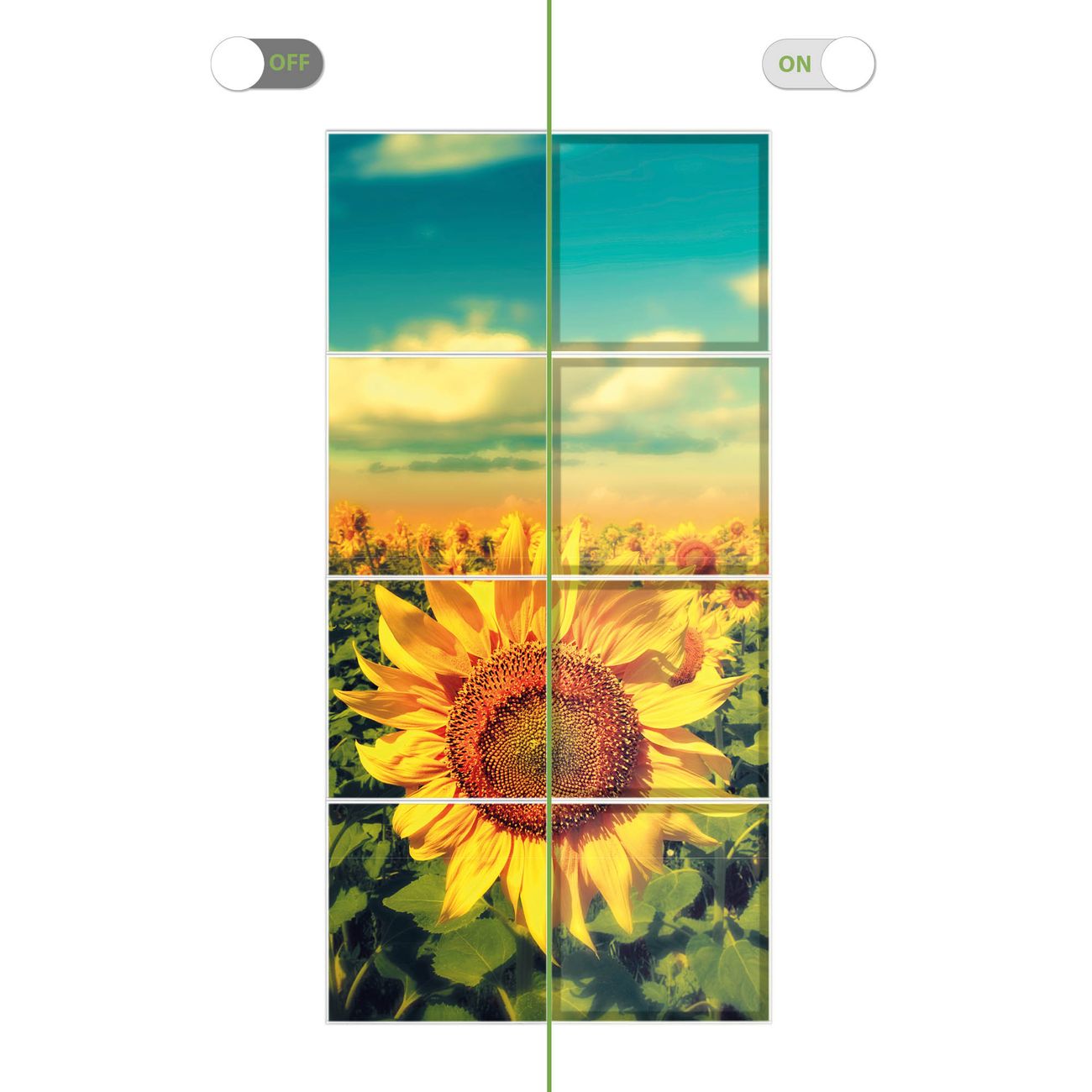 Entdecken Sie unsere vielseitigen Lichtdecken, hier in der Größe 124 x 248cm mit dem Motiv Motiv Sonnenblumen - Ihre Beleuchtungslösung für jede Umgebung Beleuchten Sie Ihren Raum nicht nur, sondern schaffen Sie Atmosphäre! Die banjado Lichtdecke verwandelt jeden Ort, ob zu Hause, in Praxen, Büros oder Studios in eine Wohlfühloase. Unsere einzelnen Elemente haben eine genormte Einheitsgröße von 62 x 62cm und können somit in jede gängige Rasterdecken verbaut werden. So finden Sie Ihre passende Ausführung: Gern helfen wir Ihnen, die passende Ausführung zu wählen. Hierfür muss die aktuelle Gegebenheit Ihrer Decke oder Wand beachtet werden. Haben Sie bereits eine Rasterdecke (auch Odenwalddecke genannt)? Hier bestellen Sie lediglich das Motiv + Beleuchtungspanel, denn beides wird in die bereits vorhandene Decke eingelegt. Haben Sie eine glatte Decke mit Lichtauslass oder möchten die Lichtdecke an der Wand befestigen? Hier bestellen Sie bitte Motiv + Beleuchtungspanel + Deckenbefestigung, eine Aufbauanleitung liegt immer bei. Die Lichtdecke kann sowohl an der Decke als auch an der Wand montiert werden, perfekt für kreative Lichtakzente oder alternative Beleuchtungslösungen. Haben Sie bereits eine Lichtdecke und möchten nur das Motiv wechseln? Hier bestellen Sie bitte nur Motiv, der Wechsel ist denkbar einfach. Der Aufbau Ihrer banjado Lichtdecke gestaltet sich unkompliziert, dank einer verständlichen Anleitung, die Ihnen Schritt für Schritt durch den Montageprozess hilft. Für die endgültige Installation und den sicheren Anschluss empfehlen wir die Hinzuziehung eines Fachmanns, um die optimale Funktion und Sicherheit Ihrer Beleuchtung zu gewährleisten. Falls Sie einen Fachmann für die Installation benötigen, geben Sie uns gern Bescheid, wir vermitteln Ihnen gern einen geeigneten Ansprechpartner aus Ihrer Nähe. Steuerung: Steigern Sie Ihr Beleuchtungserlebnis mit der nahtlosen Integration in Ihr Smart Home. Durch die Kompatibilität mit der SmartLife App, Alexa und Google Assistant wird Ihr Smartphone zur zentralen Steuerungseinheit. Ihr Handy fungiert hierbei sozusagen als Fernbedienung. Legen Sie individuelle Lichtszenen in der App fest, die bei Aktivierung über den Wand-Ein-/Ausschalter immer wieder abgerufen werden können ohne Handy. Mit der Szenenfunktion in der Smart App können Sie die Beleuchtung personalisieren und steuern, sodass sie auf Ihre individuellen Bedürfnisse, Tagesrhythmus und Stimmung zugeschnitten ist. Beispielsweise können Sie sich in der Morgendämmerung durch ein sanftes Licht wecken lassen oder das Licht der Praxis werktags um 7 Uhr automatisch einschalten lassen. Dieses kann dann natürlich auch zu einer bestimmten Zeit automatisch ausgeschaltet werden. Motivwahl: Diese einzigartige Lichtdecke zeichnet sich durch ihre Fähigkeit aus, die Lichtfarbe je nach gewähltem Motiv anzupassen - ein Baum wirft ein sanftes grünes Licht, während eine Wolkendecke Ihren Raum in ein beruhigendes blaues Leuchten hüllt. Berücksichtigen Sie dies bitte bei Ihrer Motivauswahl. Sie können das Motiv jederzeit ohne großen Aufwand austauschen, ob nach Jahreszeit oder anderem Anlass, unsere Auswahl lässt kaum Wünsche offen. Wir fertigen Ihnen gern eine personalisierte Lichtdecke mit einem eigenen Motiv oder Logo oder Foto, schreiben Sie uns jederzeit an. Technische Daten: Das Motiv ist auf einer 4mm starken Acrylglas Scheibe aufgebracht, das Gesamtgewicht Ihrer Ausführung beträgt 35,4kg. Die Farbtemperatur lässt sich frei einstellen von 3000 bis 6000 Kelvin, damit können Sie stufenlos zwischen warmweiß, neutralweiß und kaltweiß wählen. Die Gesamtleistung bei Ihrer gewählten Ausführung beträgt 320W. Der Lichtstrom beträgt 3600 Lumen, die Nennspannung 230 V. Die Lichtdecke ist mit Schutzart IP20 für den Innenbereich konzipiert und sollte nicht im Nassbereich verwendet werden.